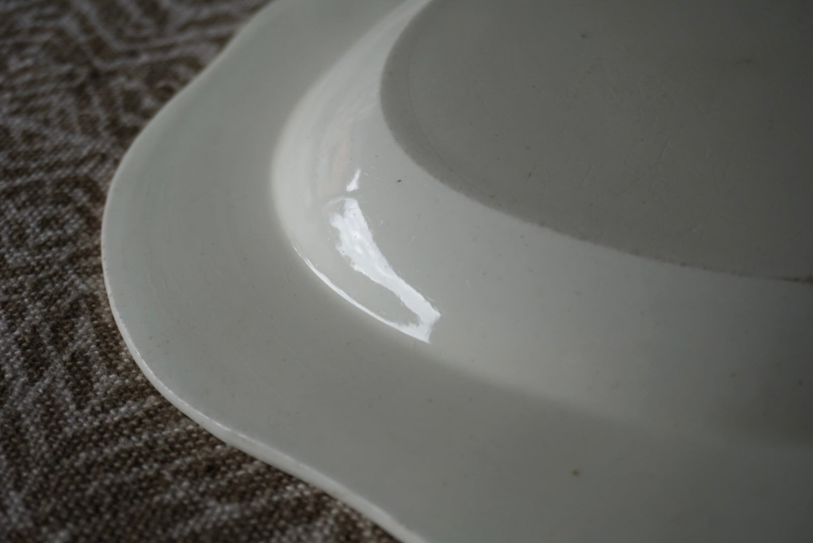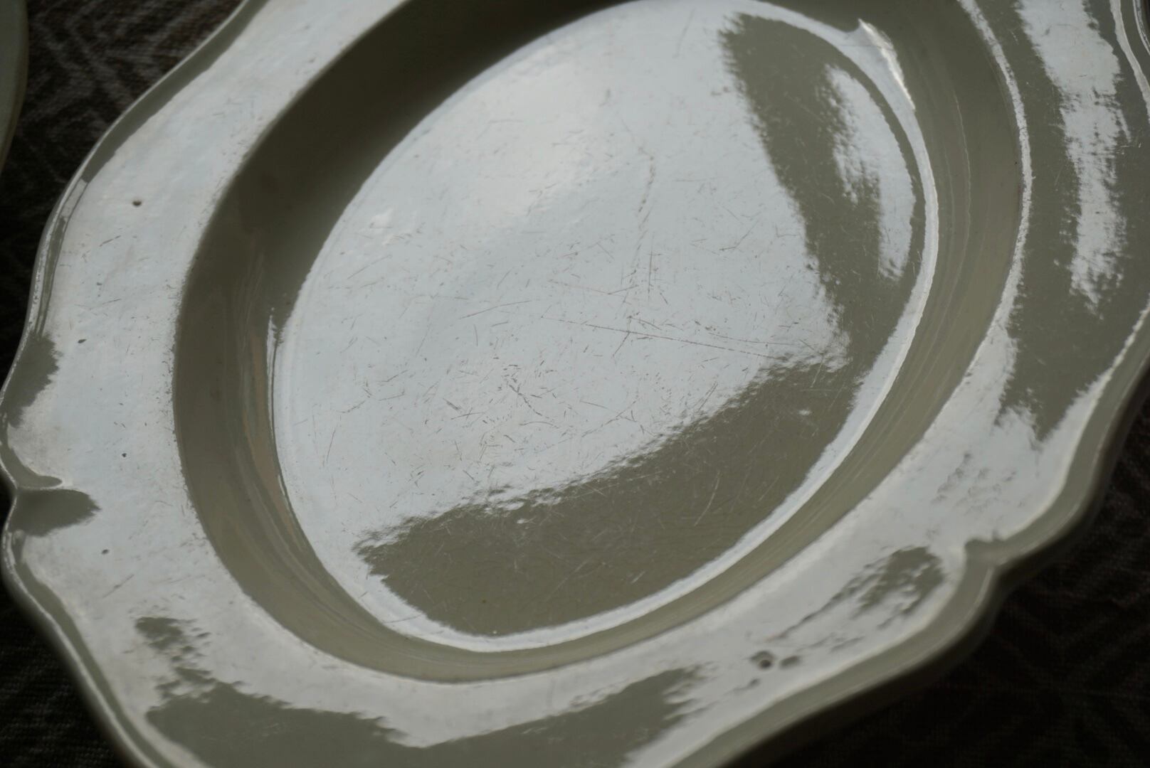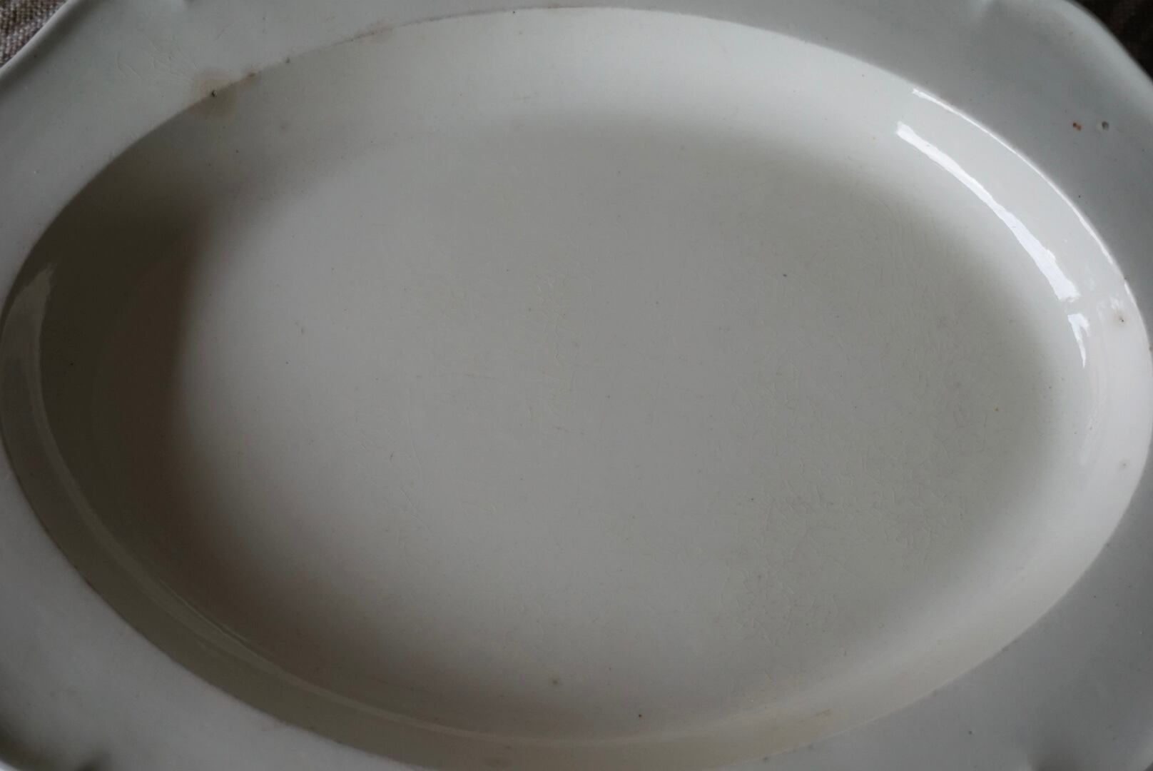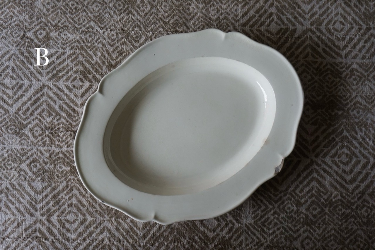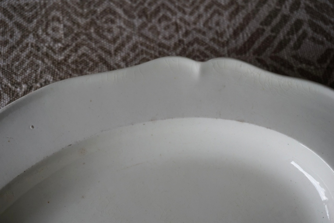 イギリスの方からお譲りいただいたクリームウェア/ファイアンスフィーヌの花リムオーバル皿です。刻印がないため断定はできかねますが、おそらくクリームウェアなのではないかと予想しています。この手の器は現代の日本人の食卓に馴染むサイズのものを見つけるのが難しいと感じていますが、こちらは大き過ぎず小さ過ぎない程よいサイズで、キャビネットに1枚あると心強いお品です。