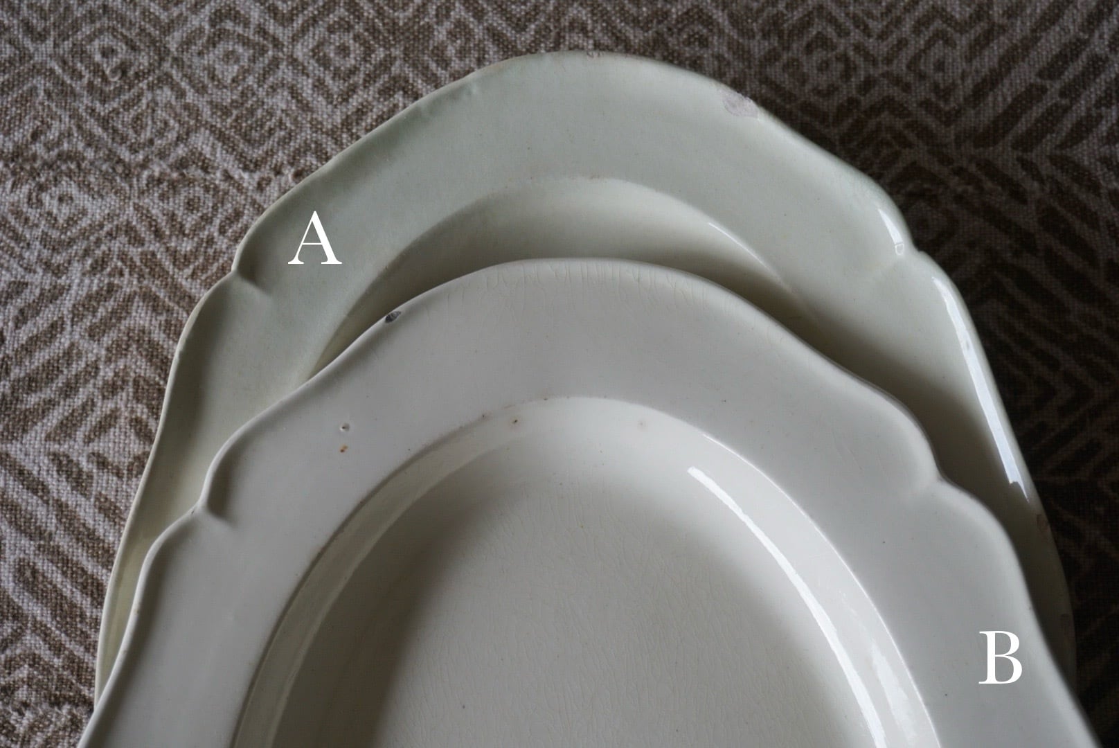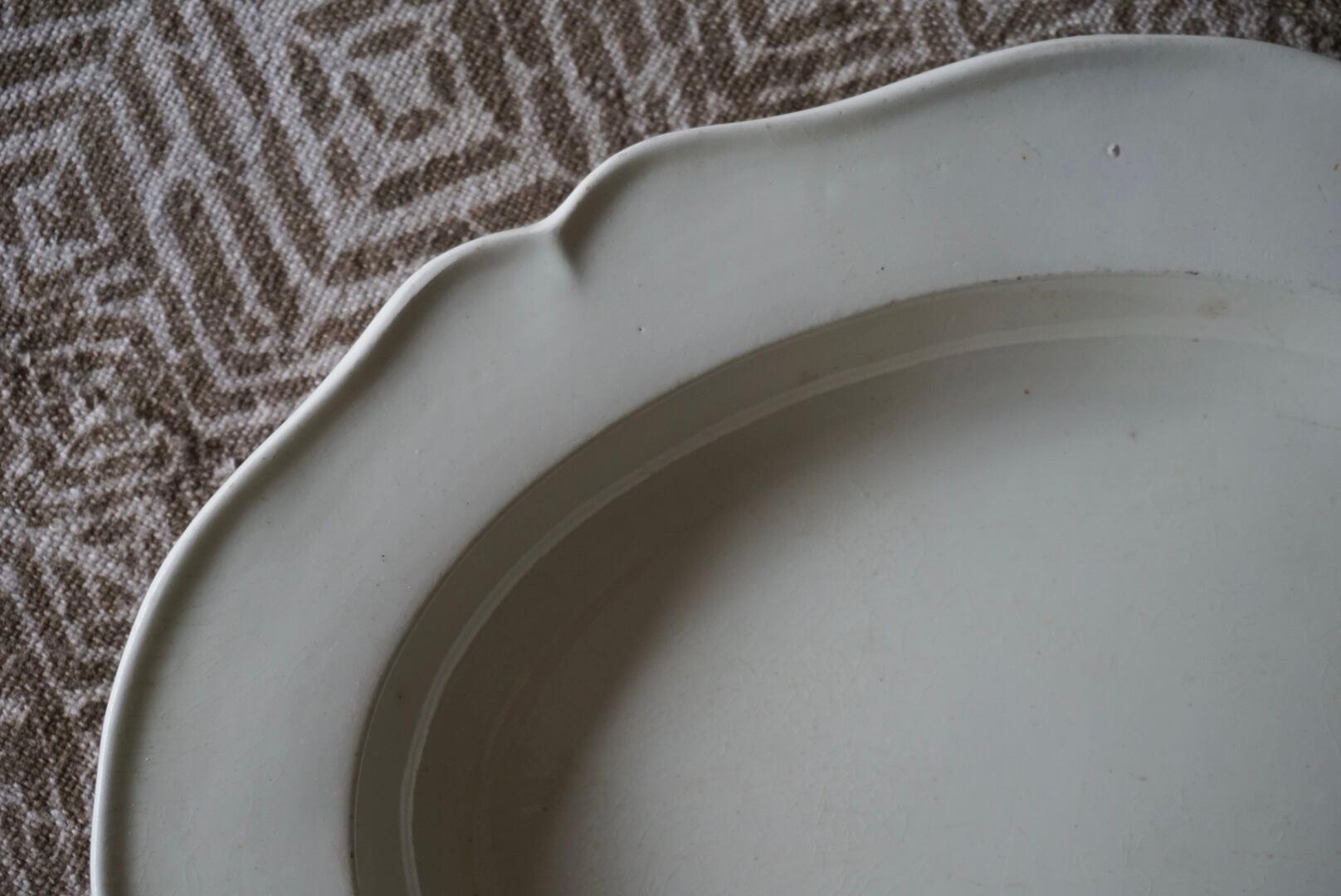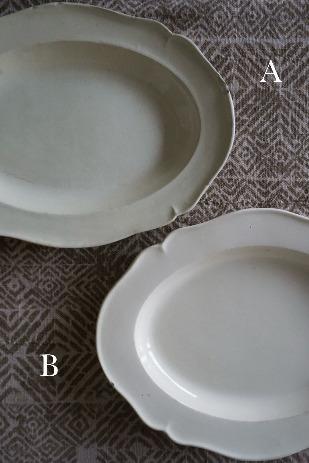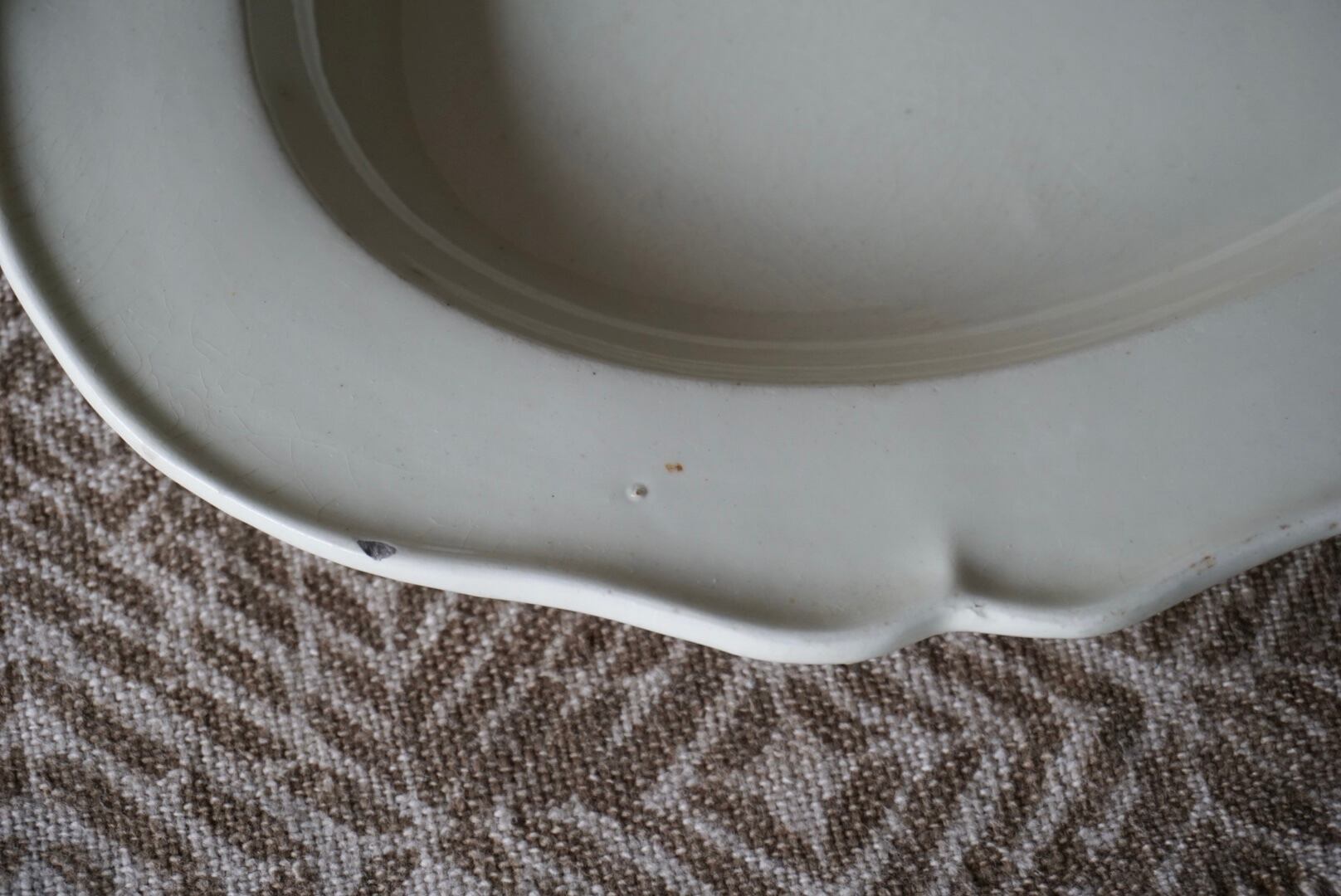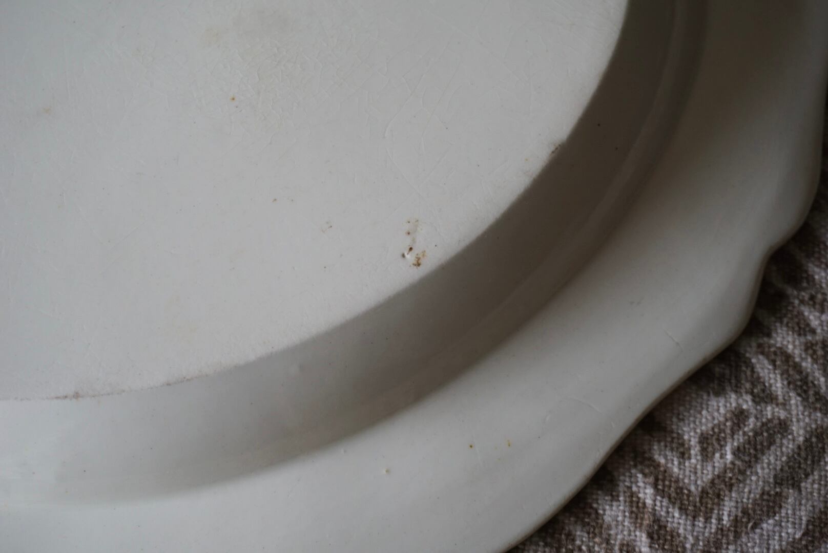 リムに欠けや小さなチップがございますので、お写真でご確認ください。ぐらつきがございますのでリネンなどの柔らかい布の上でのご使用をお勧めします。一緒に出品しているAに比べると素地が白く、釉薬の虹色の反射も少ないですが、エッジが効いていて陰影がよりくっきりしています。