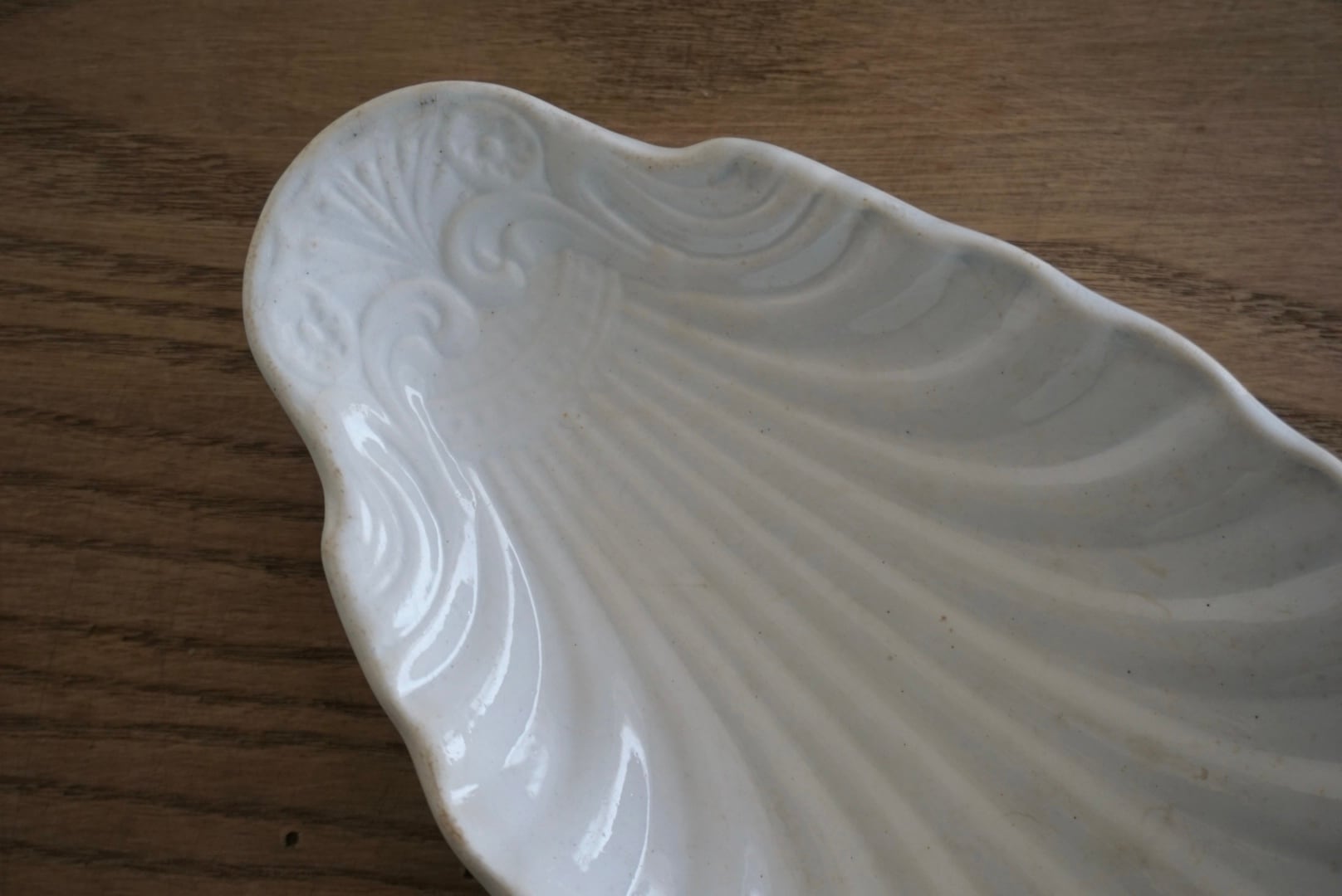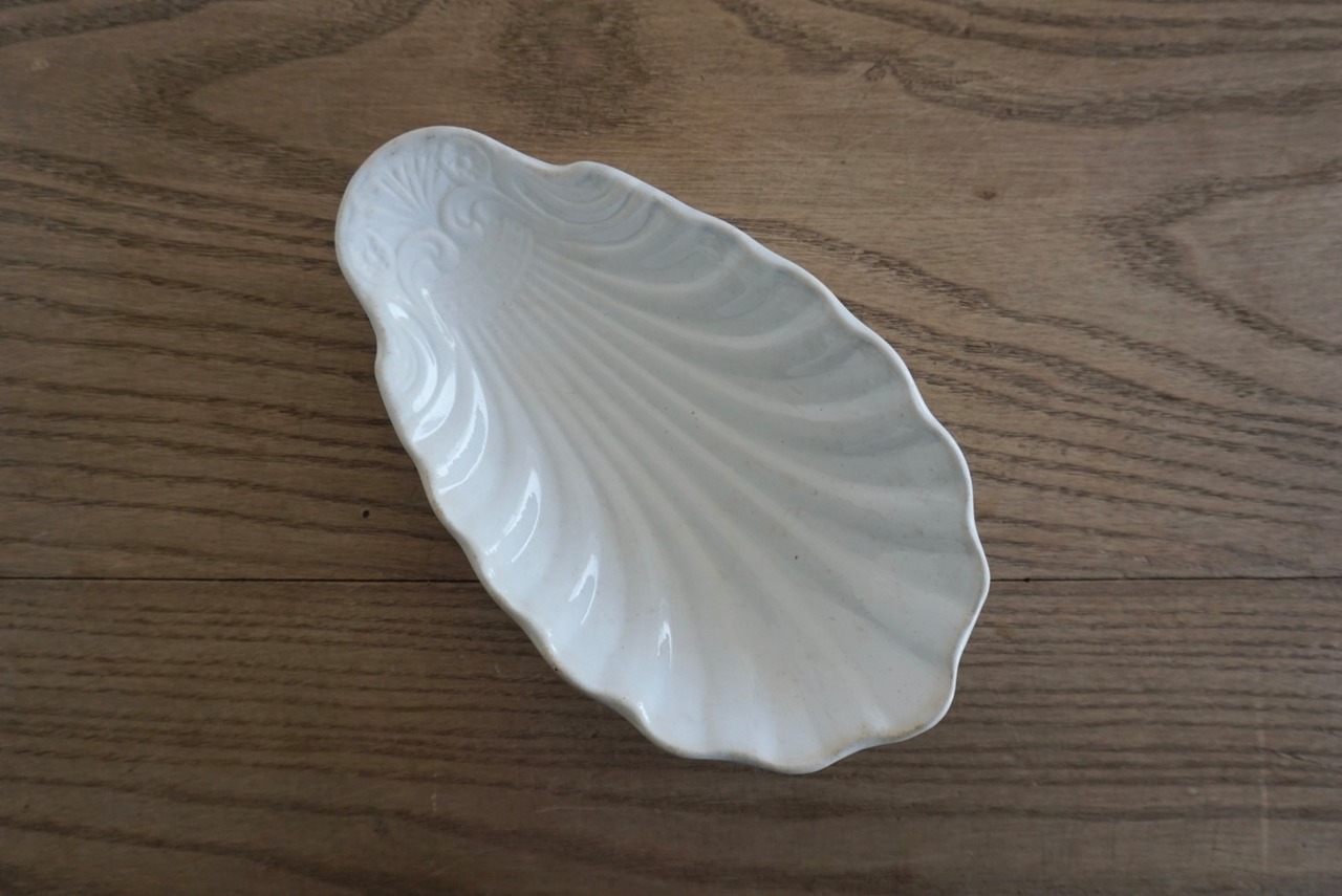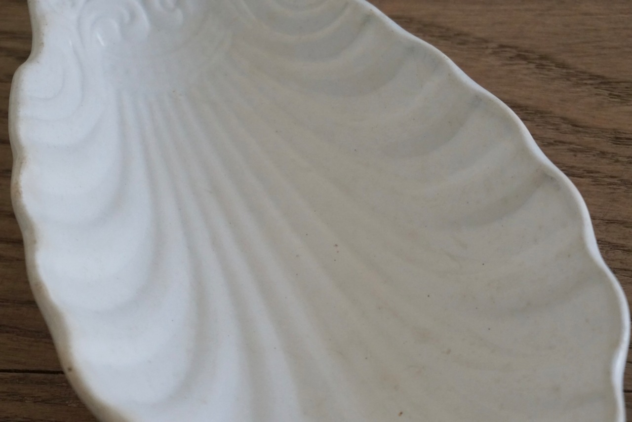 パリ近郊 Creil et Montereau窯より、優美な曲線のレリーフが美しいコキーユ(貝殻)モチーフのラヴィエです。程よく枯れてアンティークならではの表情で、アクセサリートレーなどのインテリアとしても楽しめます。