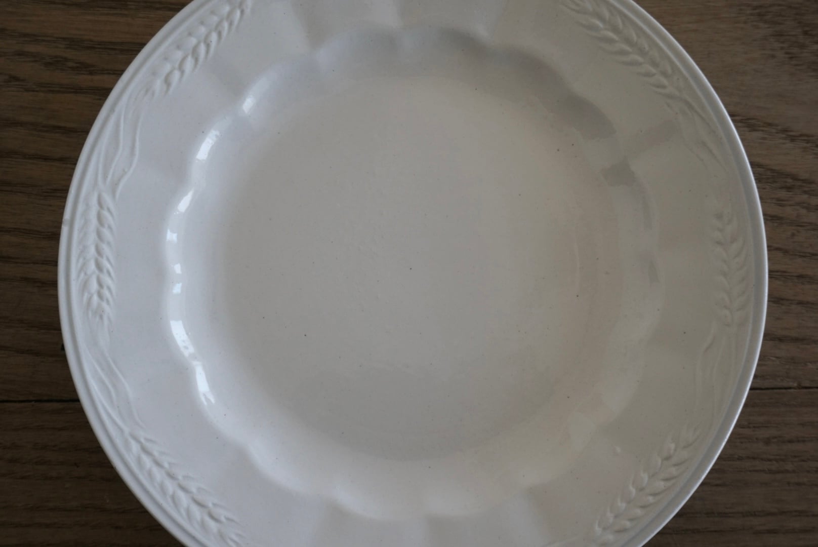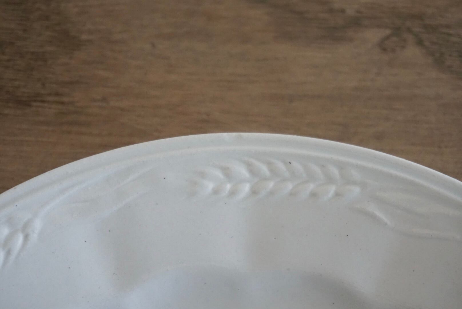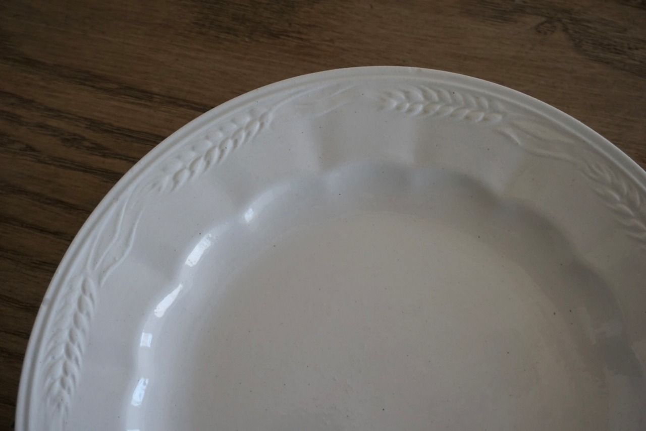 ロレーヌ地方 Digoin&Sarreguemines窯より、麦のレリーフが素朴な印象のデザート皿です。一見、特別なことはないシンプルなデザインに見えますが、見込みの縁が花リムになっているところが少し小さめのサイズ感も相まって可愛いポイントだと思います。