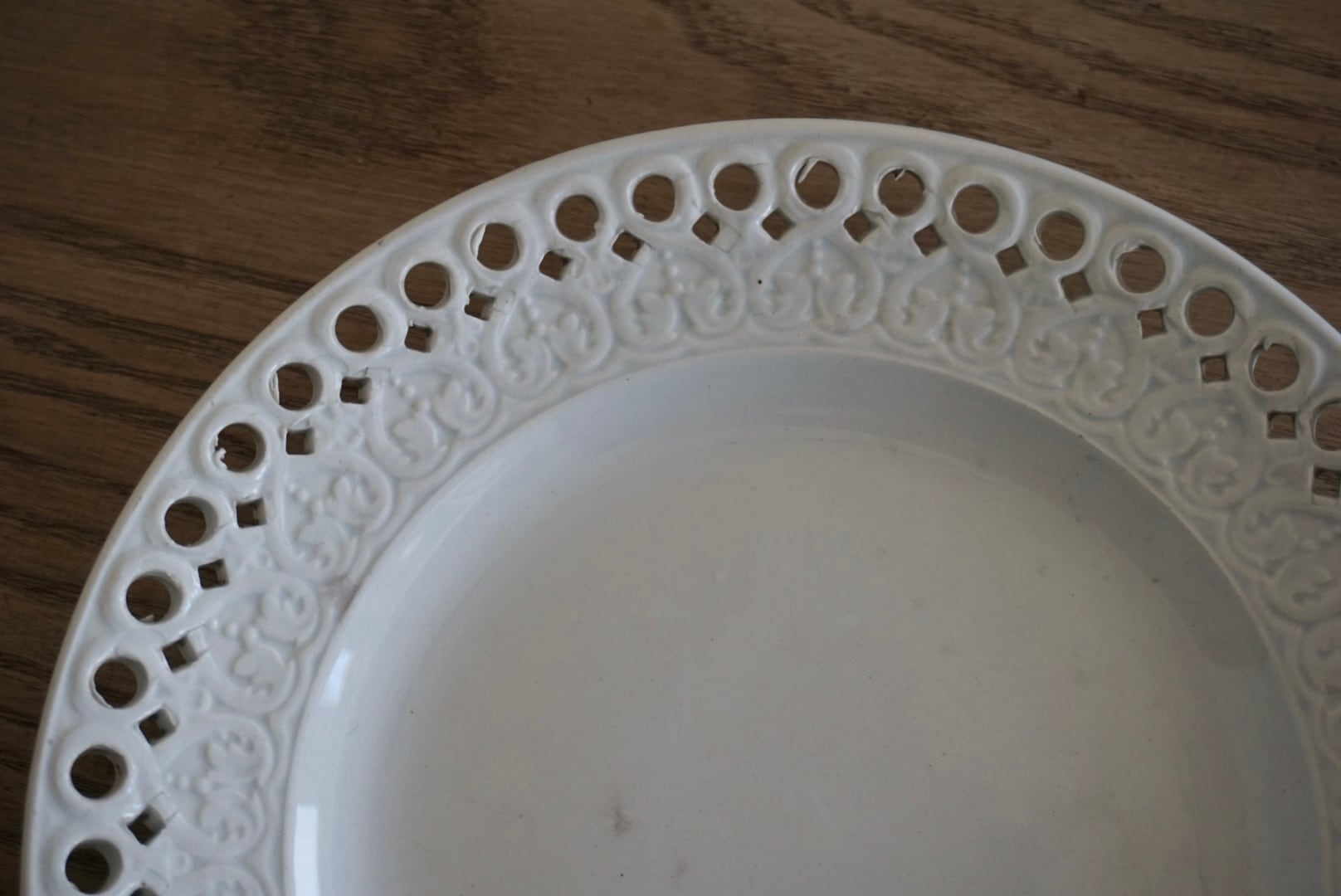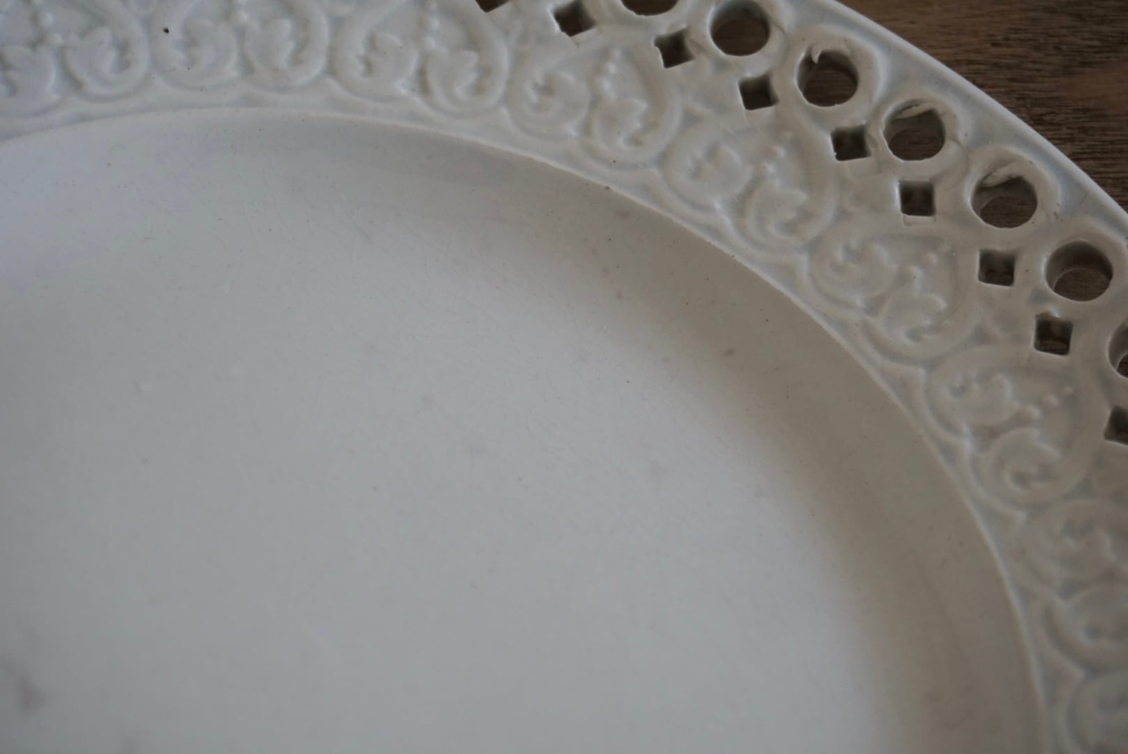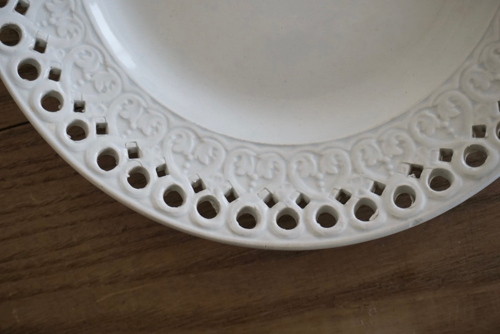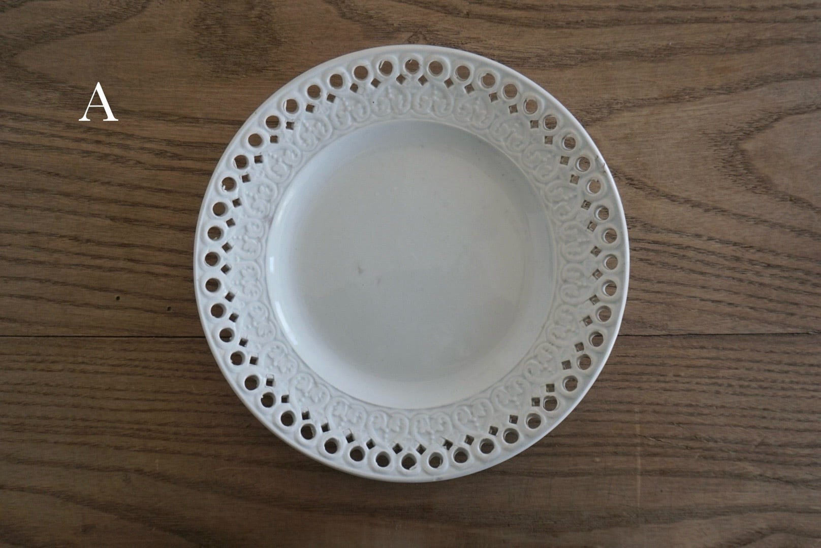 パリ近郊 Creil et Montereauより、エレガントなレリーフに透かし彫りが良いアクセントになったデザートプレートです。パリという地でいくつもの時代を見てきたクレイユエモントローらしさを感じられる素敵な1枚です。デザートサイズの中でも大きめなので、取り皿として使うのもお勧めです。