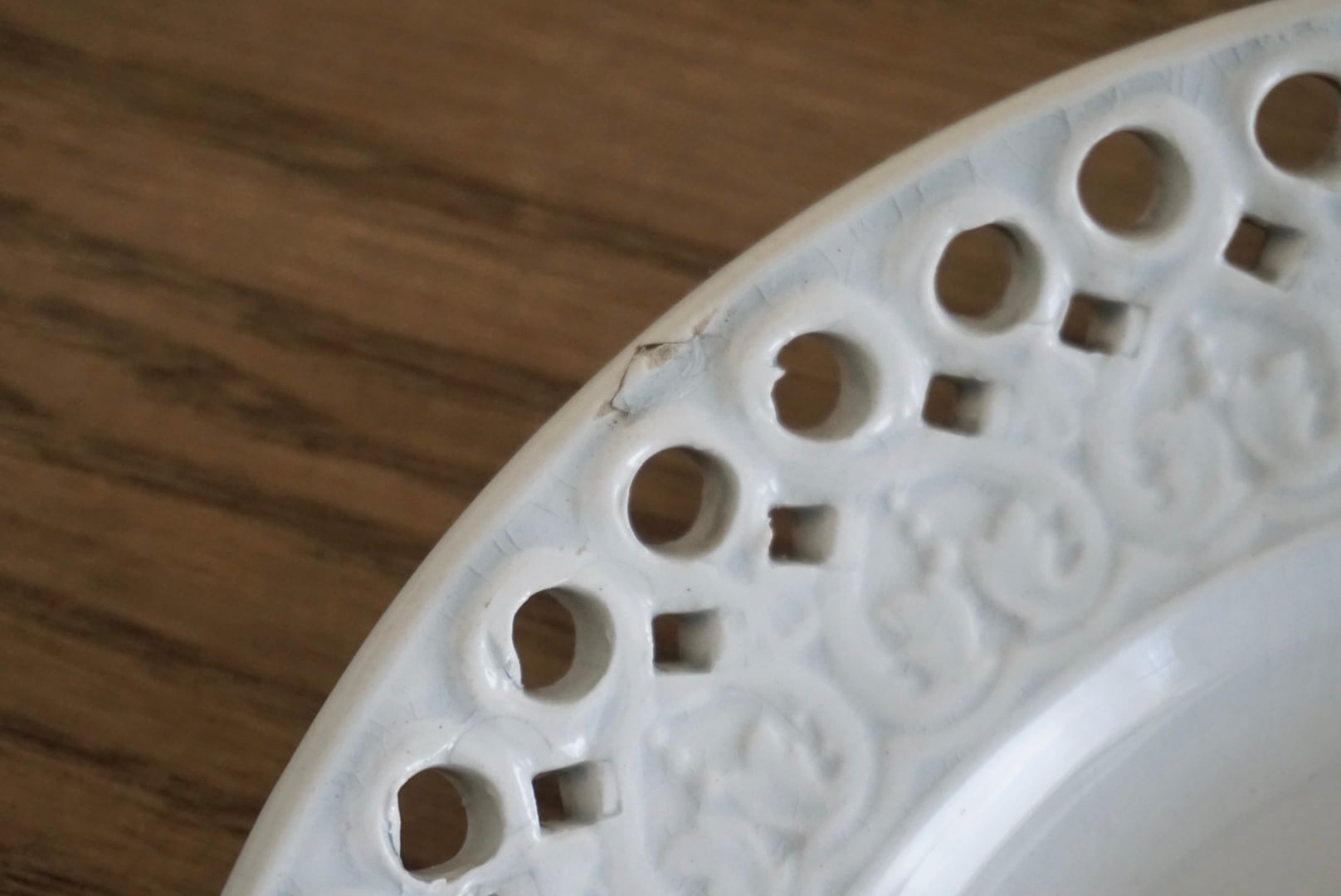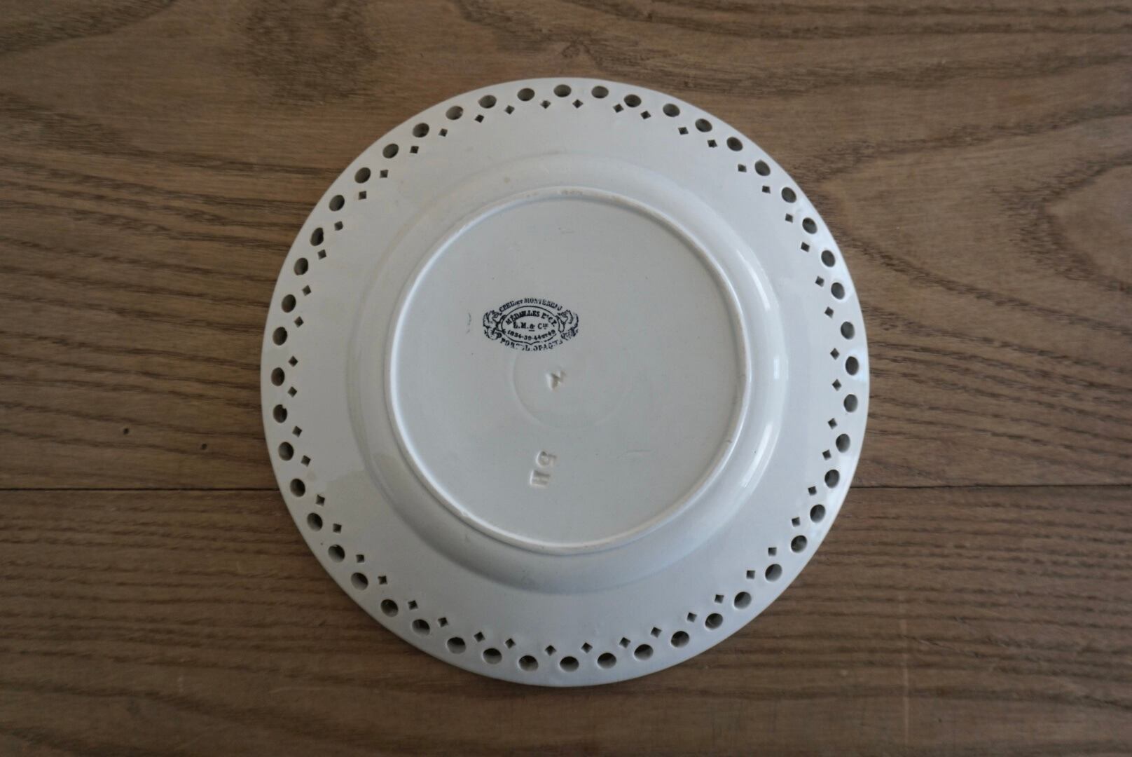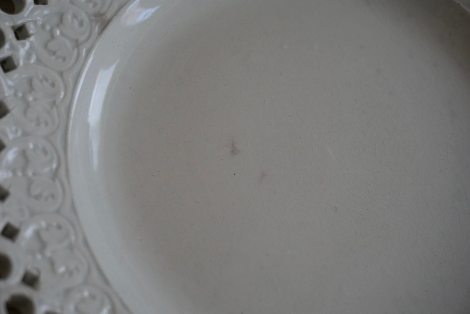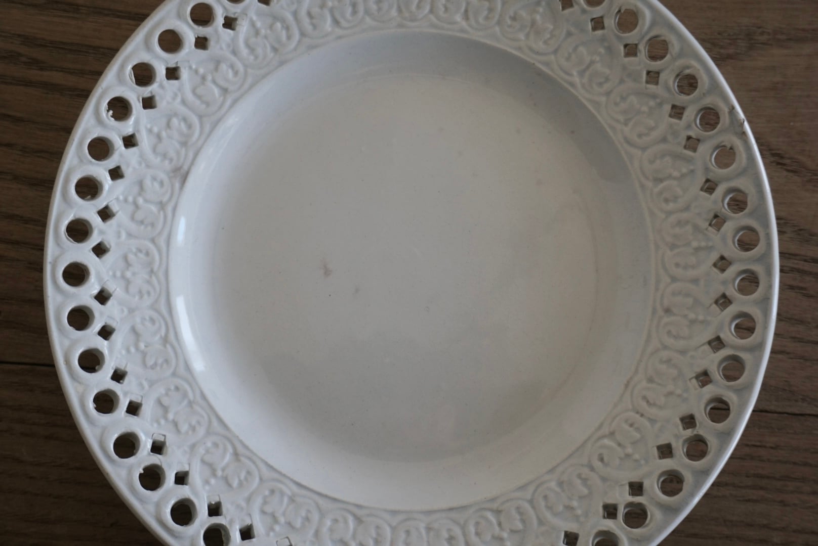 パリ近郊 Creil et Montereauより、エレガントなレリーフに透かし彫りが良いアクセントになったデザートプレートです。パリという地でいくつもの時代を見てきたクレイユエモントローらしさを感じられる素敵な1枚です。デザートサイズの中でも大きめなので、取り皿として使うのもお勧めです。