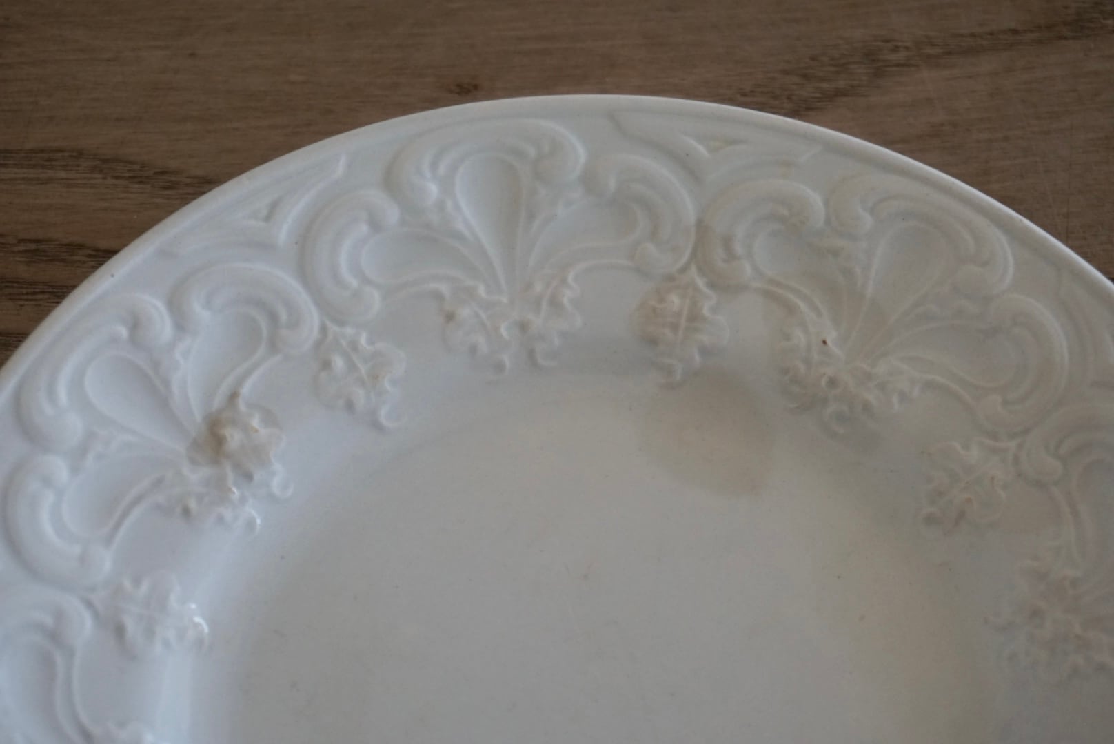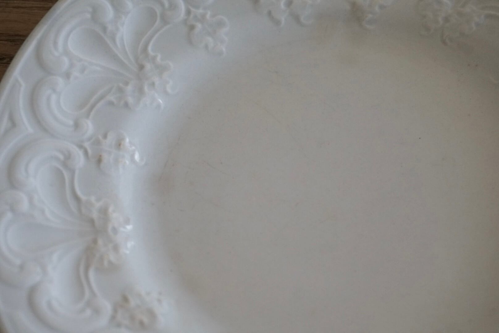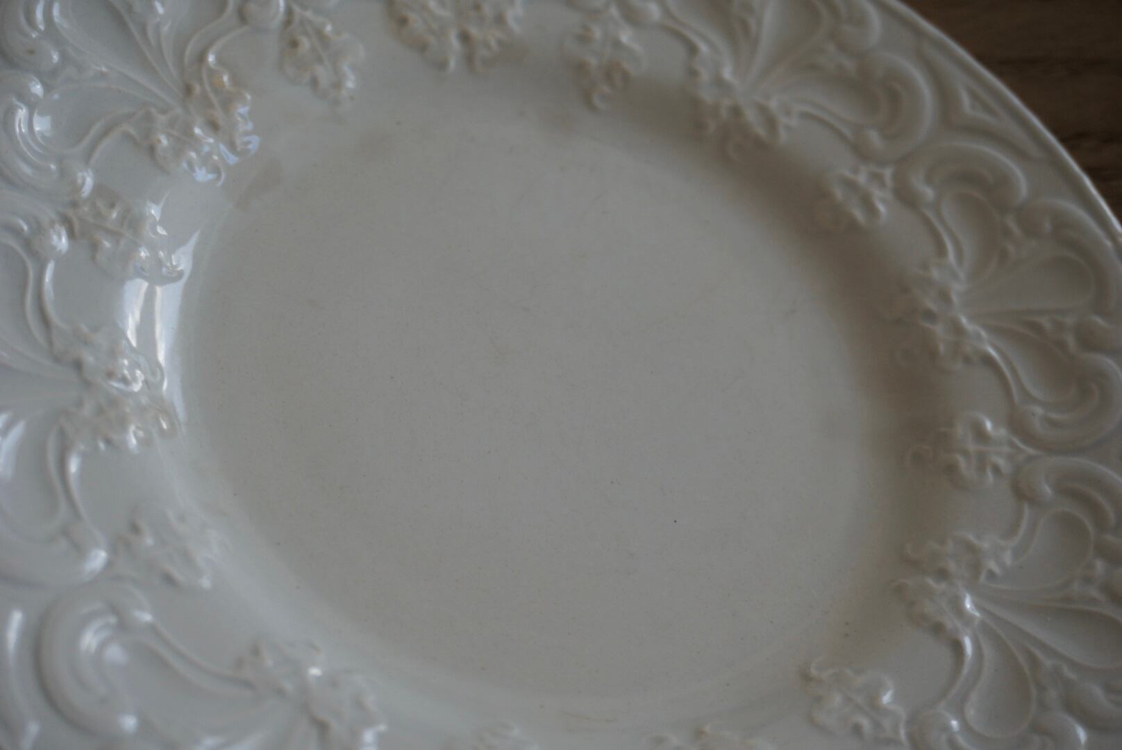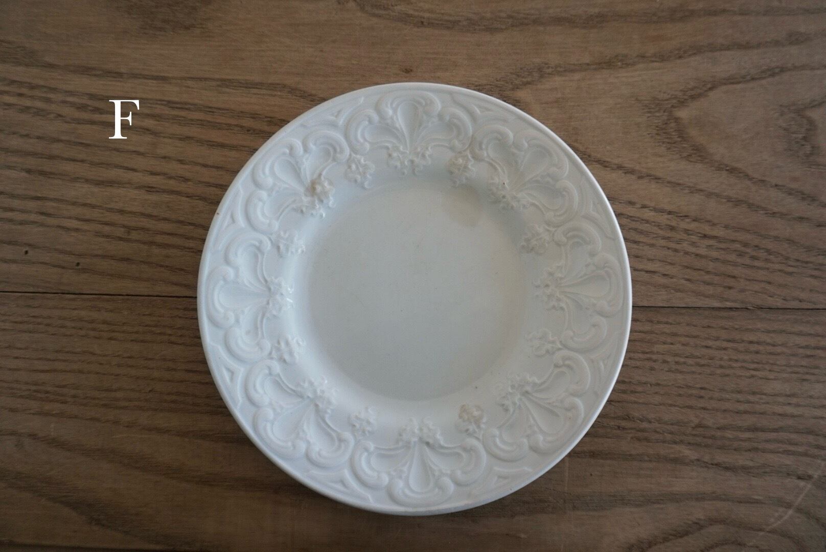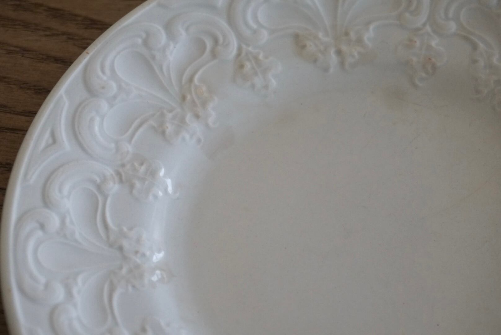 パリ近郊 Creil et Montereau窯より、大胆に入ったレリーフが豪華なデザートプレートです。リムの幅が広く見込みが狭い作りで、上に載せるものが映えるので特別な食卓のテーブルコーディネートにお勧めです。