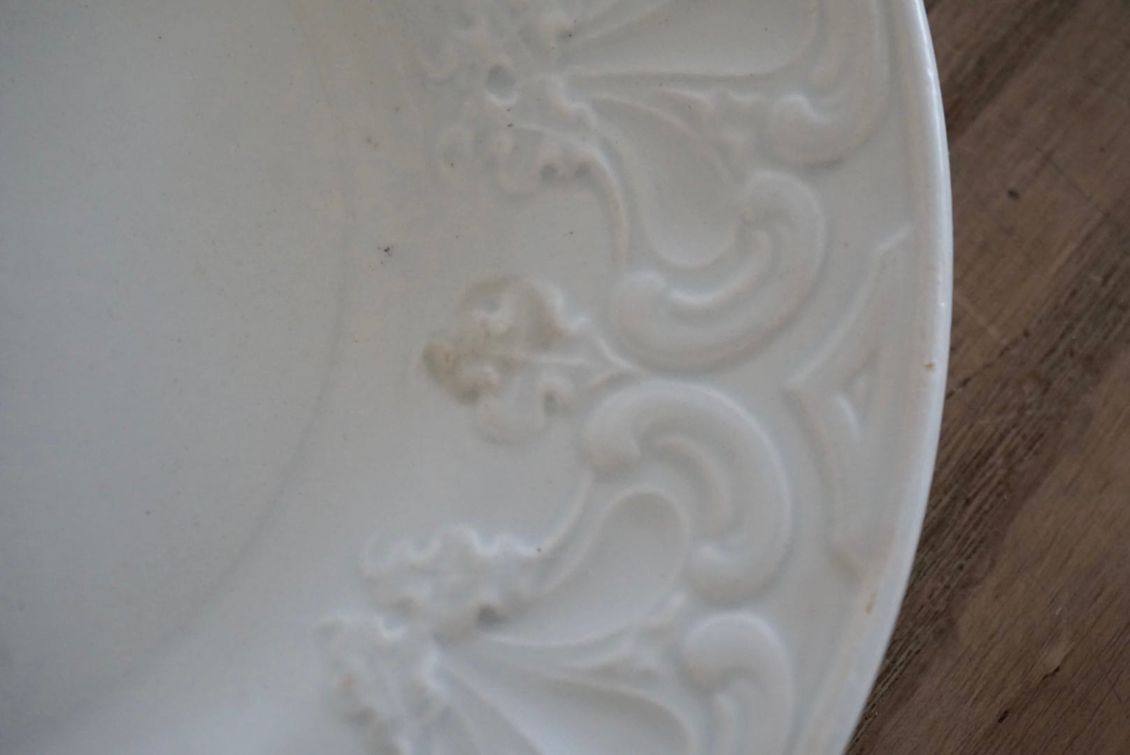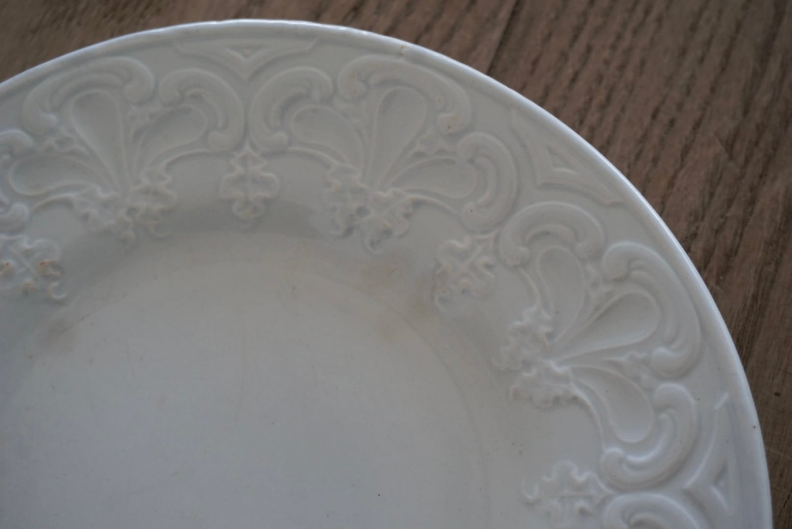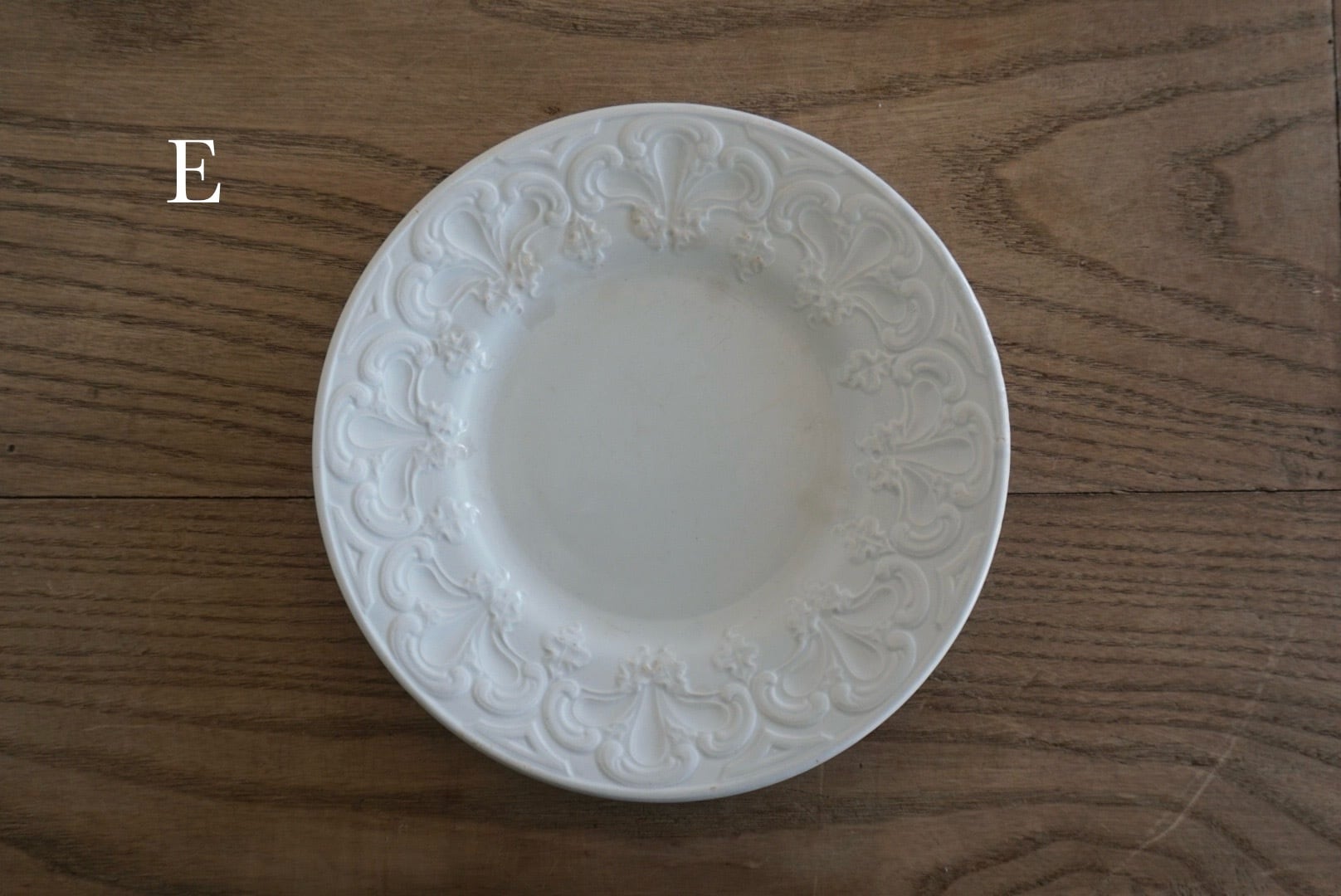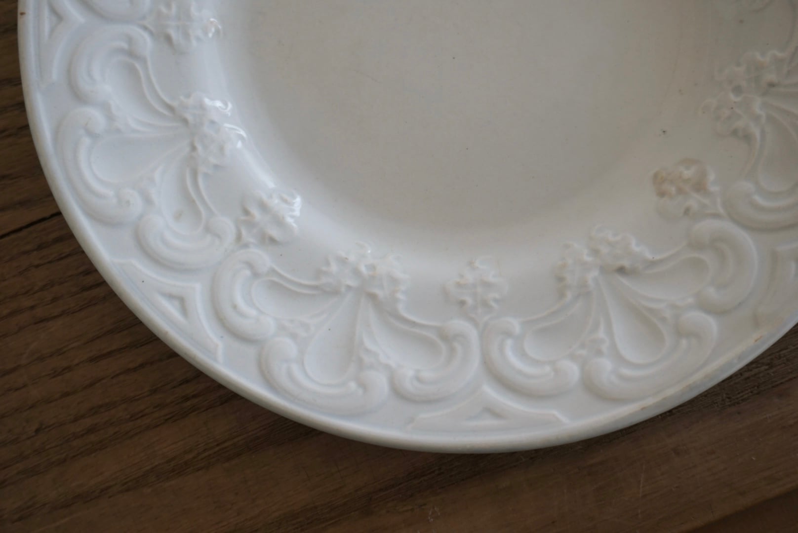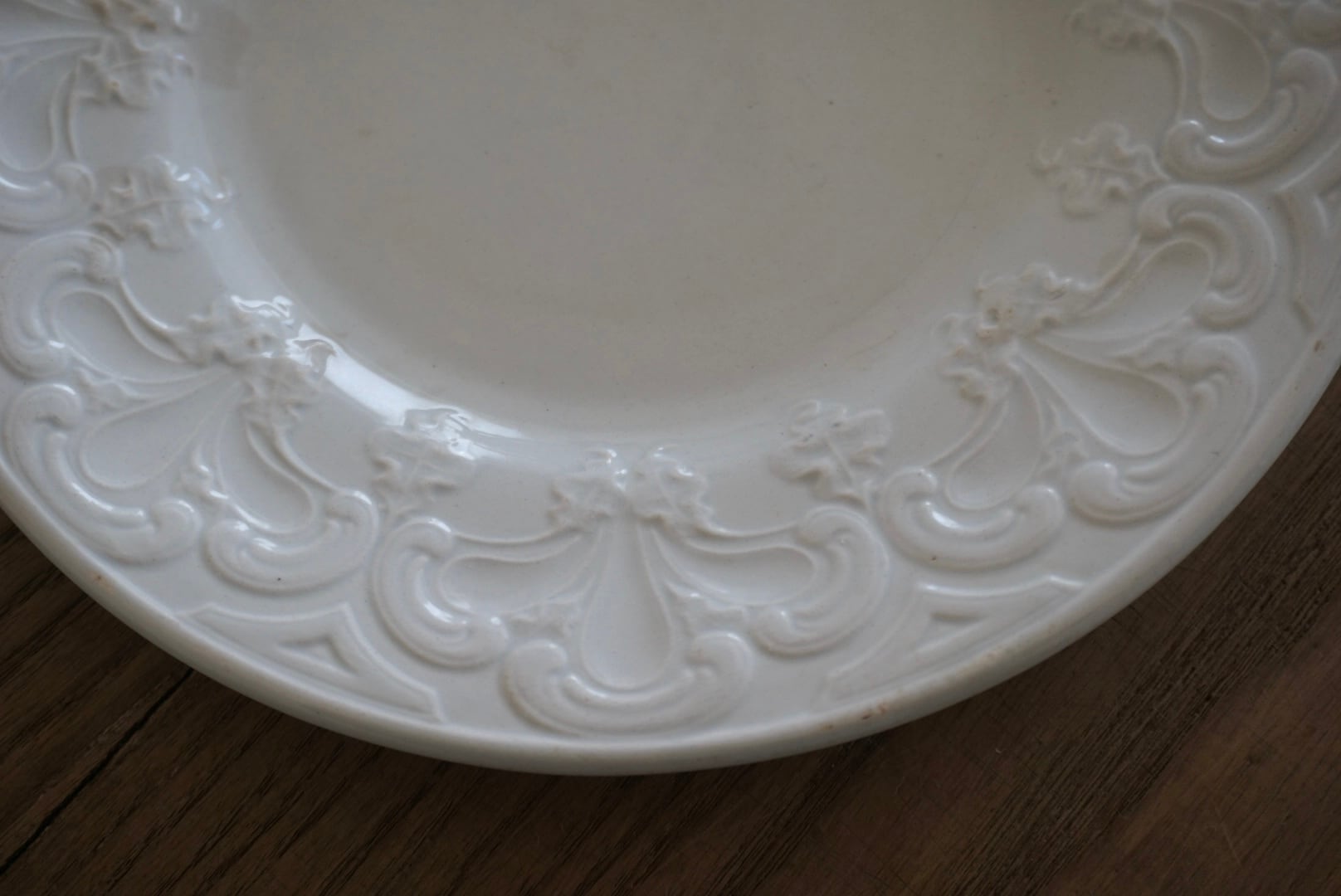 パリ近郊 Creil et Montereau窯より、大胆に入ったレリーフが豪華なデザートプレートです。リムの幅が広く見込みが狭い作りで、上に載せるものが映えるので特別な食卓のテーブルコーディネートにお勧めです。