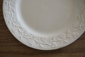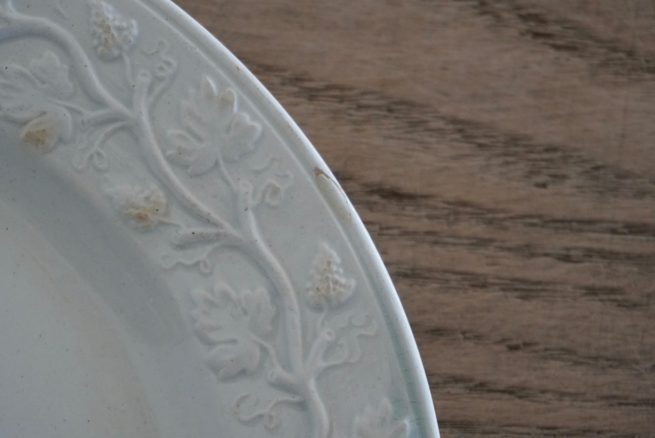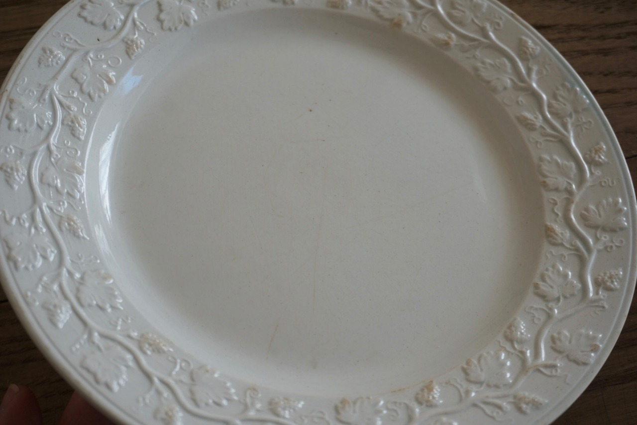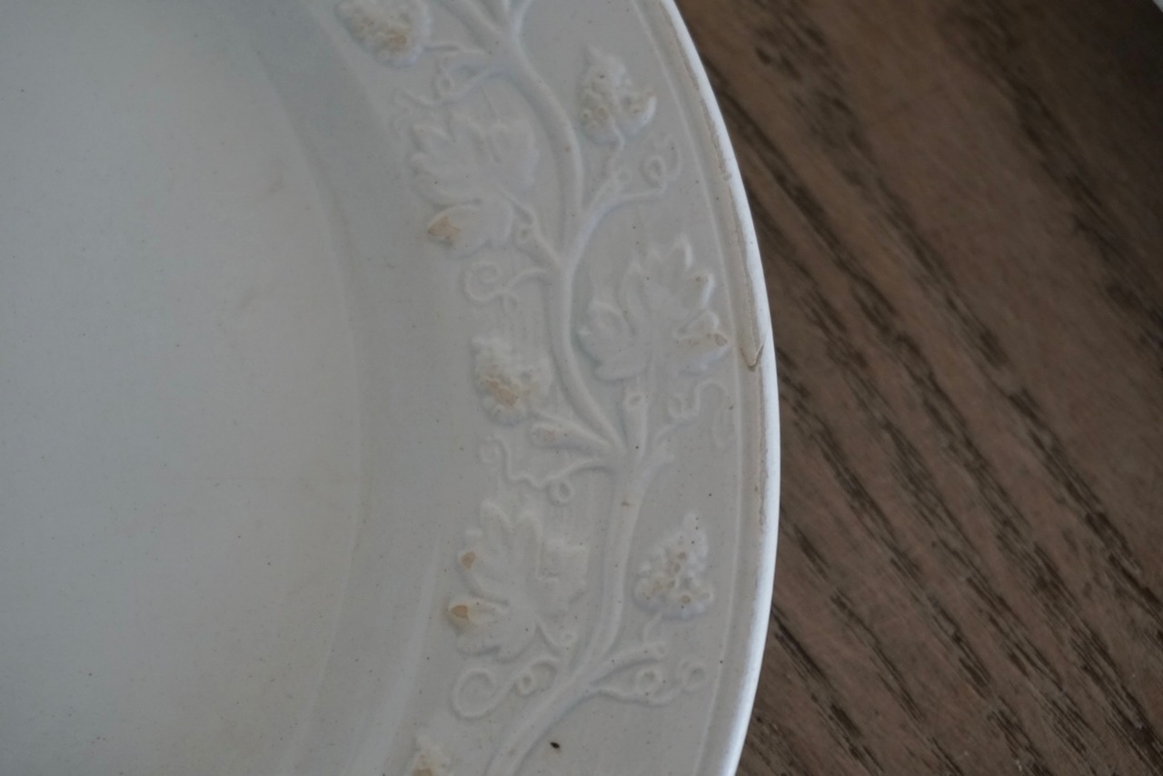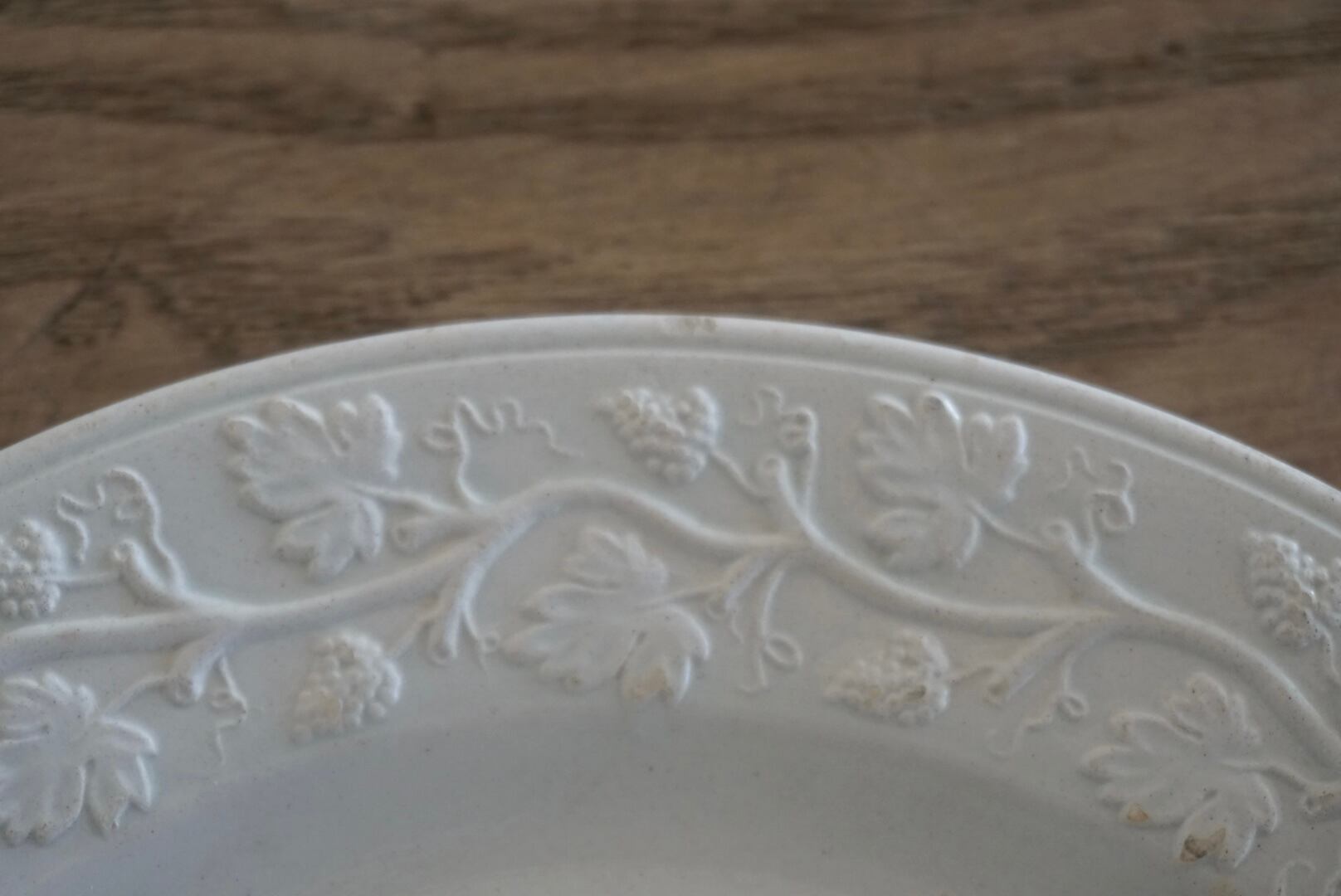 繊細な葡萄のレリーフが施されたファイアンスフィーヌのデザートプレートです。レリーフ皿は数あれど、葡萄モチーフのものに出会う機会はそう多くありません。また、こちらはテールドフェールからファイアンスフィーヌに移り変わる時期に作陶されたと思われ、極めてファイアンスフィーヌに近い質感をしています。窯元の特定はできていませんが、とても希少で素晴らしい逸品です。