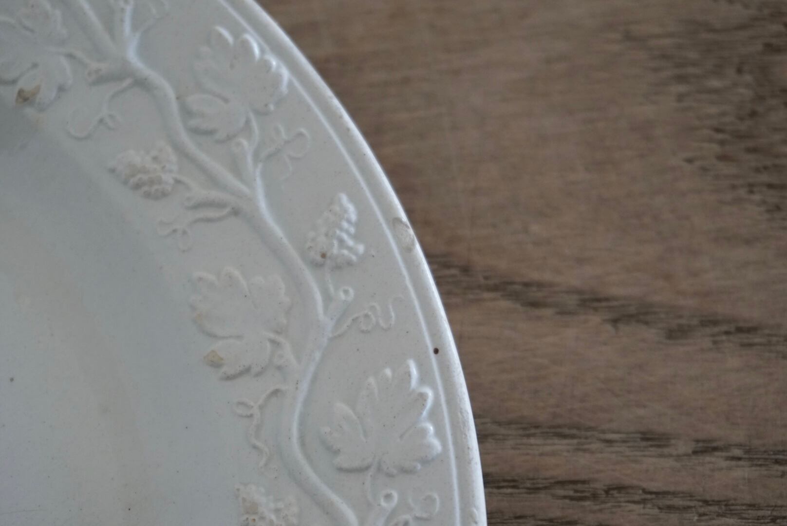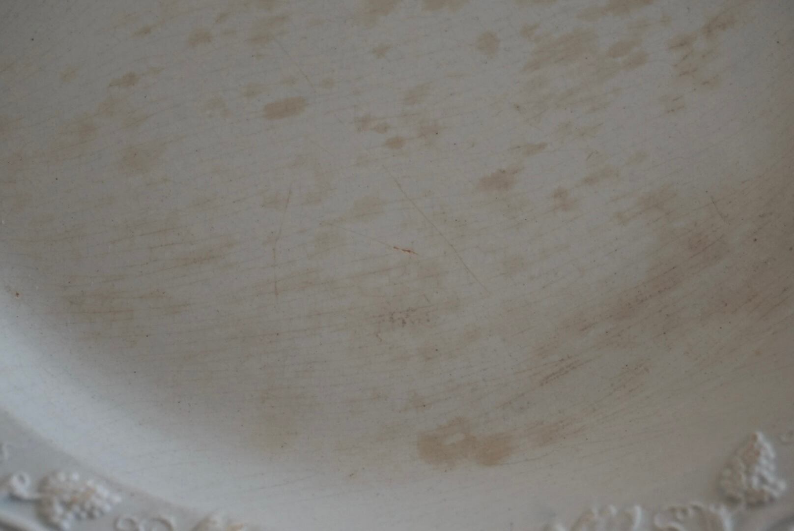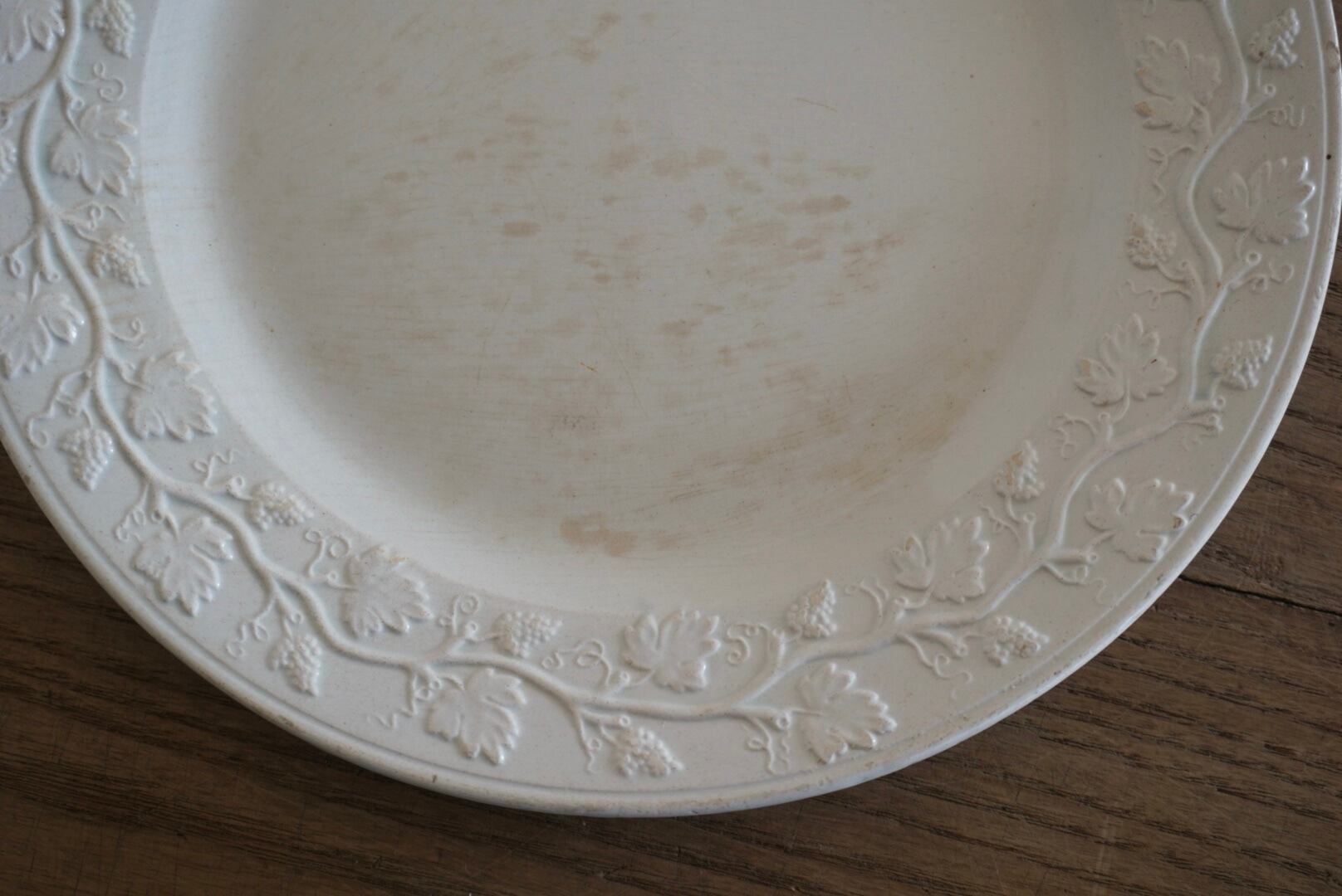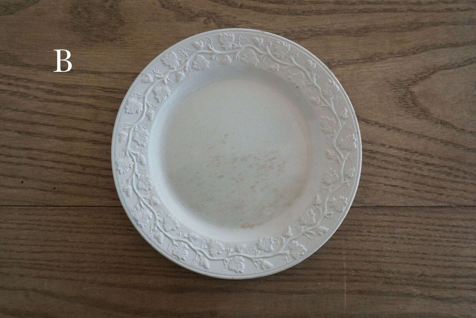 繊細な葡萄のレリーフが施されたファイアンスフィーヌのデザートプレートです。レリーフ皿は数あれど、葡萄モチーフのものに出会う機会はそう多くありません。また、こちらはテールドフェールからファイアンスフィーヌに移り変わる時期に作陶されたと思われ、極めてファイアンスフィーヌに近い質感をしています。窯元の特定はできていませんが、とても希少で素晴らしい逸品です。