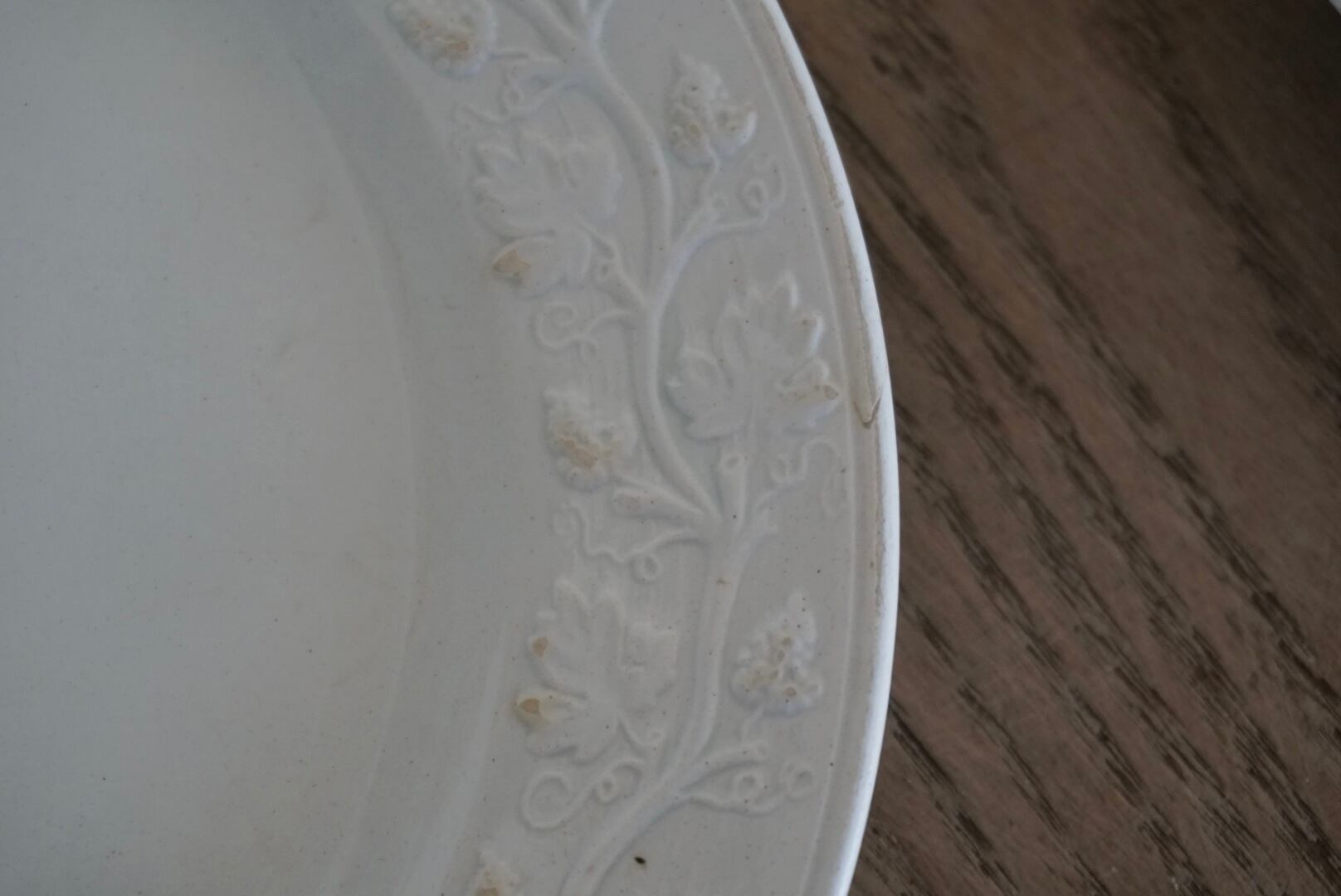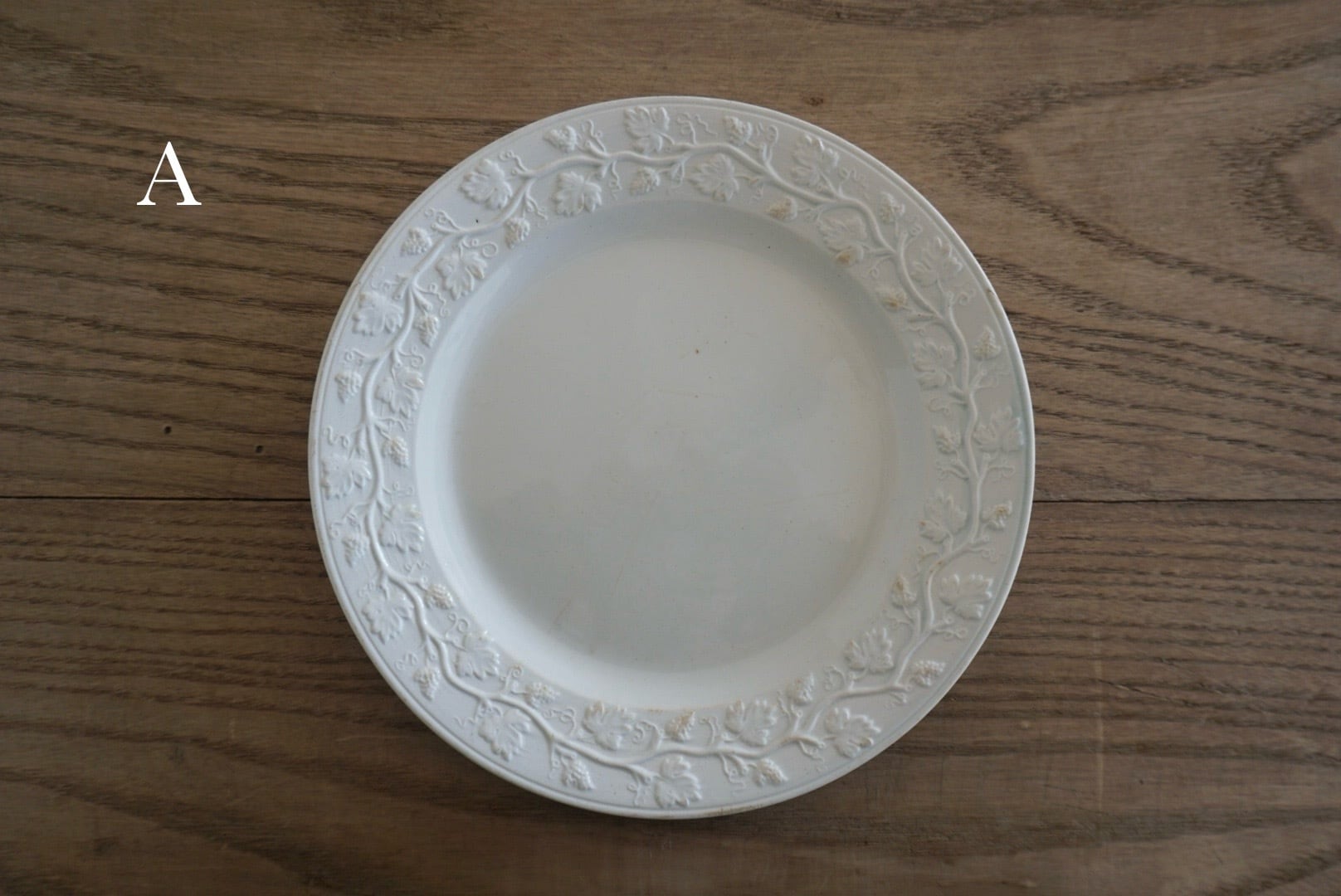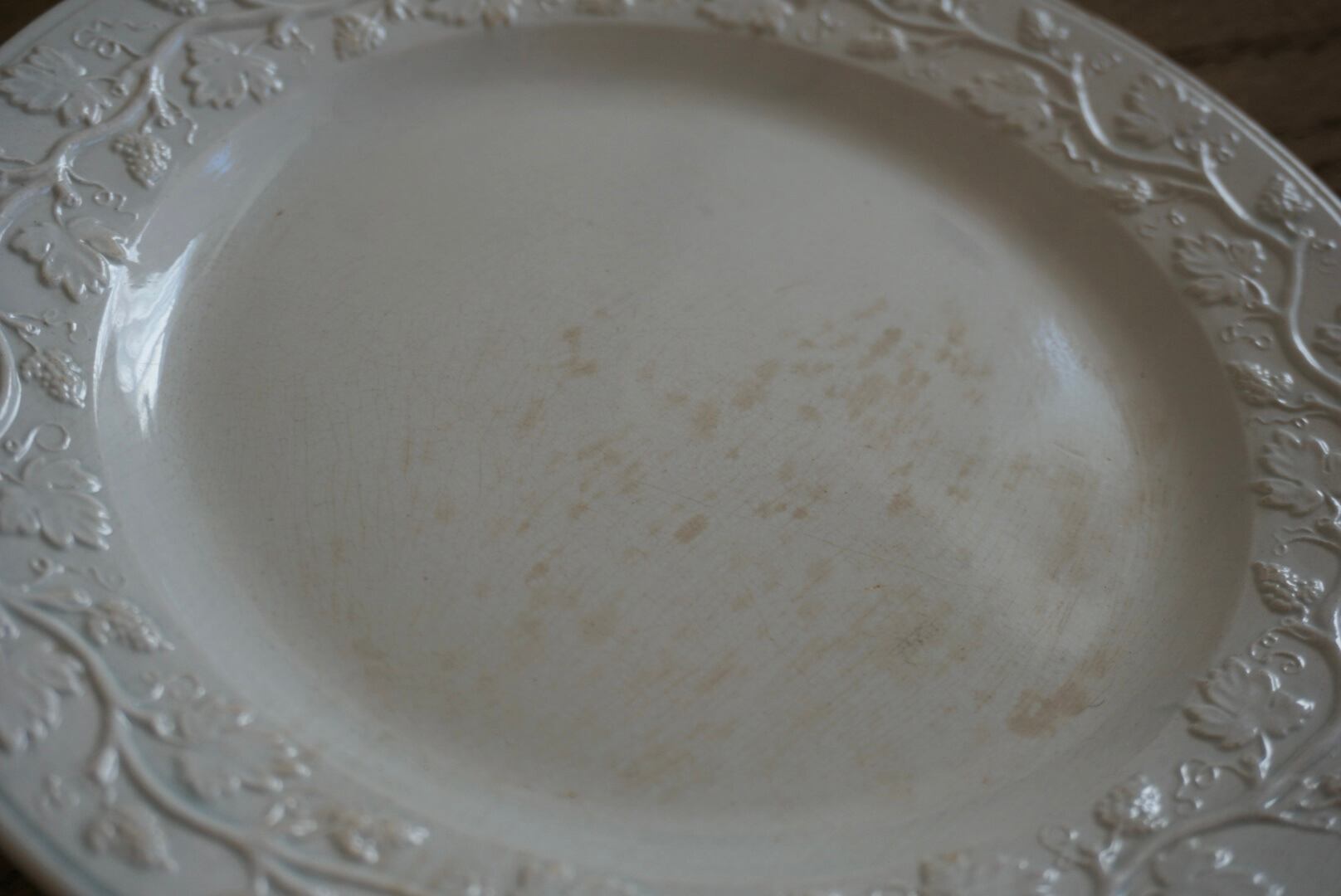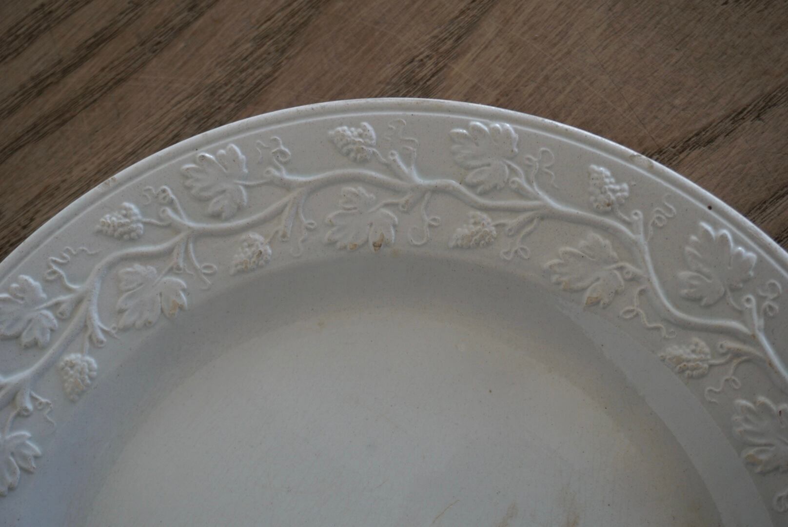 繊細な葡萄のレリーフが施されたファイアンスフィーヌのデザートプレートです。レリーフ皿は数あれど、葡萄モチーフのものに出会う機会はそう多くありません。また、こちらはテールドフェールからファイアンスフィーヌに移り変わる時期に作陶されたと思われ、極めてファイアンスフィーヌに近い質感をしています。窯元の特定はできていませんが、とても希少で素晴らしい逸品です。