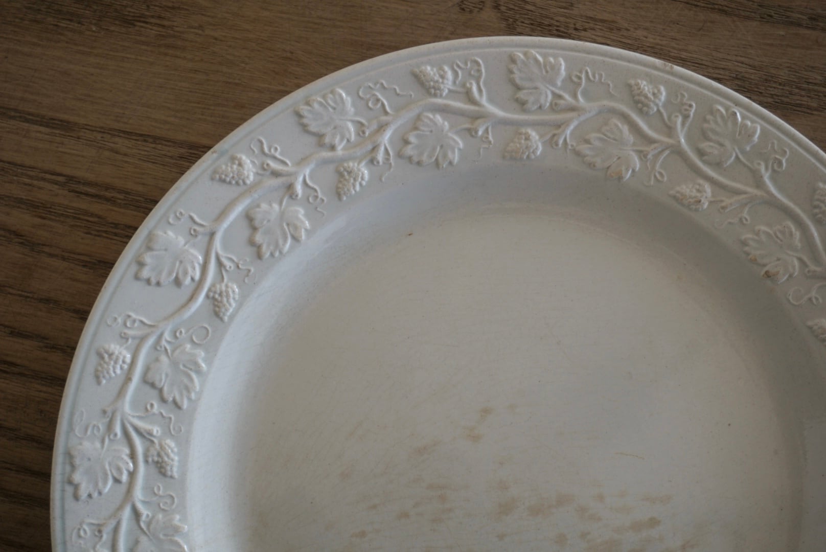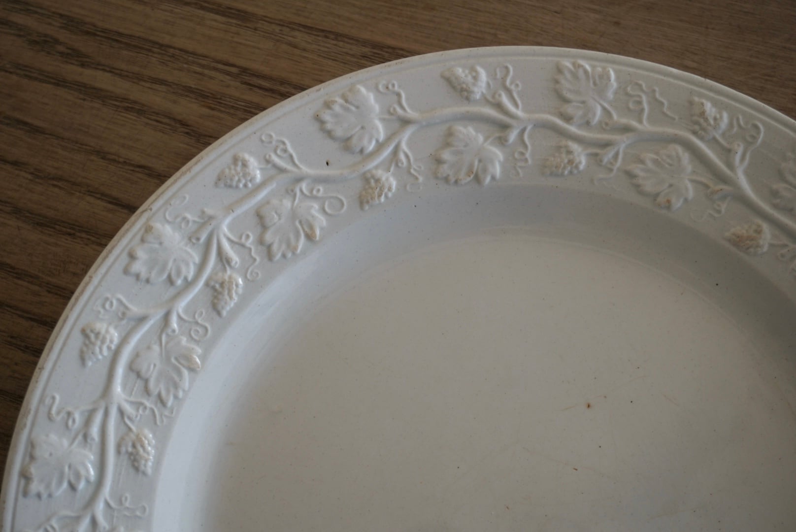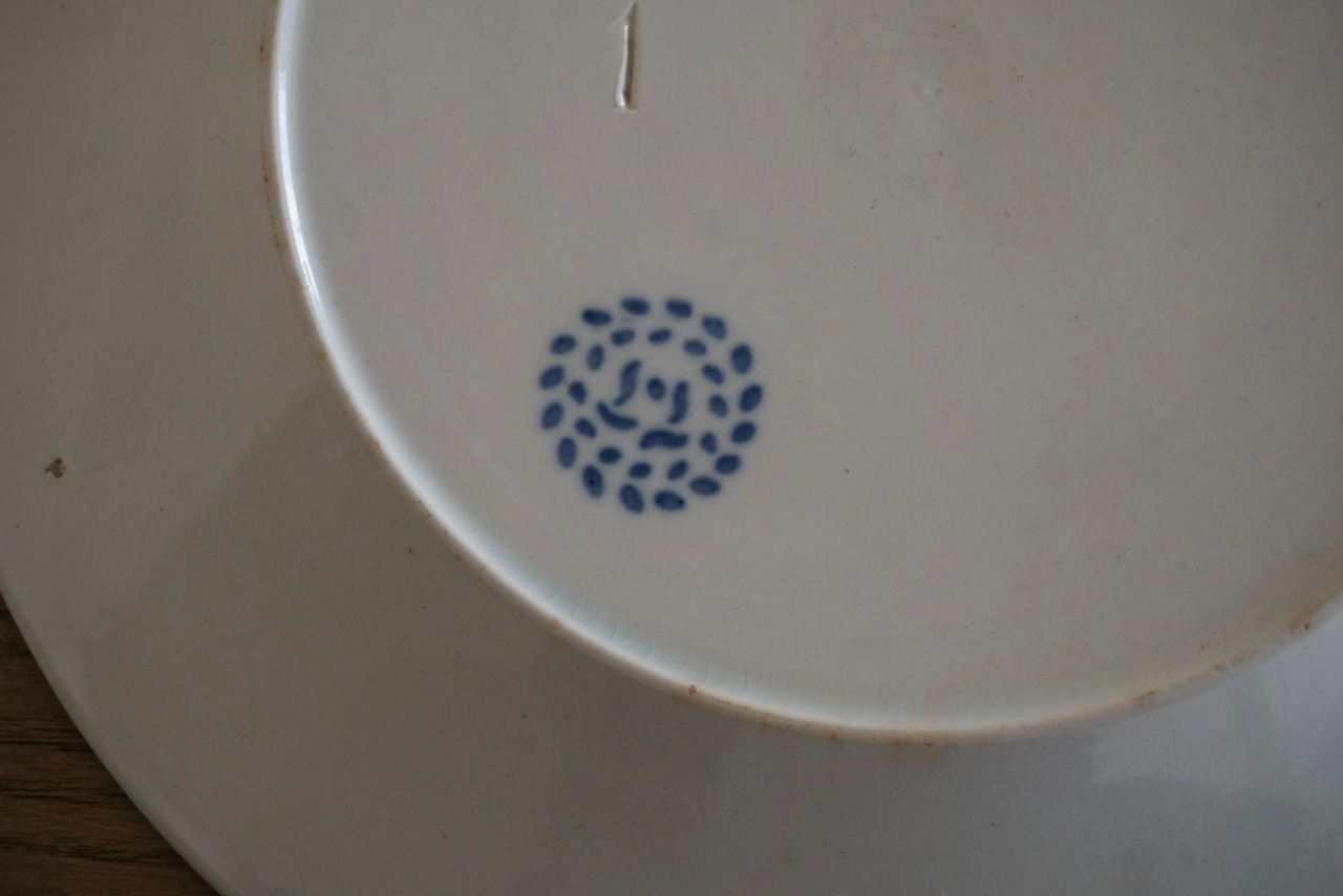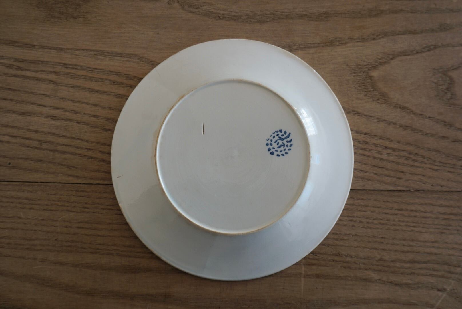 繊細な葡萄のレリーフが施されたファイアンスフィーヌのデザートプレートです。レリーフ皿は数あれど、葡萄モチーフのものに出会う機会はそう多くありません。また、こちらはテールドフェールからファイアンスフィーヌに移り変わる時期に作陶されたと思われ、極めてファイアンスフィーヌに近い質感をしています。窯元の特定はできていませんが、とても希少で素晴らしい逸品です。