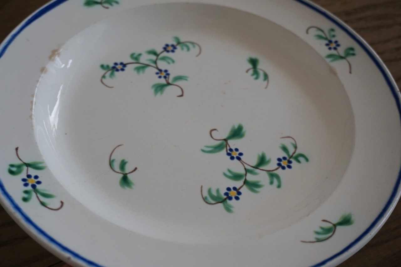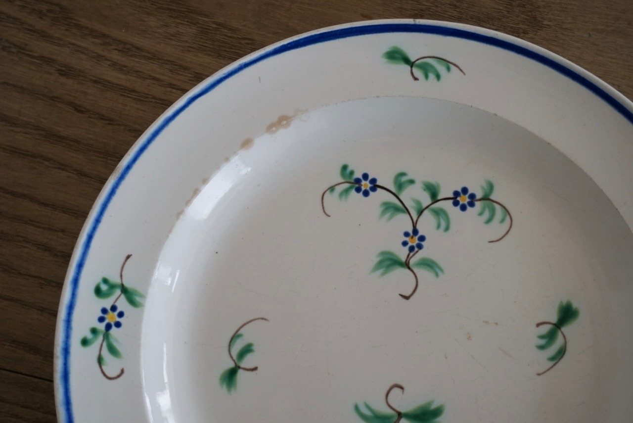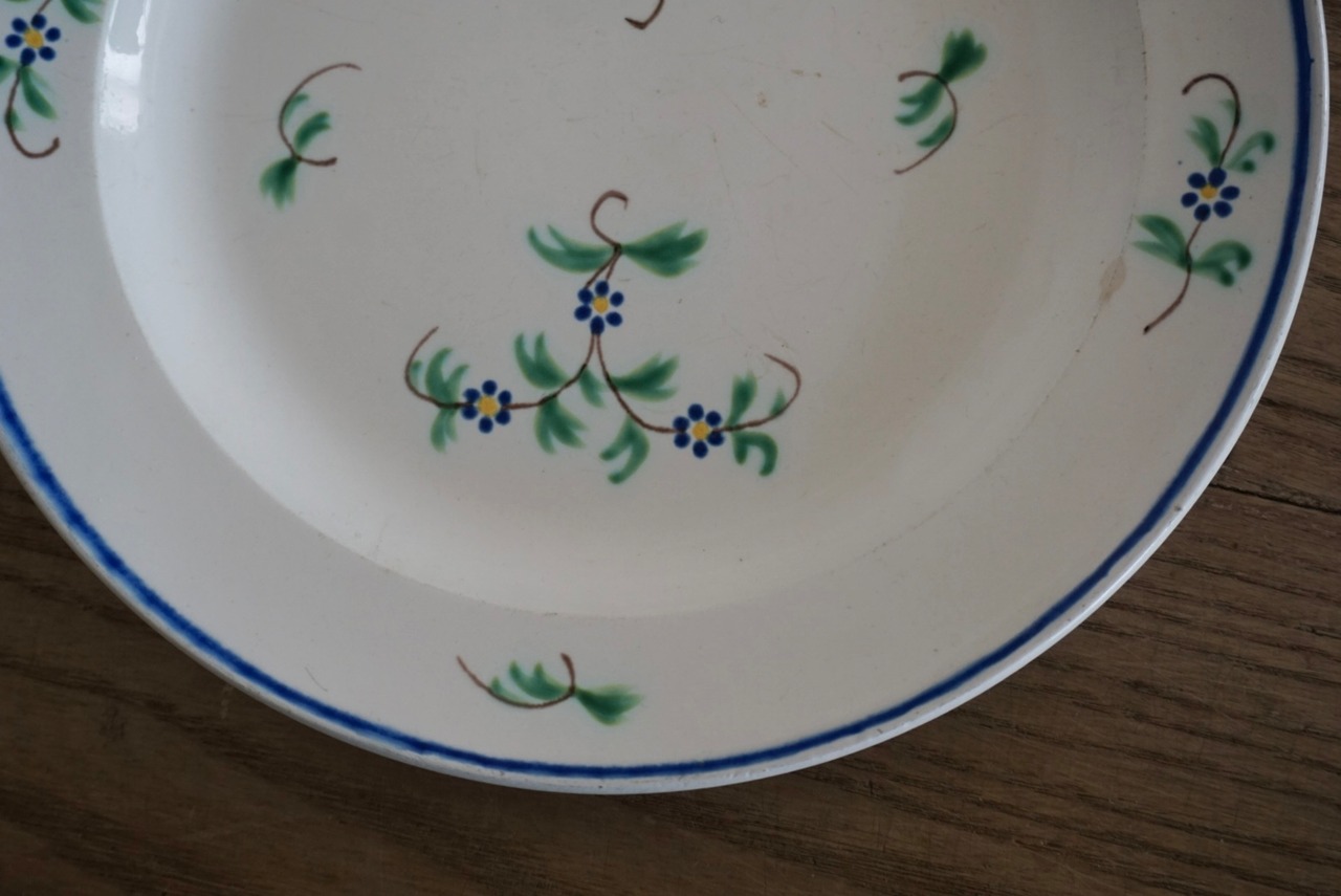 パリ近郊 GIEN窯より、ハンドペイントで施された勿忘草が春を感じさせるデザートプレートです。古い時代のGIENのファイアンスフィーヌで、エッジも効いていて可愛らしさの中に洗練された上質な雰囲気も感じられます。朝食のパンを乗せたら爽やかな朝が迎えられそうですね。