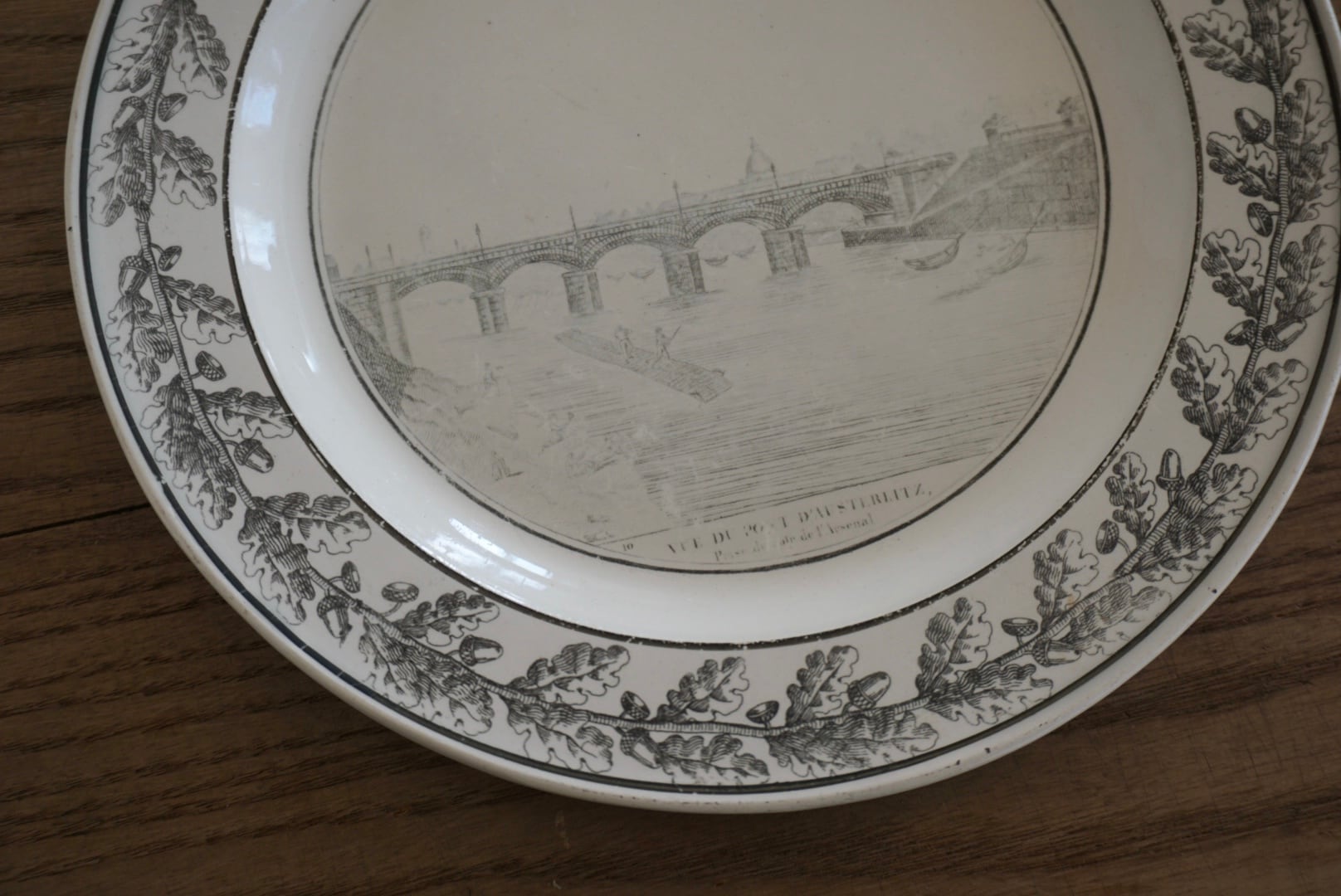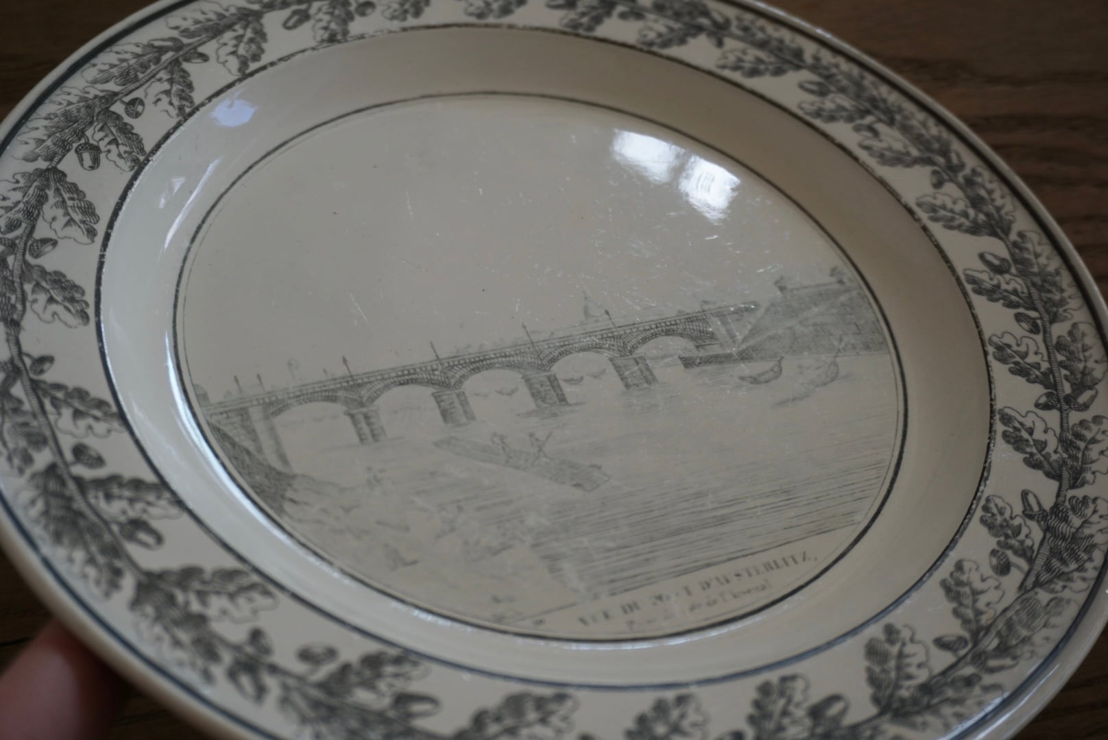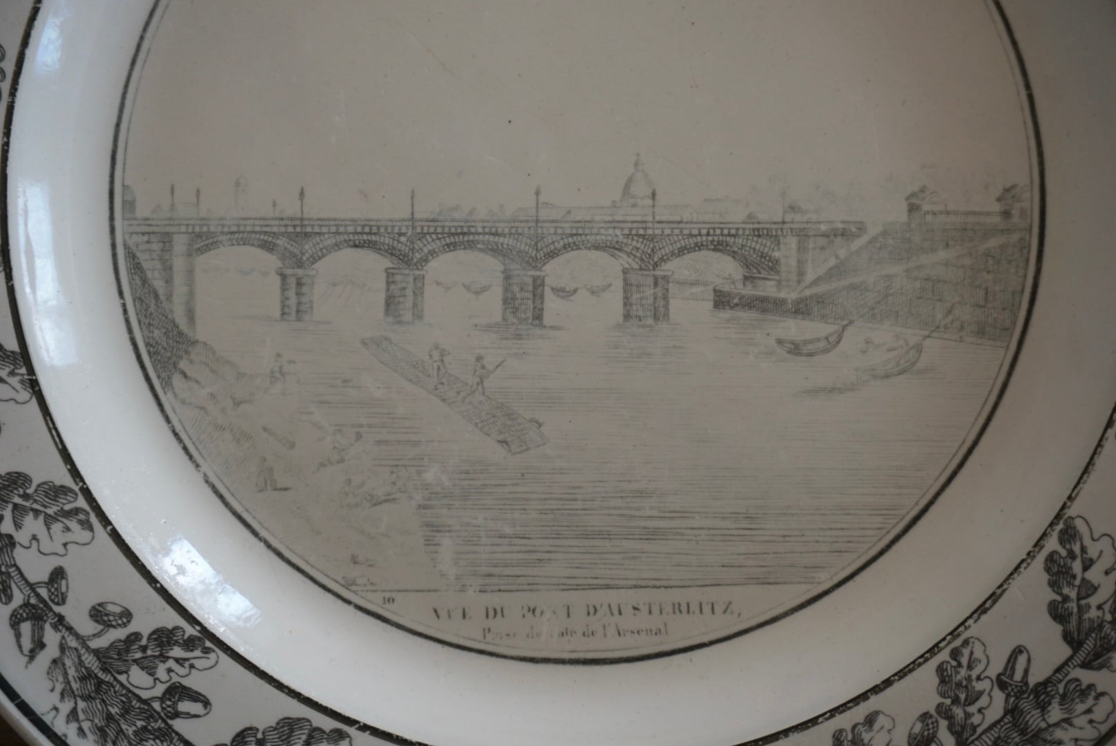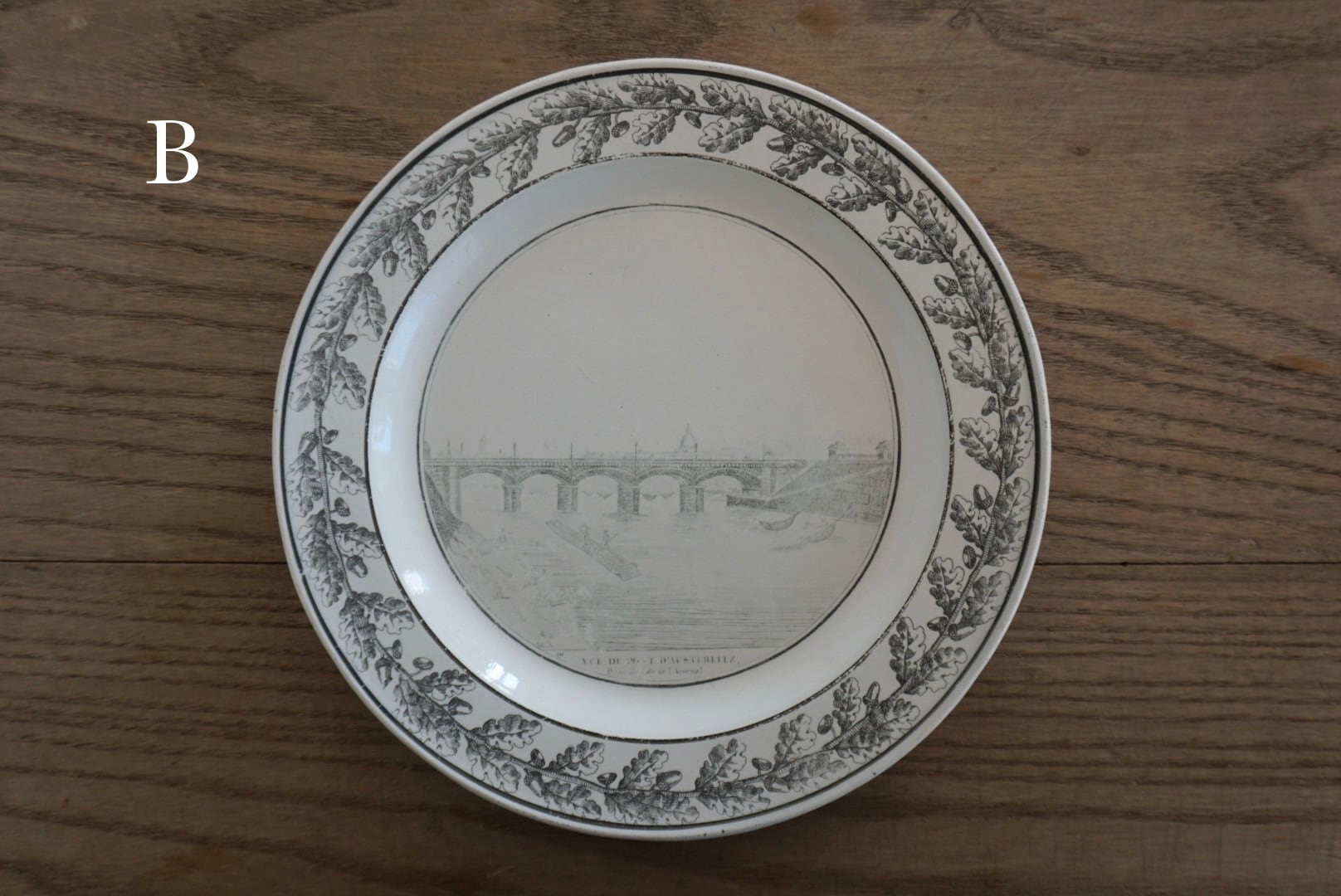 パリ近郊 Creil窯より、グリザイユで転写された風景が素敵なデザート皿です。細い線と淡い色味の転写で、それらがグッとこの子たちの魅力を引き立てていると感じます。描かれている風景はオステルリッツ橋です。オステルリッツ橋は1801年に建設され、1854年に橋の割れに伴い現在の場所に架け直されています。こちらのお皿は19世紀前期(〜1830s)のものなので、転写されているのは1番最初のオリジナルの橋です。リムのどんぐりもまた可愛らしく、飾っても使用しても楽しめる1枚です。