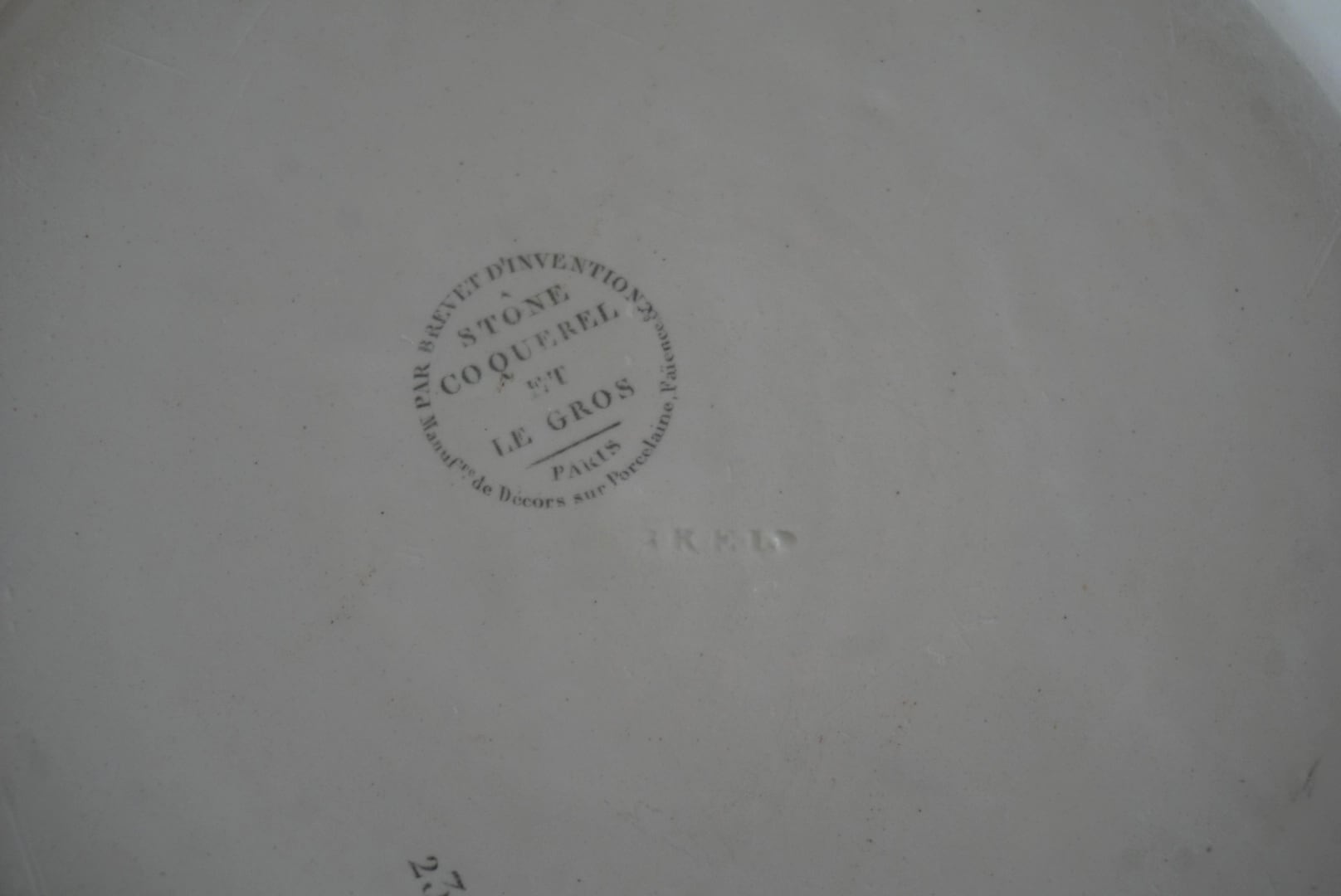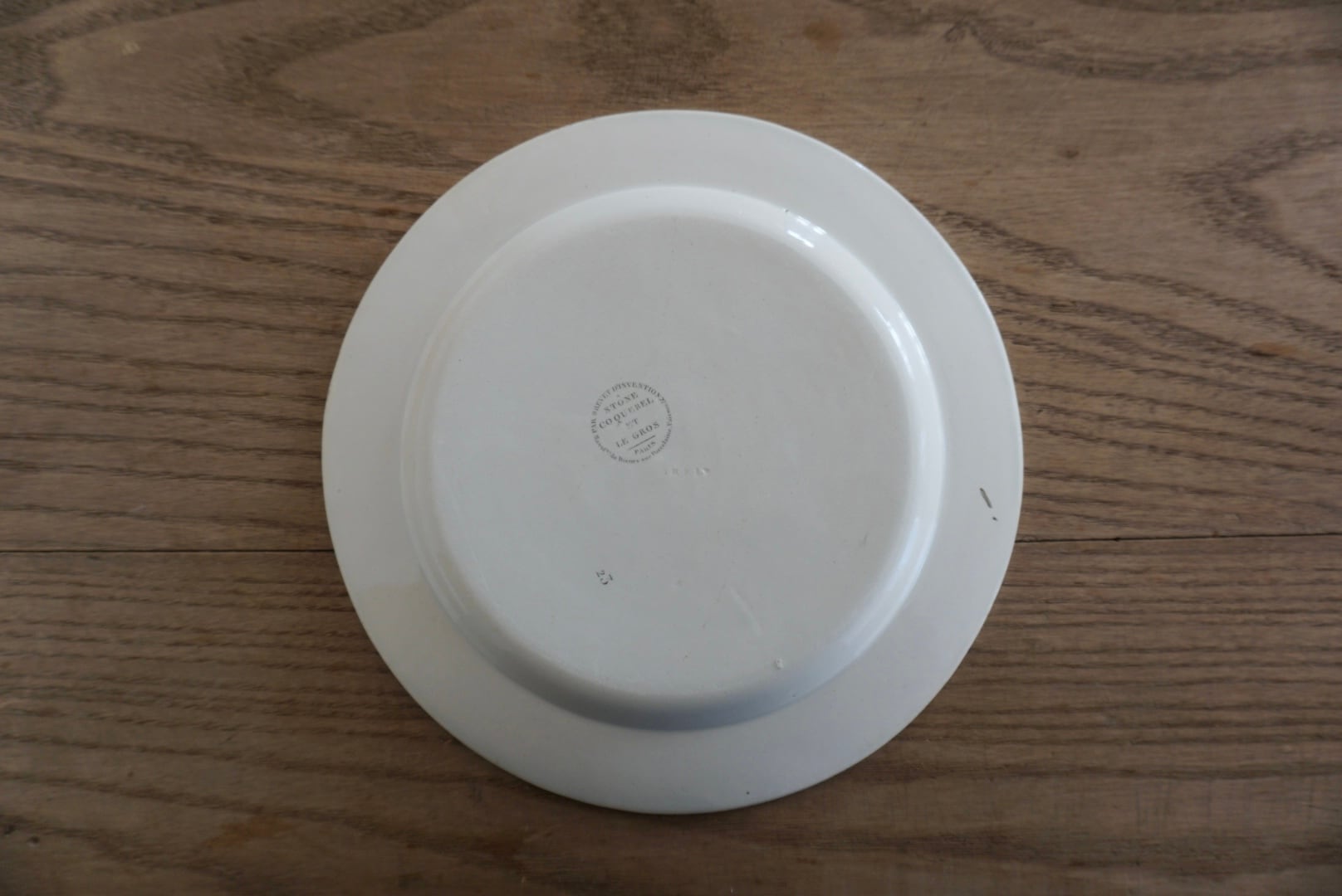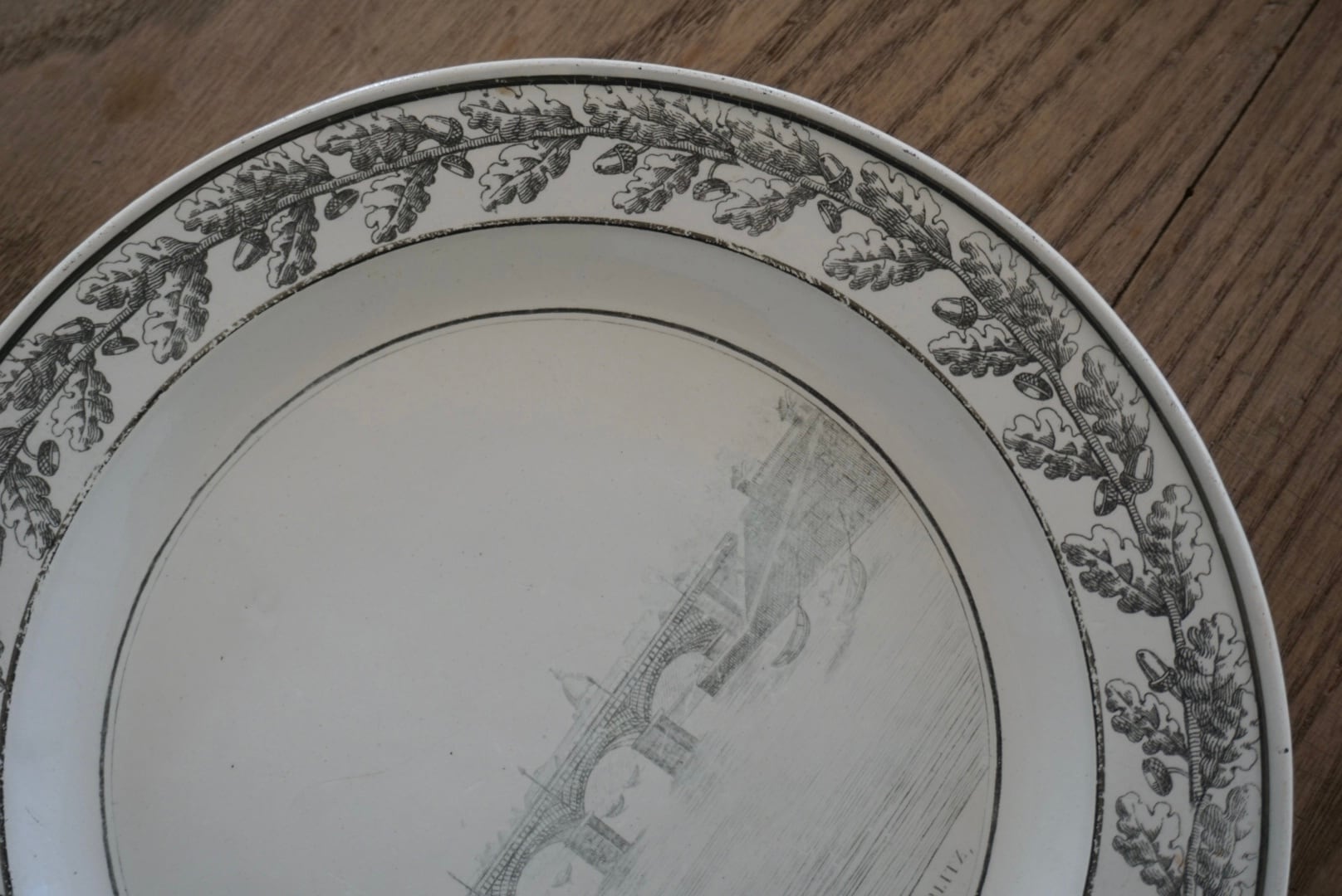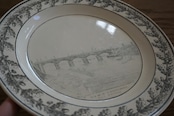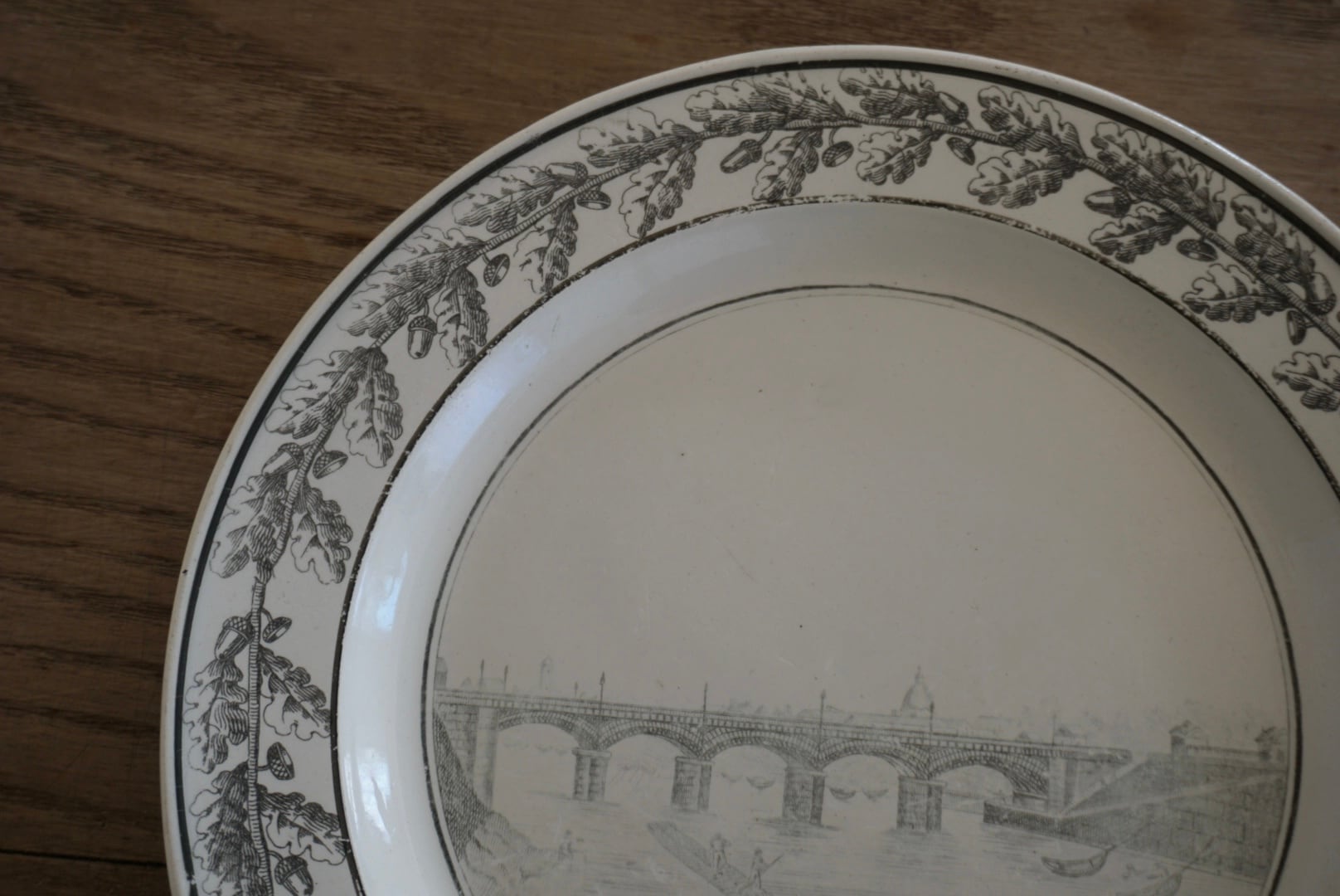 パリ近郊 Creil窯より、グリザイユで転写された風景が素敵なデザート皿です。細い線と淡い色味の転写で、それらがグッとこの子たちの魅力を引き立てていると感じます。描かれている風景はオステルリッツ橋です。オステルリッツ橋は1801年に建設され、1854年に橋の割れに伴い現在の場所に架け直されています。こちらのお皿は19世紀前期(〜1830s)のものなので、転写されているのは1番最初のオリジナルの橋です。リムのどんぐりもまた可愛らしく、飾っても使用しても楽しめる1枚です。