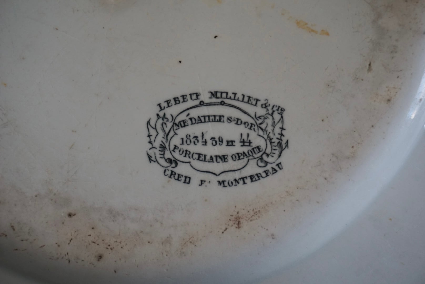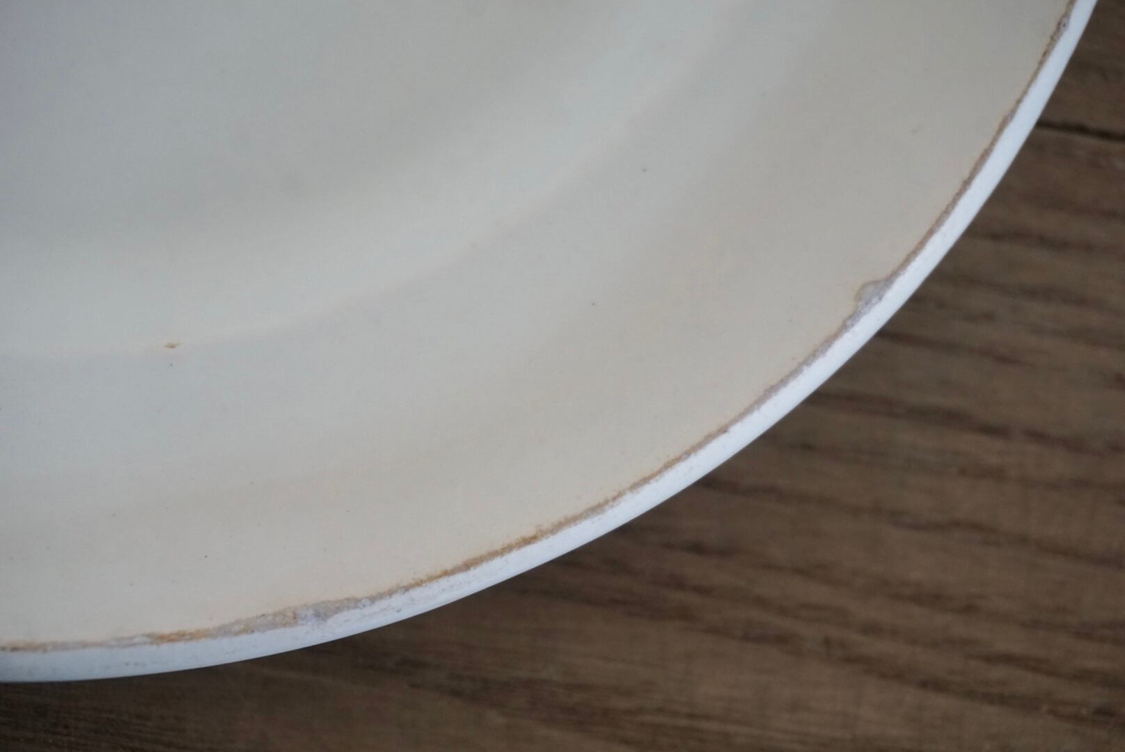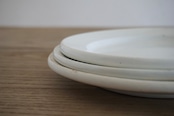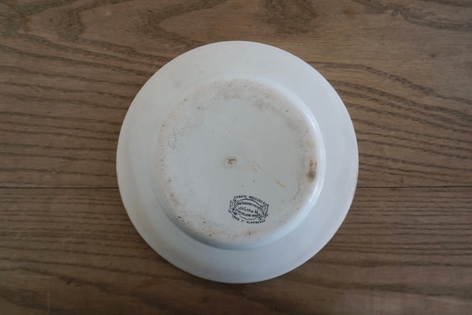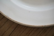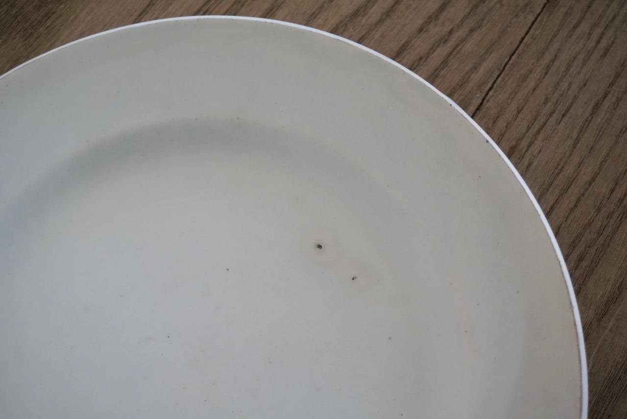 パリ近郊 Creil et Montereau窯の地厚皿です。主に修道院や宿舎、ビストロなどの多くの人が利用する施設で使用されたため、厚く頑丈な作りになっています。CreilとMontereauが合併後すぐのドラゴン刻印の時代のもので、個人的にこの刻印のものは質が高いと感じます。アンティークらしい絶妙な枯れ感がたまらないですね。※3枚重ねた写真の1番下のものです。