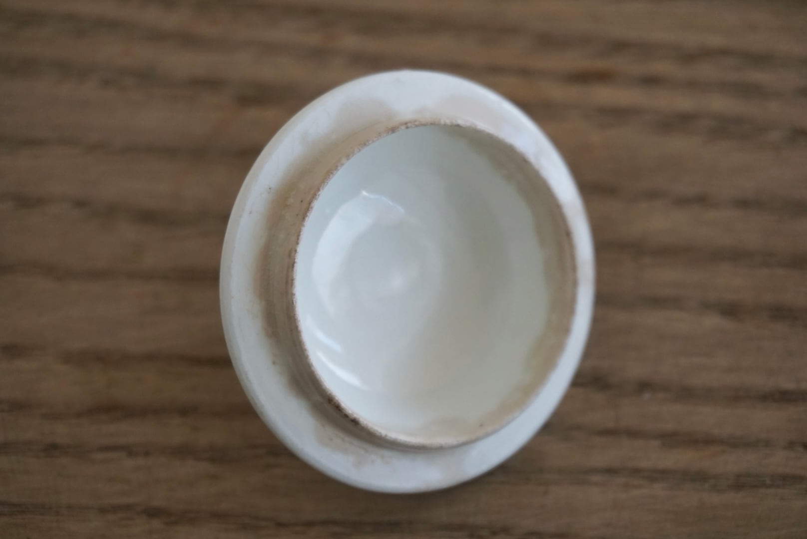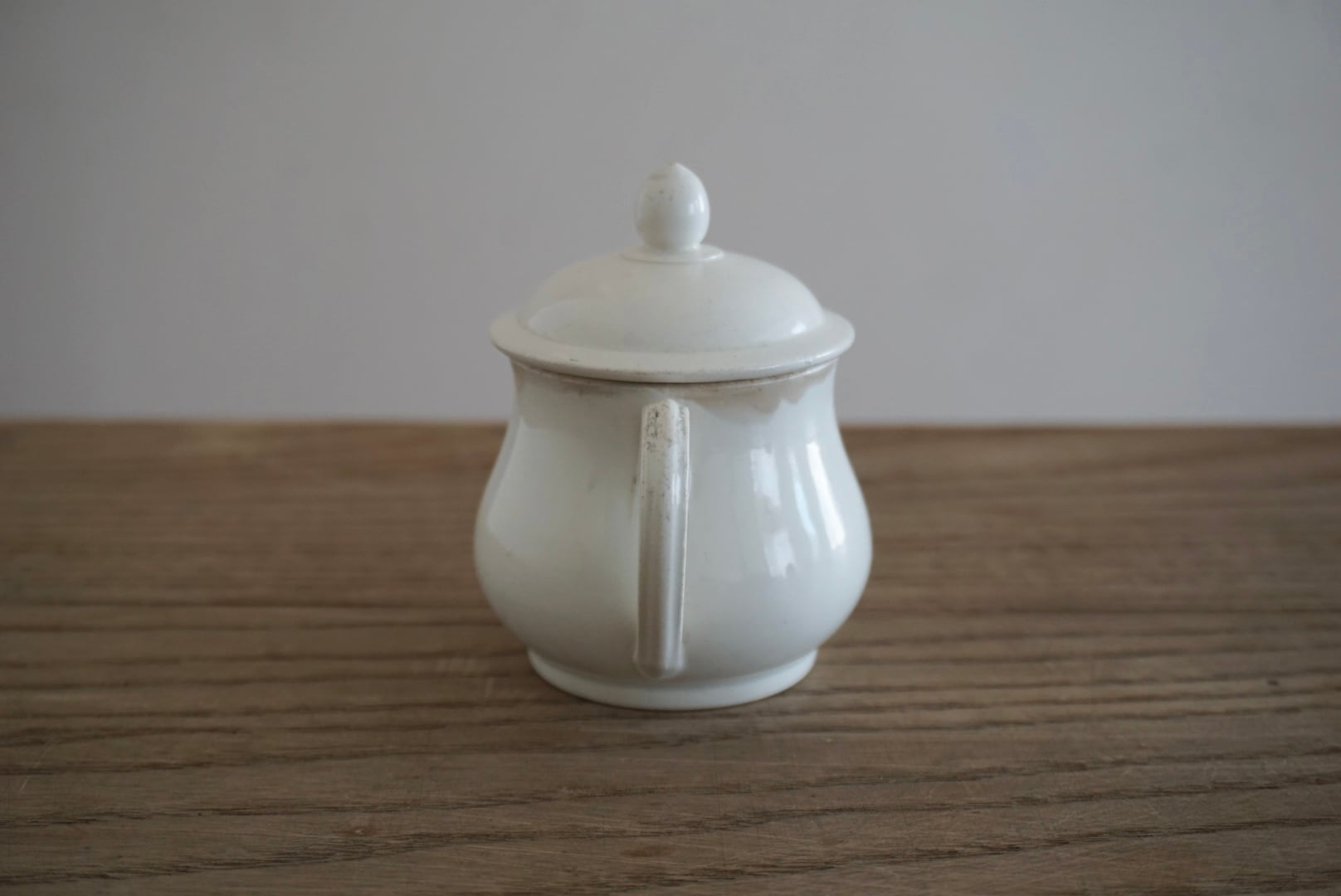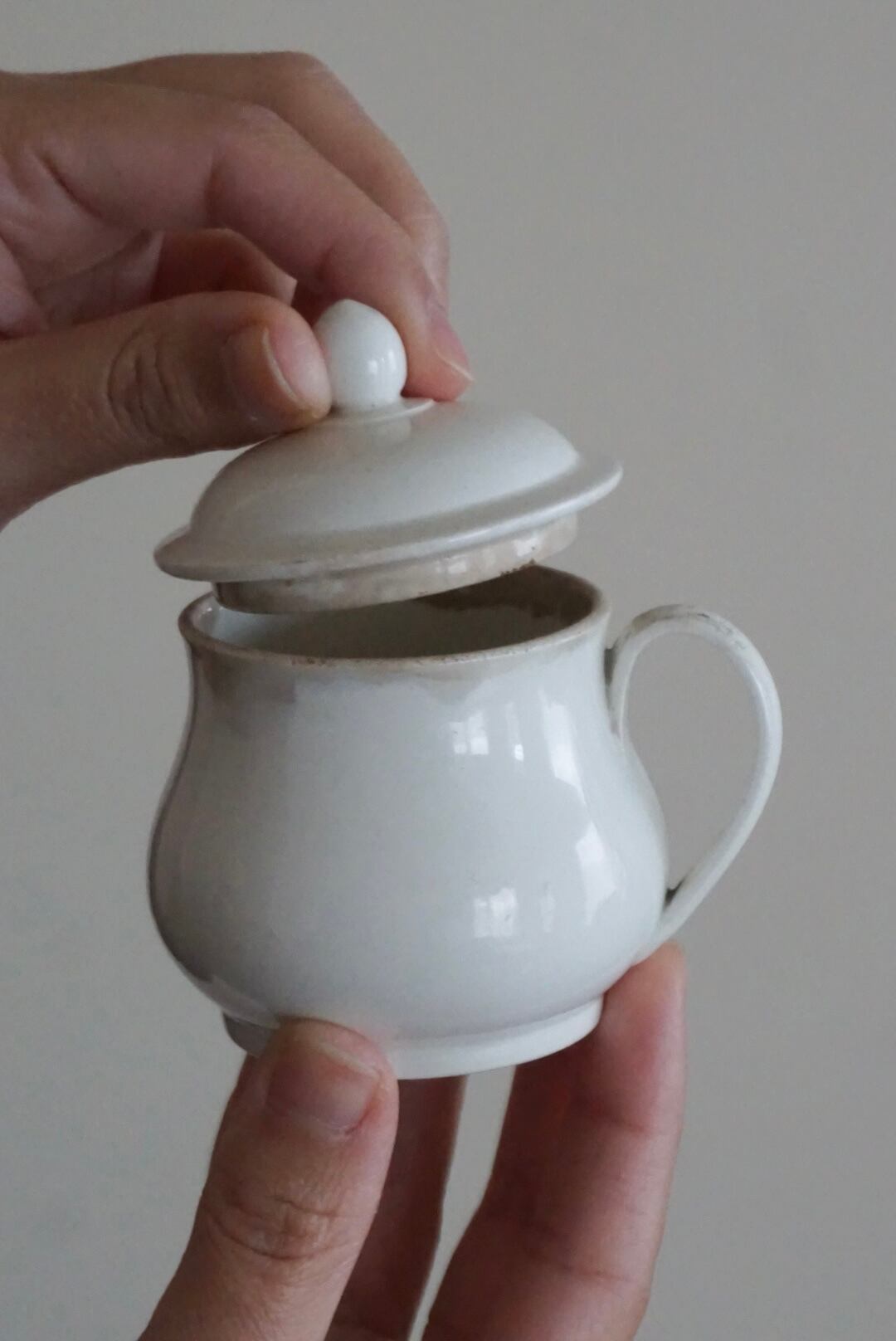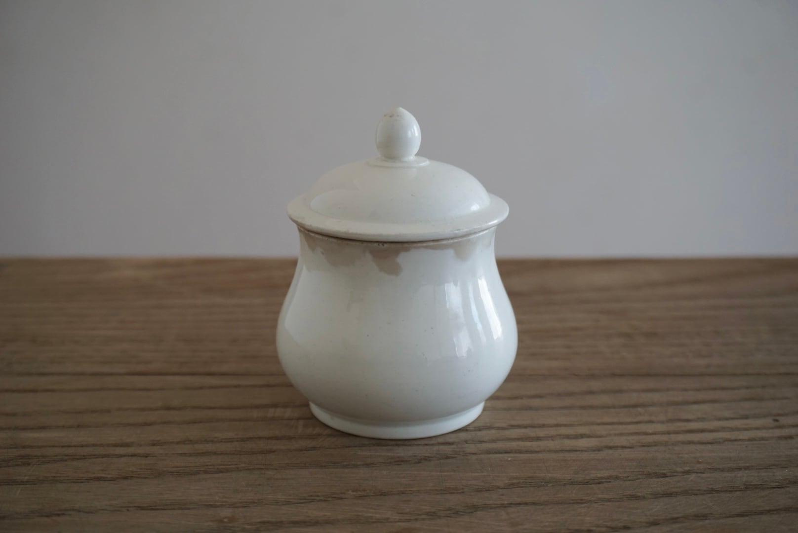ファイアンスフィーヌのクリームポットです。刻印がなく窯元は分かりませんが、エッジも効いてコロンと可愛らしいフォルムで、数個並べて飾りたくなってしまいます。蓋も付いているので、1日分のおやつを入れて作業の合間にパクッと…ソースを入れてそのまま冷蔵庫へ…などなど、アイデア次第でたくさん実用いただけます。