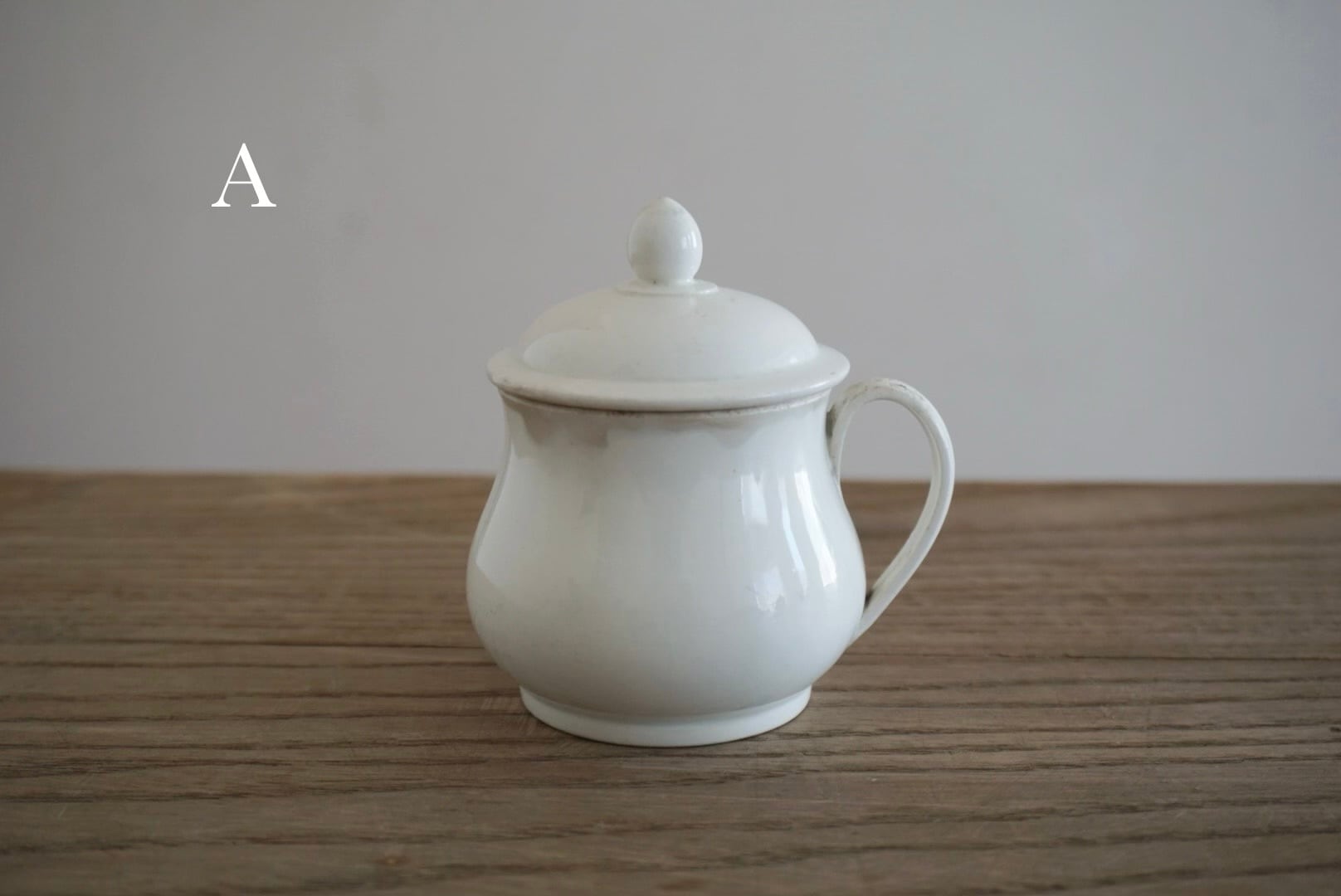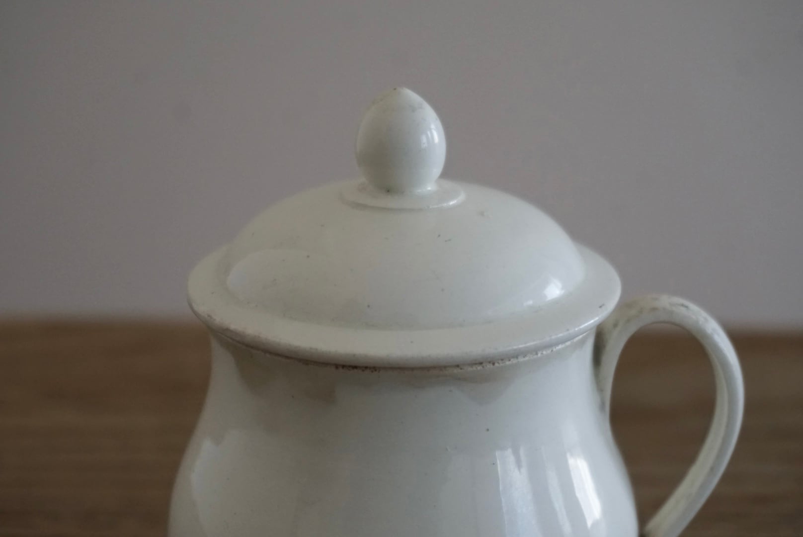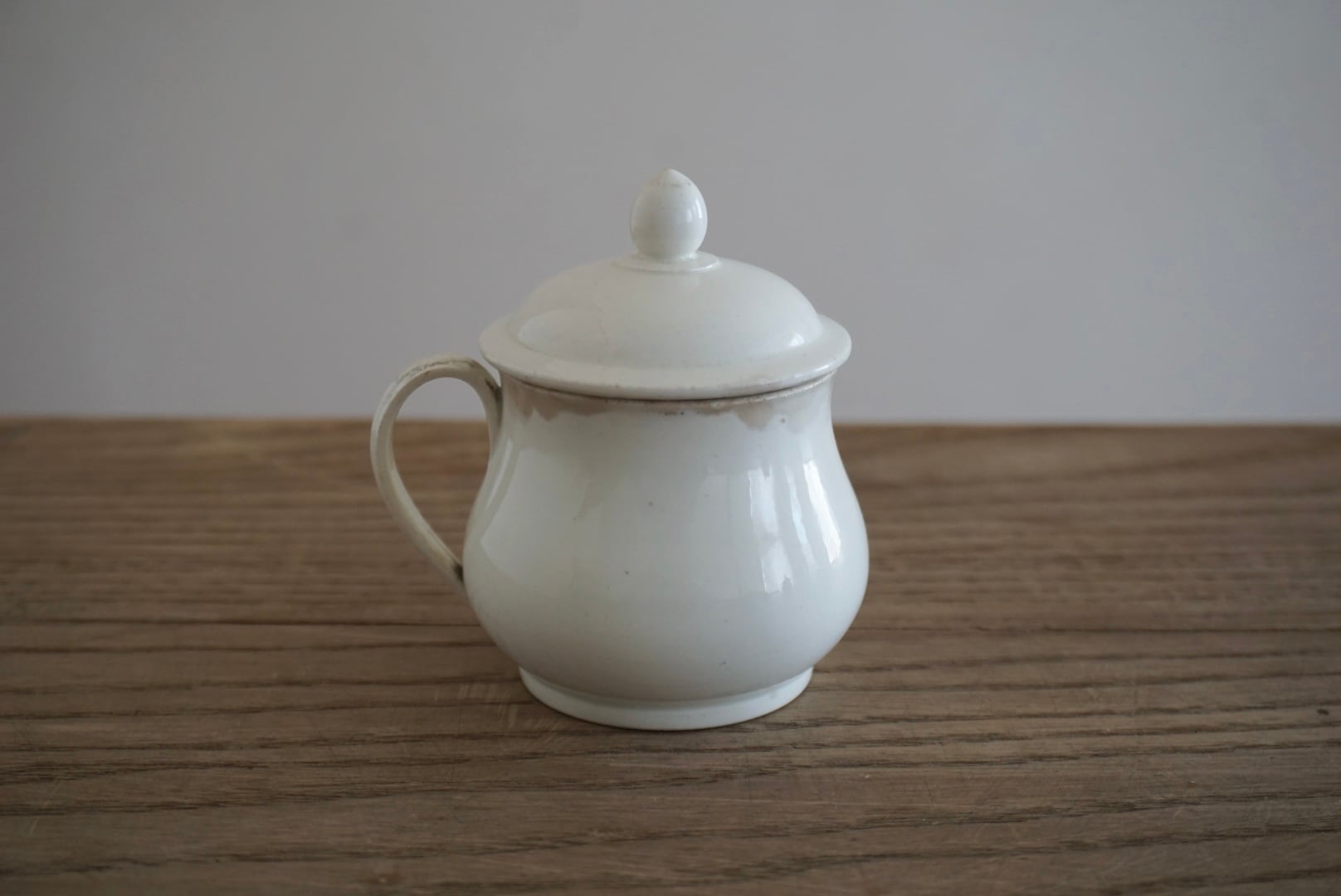 ファイアンスフィーヌのクリームポットです。刻印がなく窯元は分かりませんが、エッジも効いてコロンと可愛らしいフォルムで、数個並べて飾りたくなってしまいます。蓋も付いているので、1日分のおやつを入れて作業の合間にパクッと…ソースを入れてそのまま冷蔵庫へ…などなど、アイデア次第でたくさん実用いただけます。