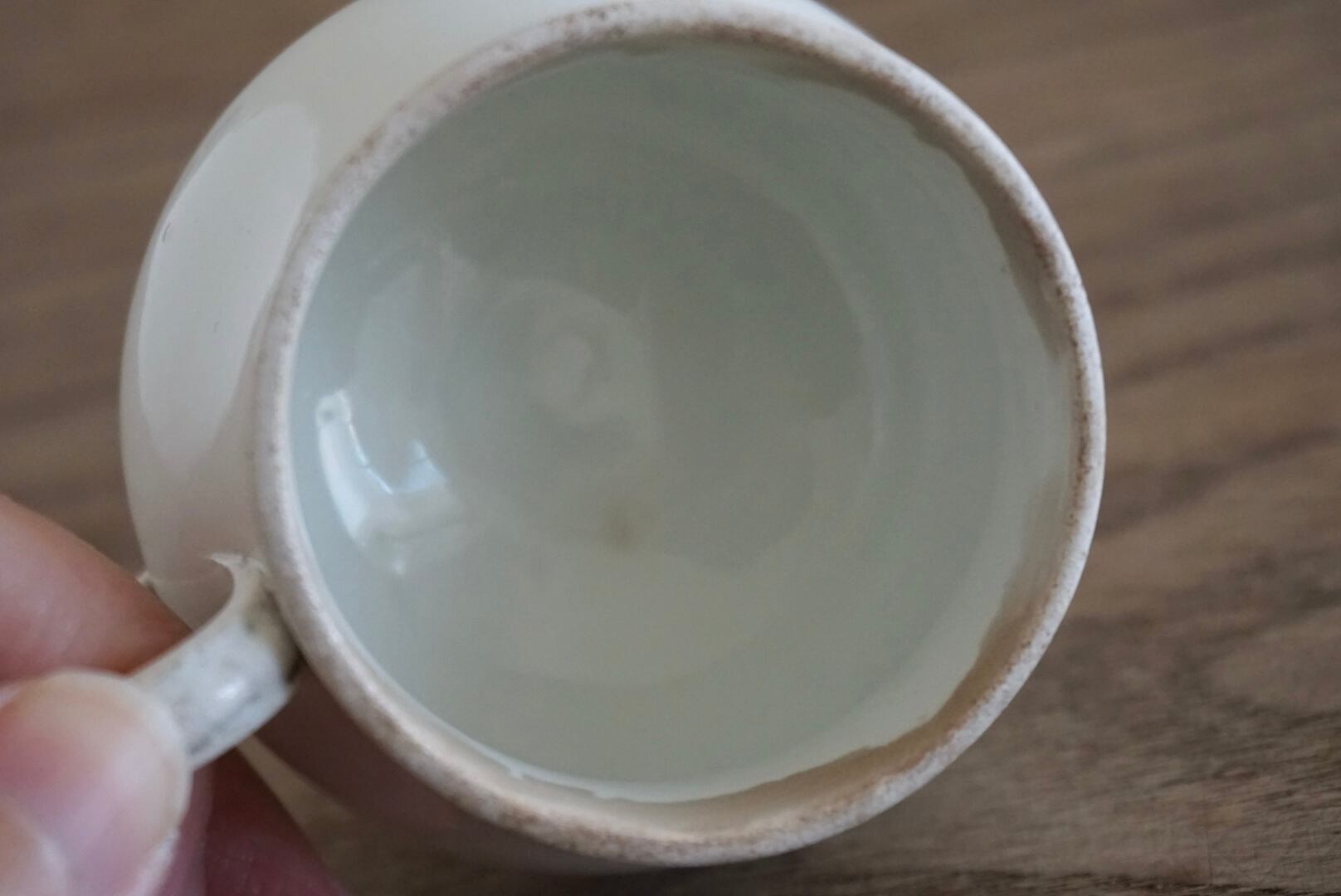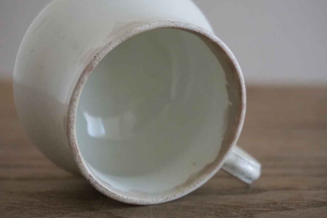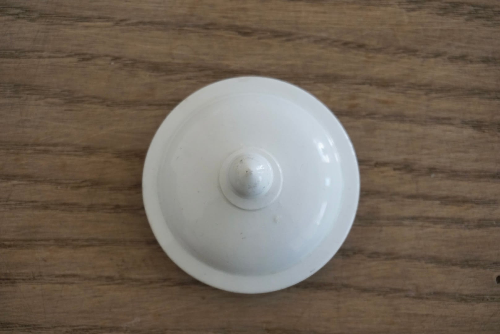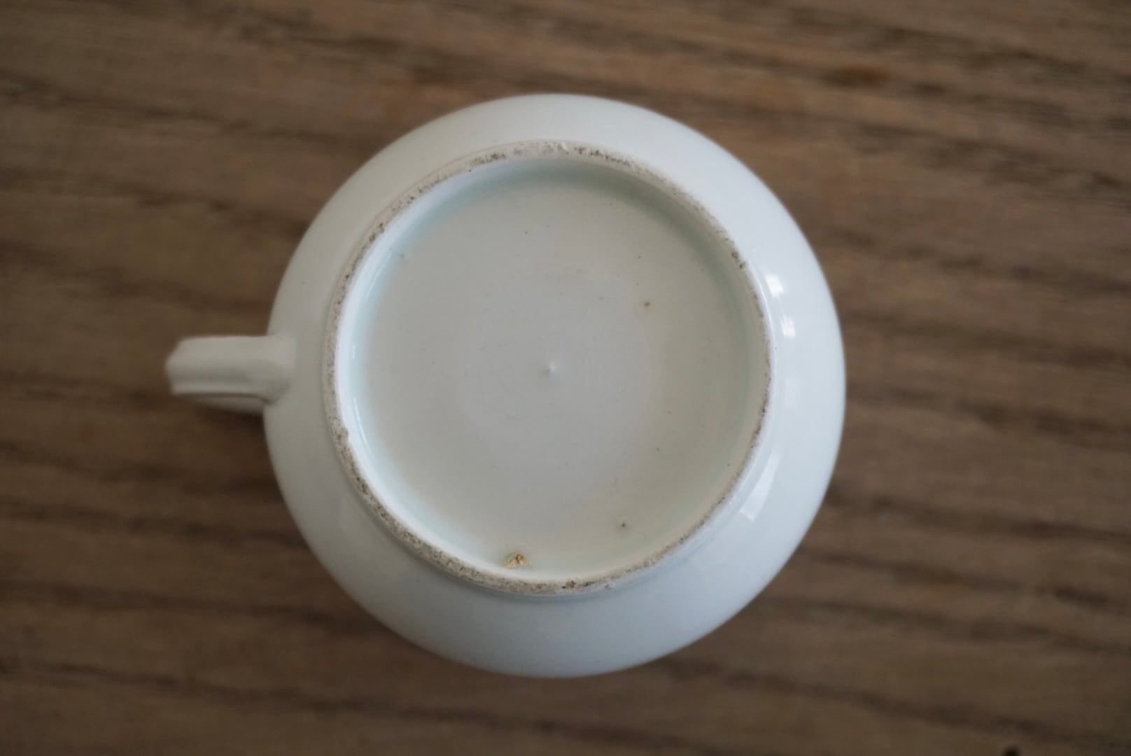 ファイアンスフィーヌのクリームポットです。刻印がなく窯元は分かりませんが、エッジも効いてコロンと可愛らしいフォルムで、数個並べて飾りたくなってしまいます。蓋も付いているので、1日分のおやつを入れて作業の合間にパクッと…ソースを入れてそのまま冷蔵庫へ…などなど、アイデア次第でたくさん実用いただけます。