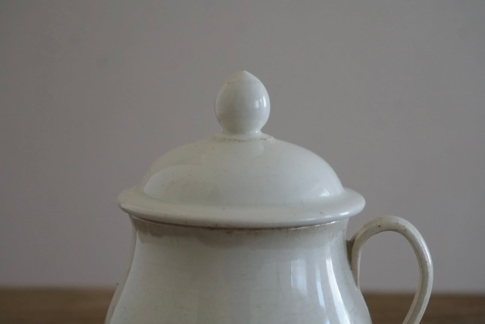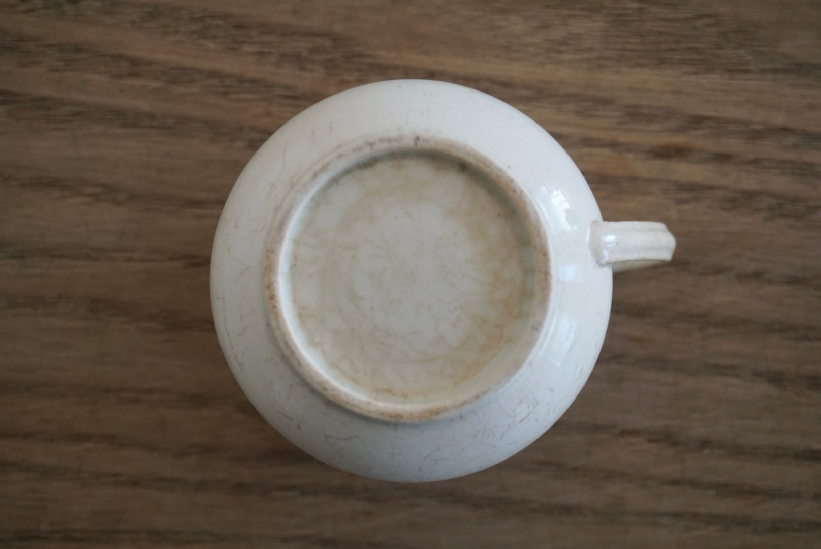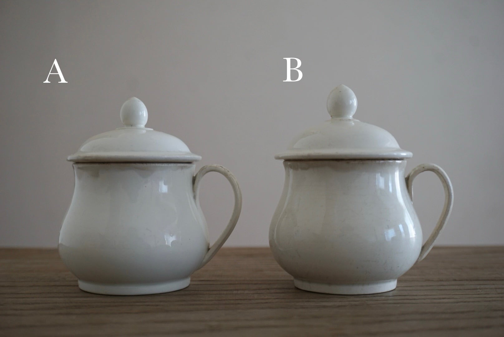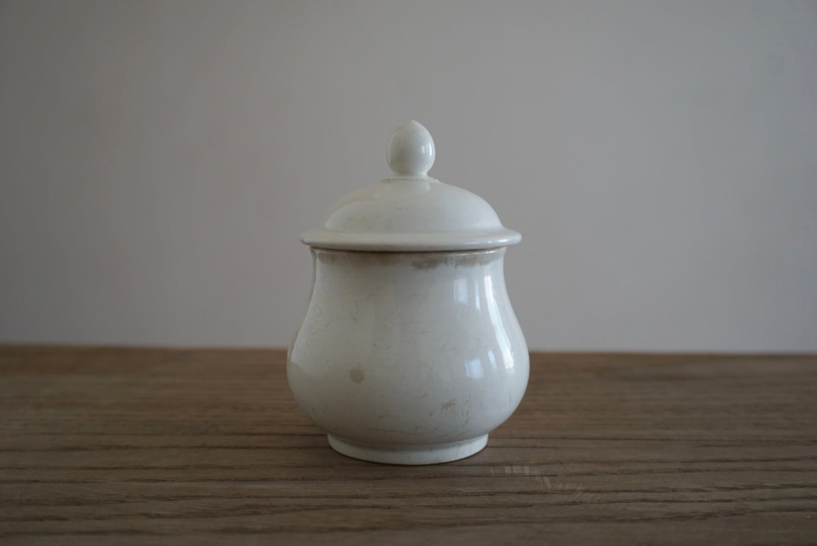 ファイアンスフィーヌのクリームポットです。刻印がなく窯元は分かりませんが、エッジも効いてコロンと可愛らしいフォルムで、数個並べて飾りたくなってしまいます。蓋も付いているので、1日分のおやつを入れて作業の合間にパクッと…ソースを入れてそのまま冷蔵庫へ…などなど、アイデア次第でたくさん実用いただけます。