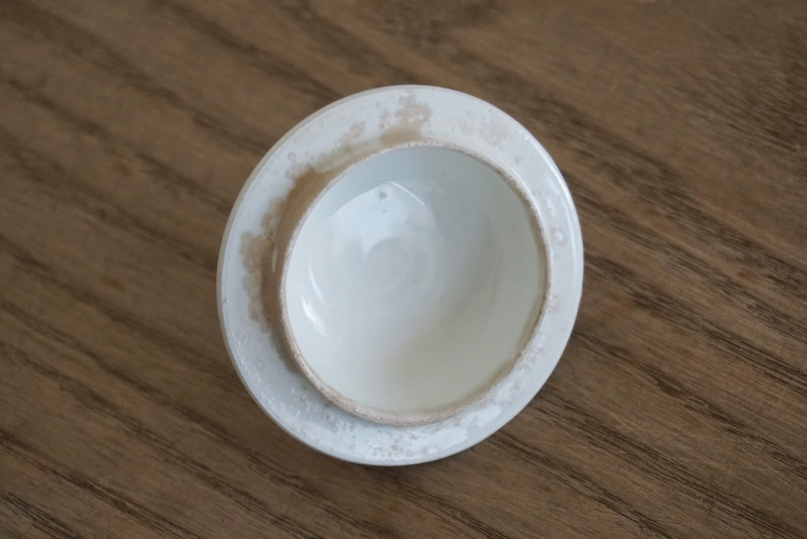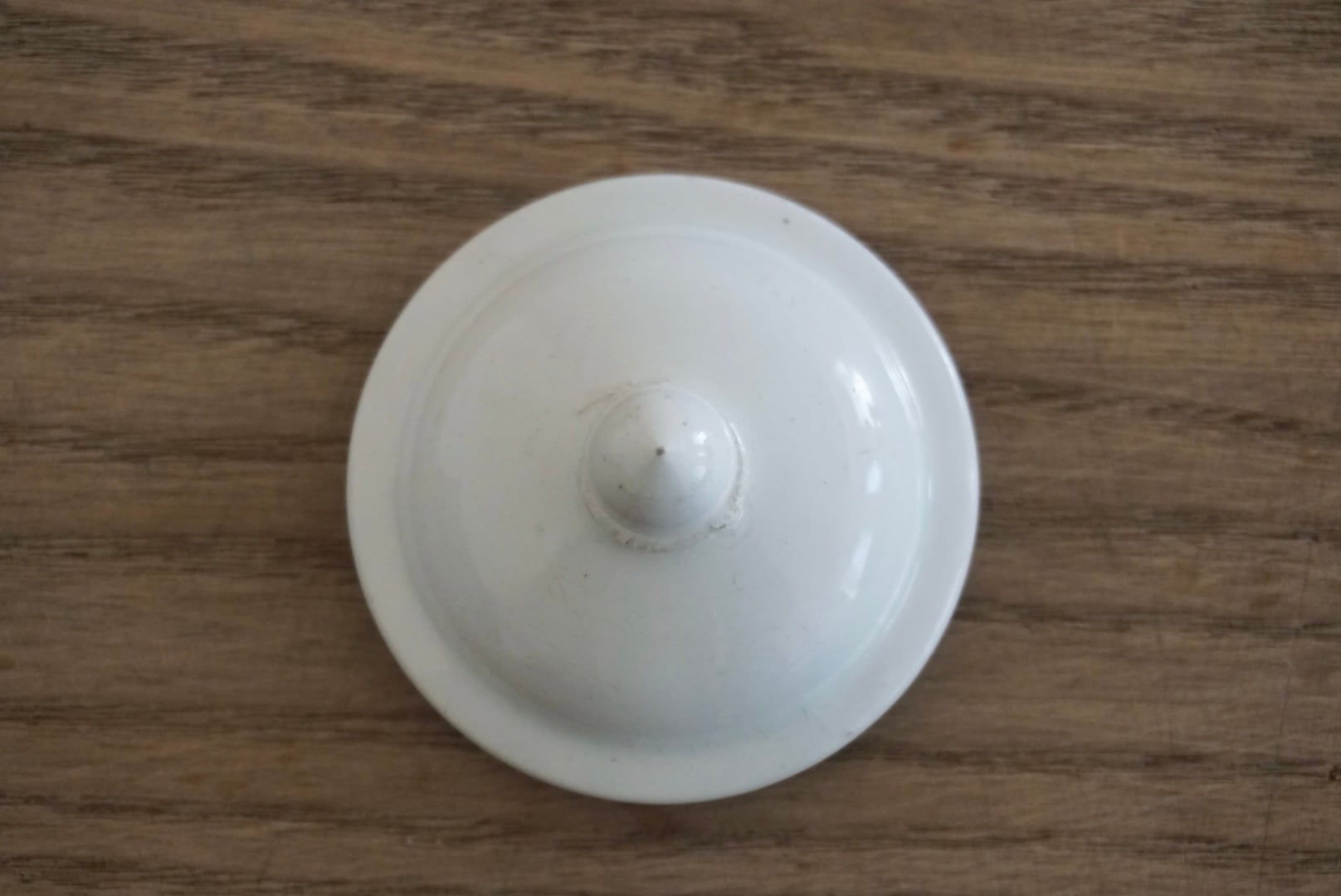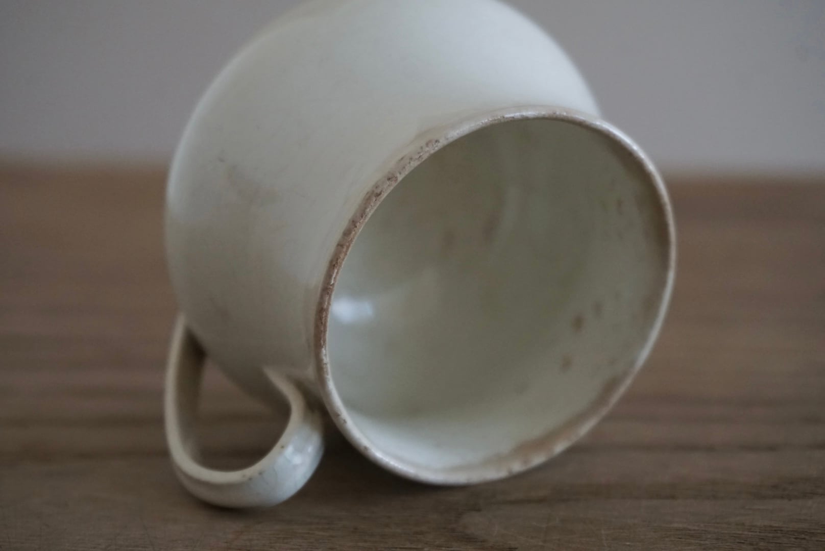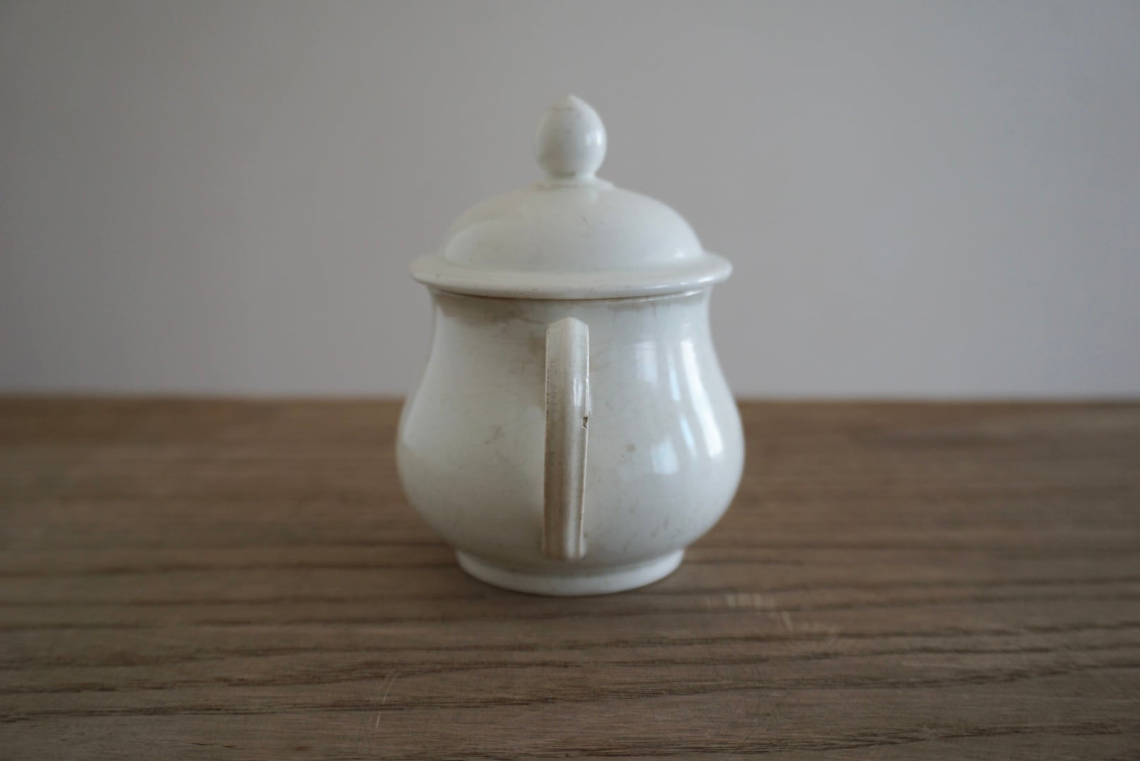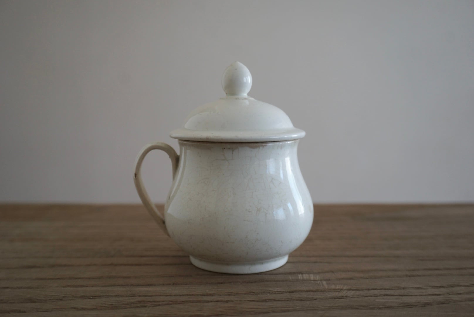 ファイアンスフィーヌのクリームポットです。刻印がなく窯元は分かりませんが、エッジも効いてコロンと可愛らしいフォルムで、数個並べて飾りたくなってしまいます。蓋も付いているので、1日分のおやつを入れて作業の合間にパクッと…ソースを入れてそのまま冷蔵庫へ…などなど、アイデア次第でたくさん実用いただけます。
