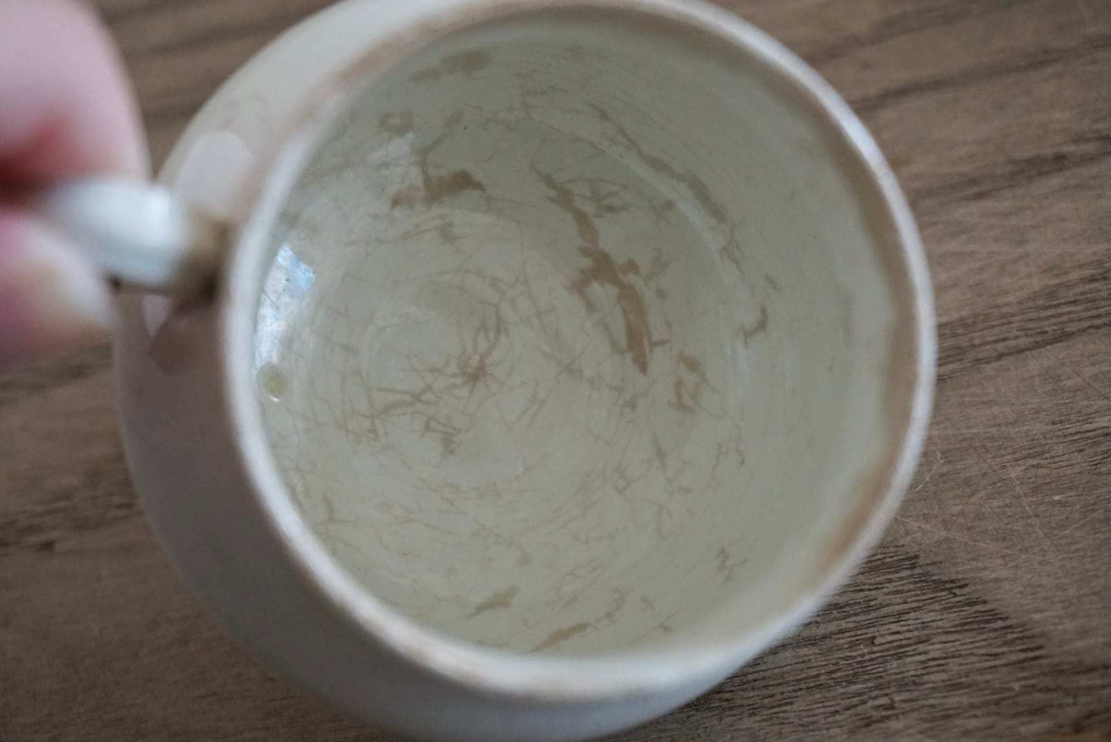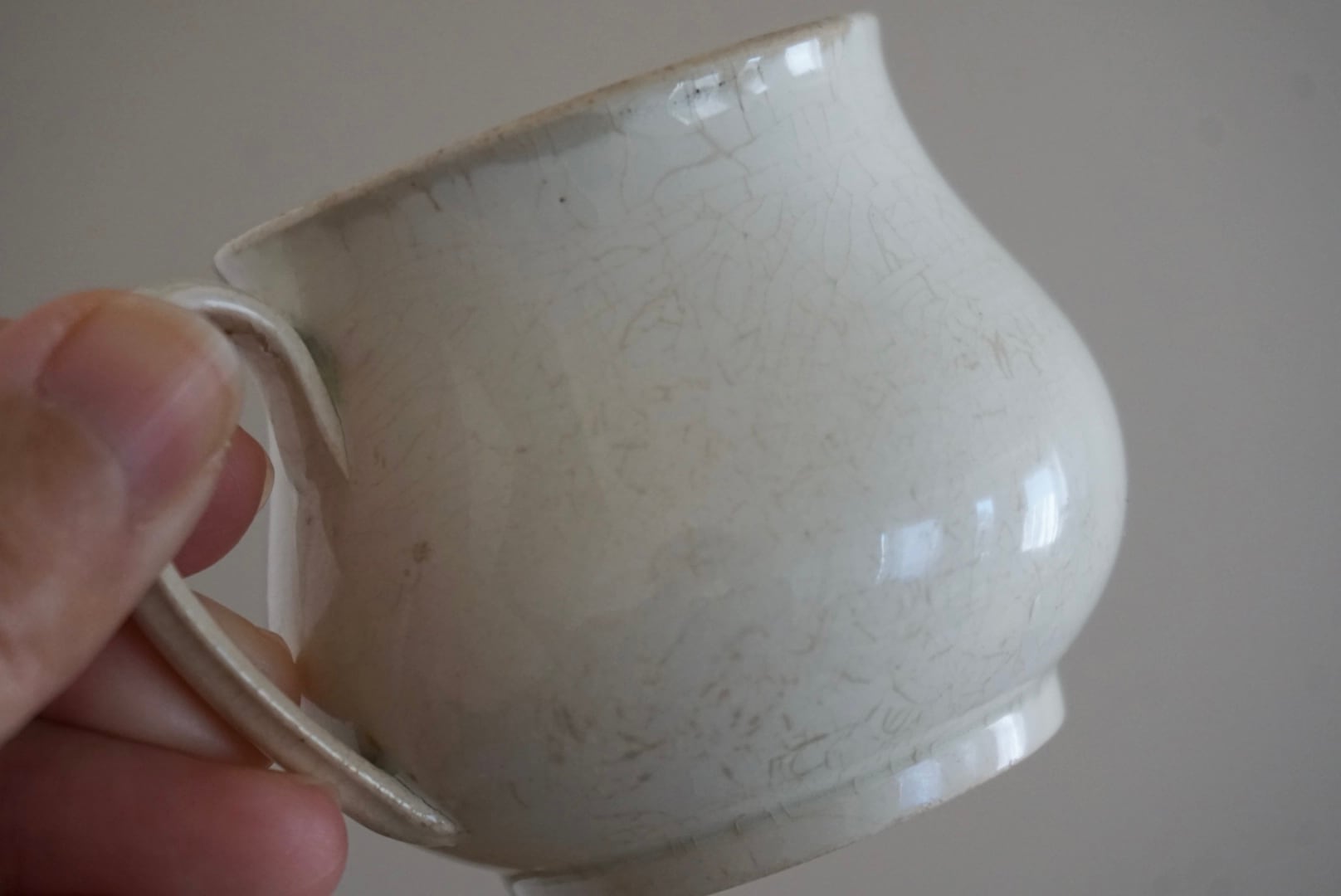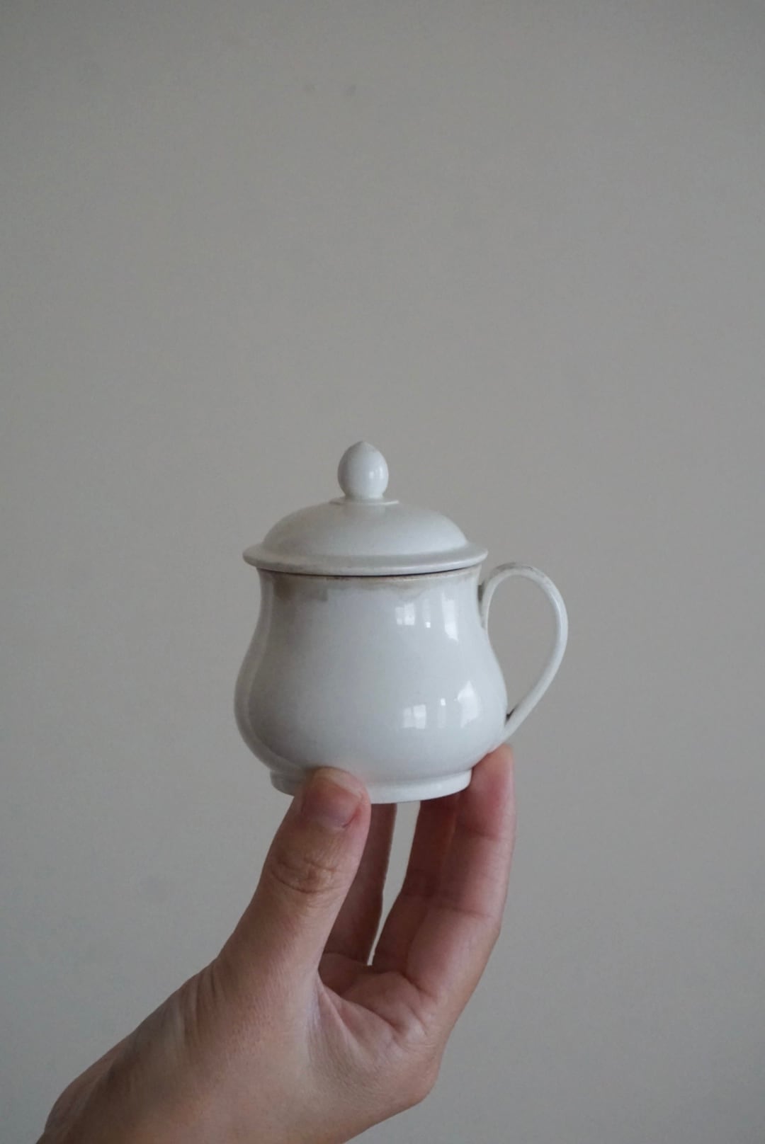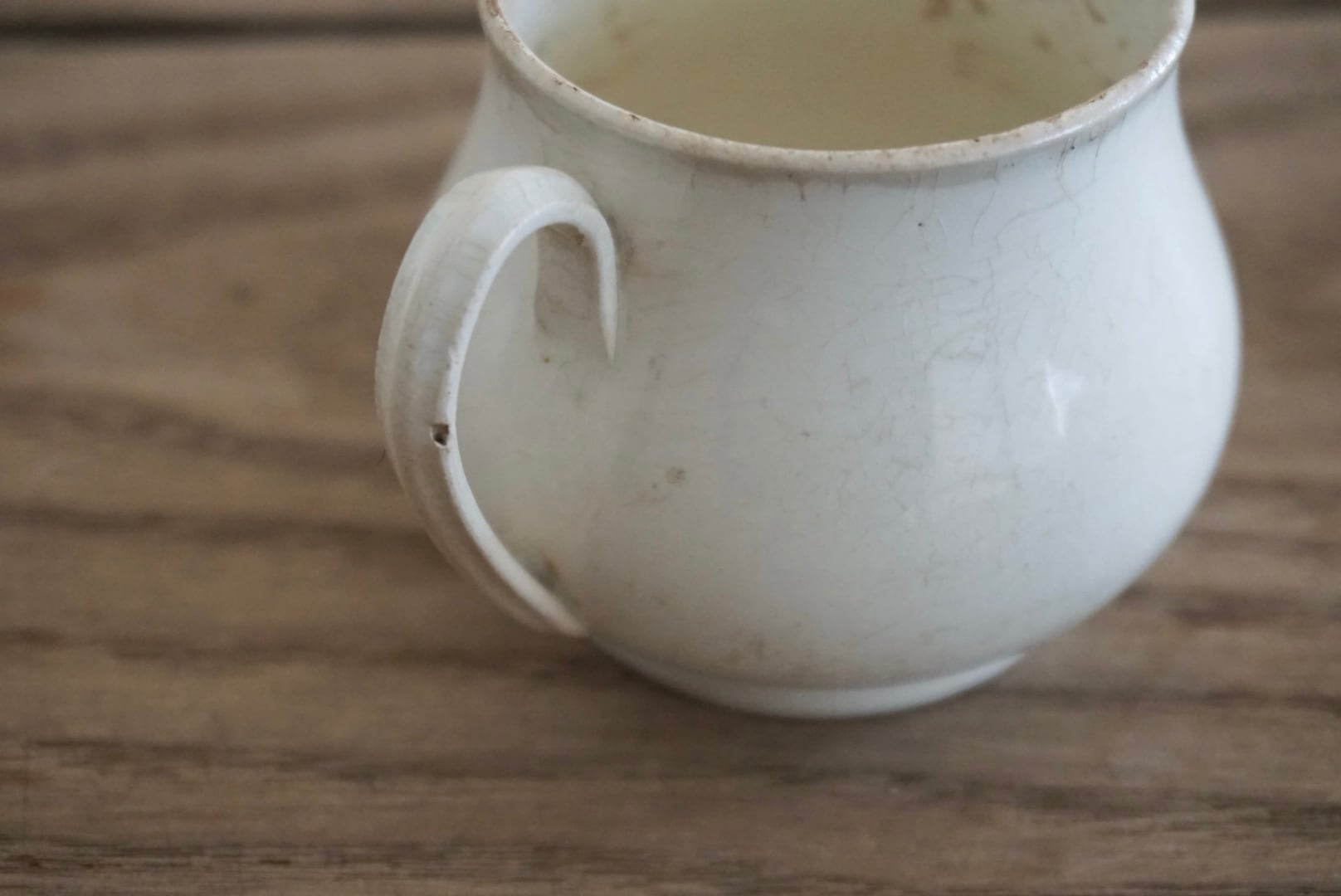 ファイアンスフィーヌのクリームポットです。刻印がなく窯元は分かりませんが、エッジも効いてコロンと可愛らしいフォルムで、数個並べて飾りたくなってしまいます。蓋も付いているので、1日分のおやつを入れて作業の合間にパクッと…ソースを入れてそのまま冷蔵庫へ…などなど、アイデア次第でたくさん実用いただけます。