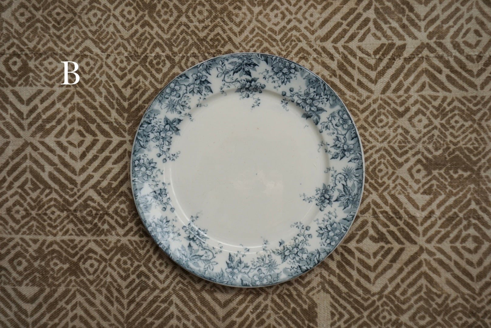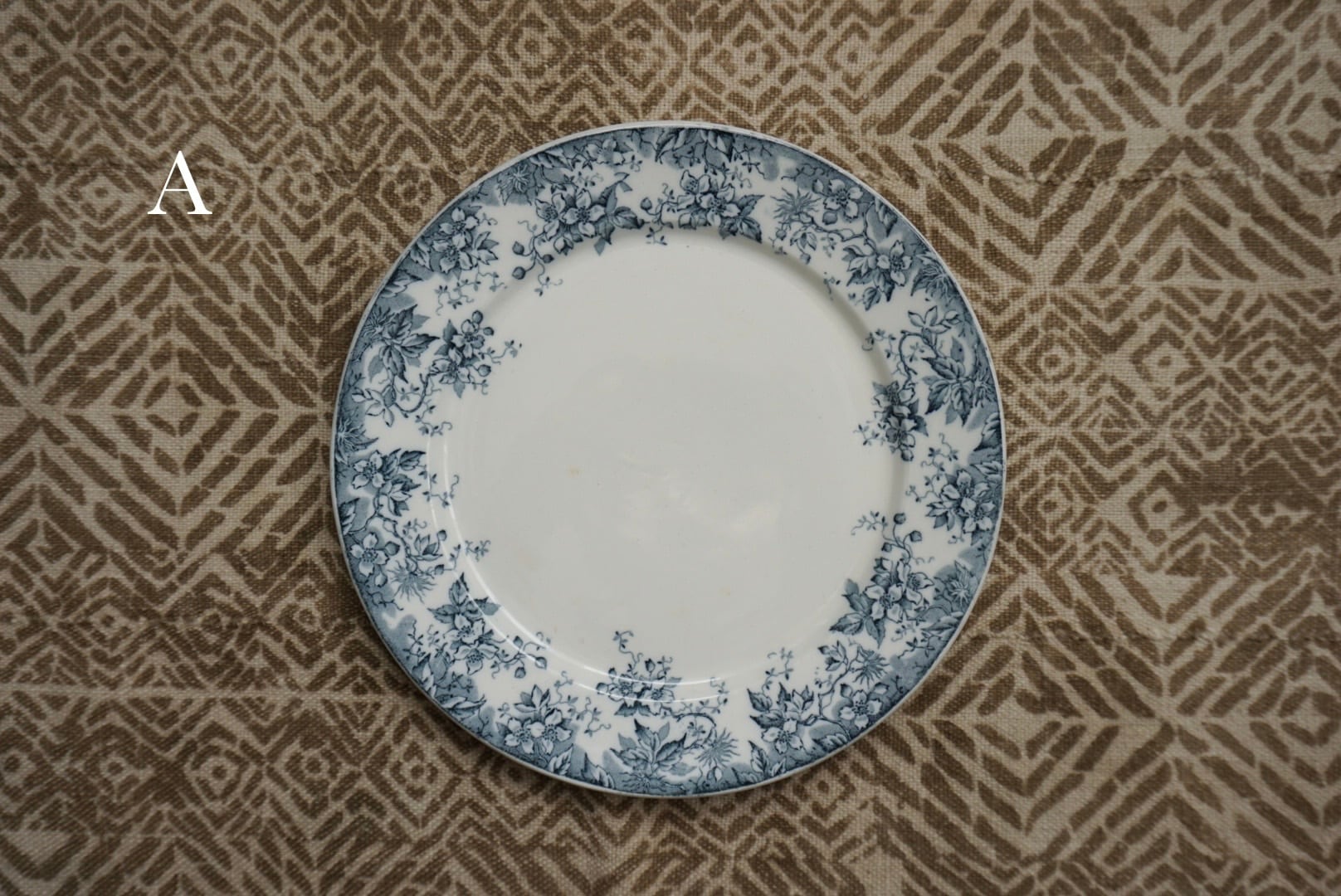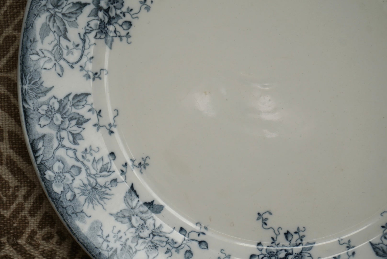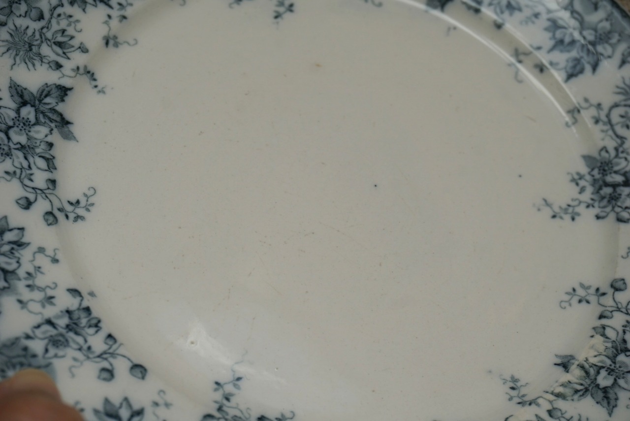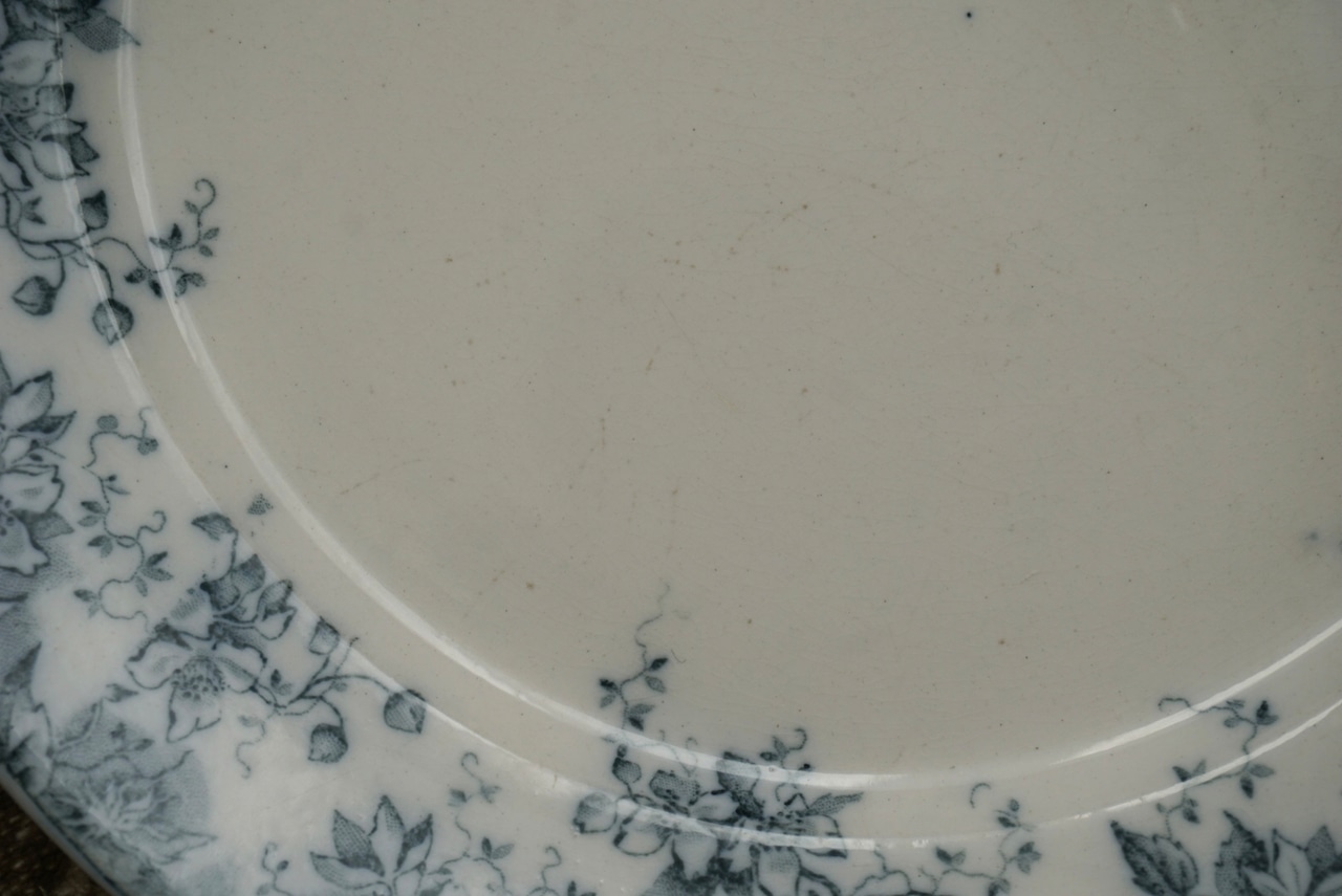 ロレーヌ地方 Sarreguemines窯より、ALPHANDシリーズのデザートプレートです。ALPHANDといえば茶色のイメージがありましたが、こちらはグレー味が強い青で、初めて見るお色です。繊細な転写のデザインとインクの色味が相まって、ふわっと儚げな印象です。