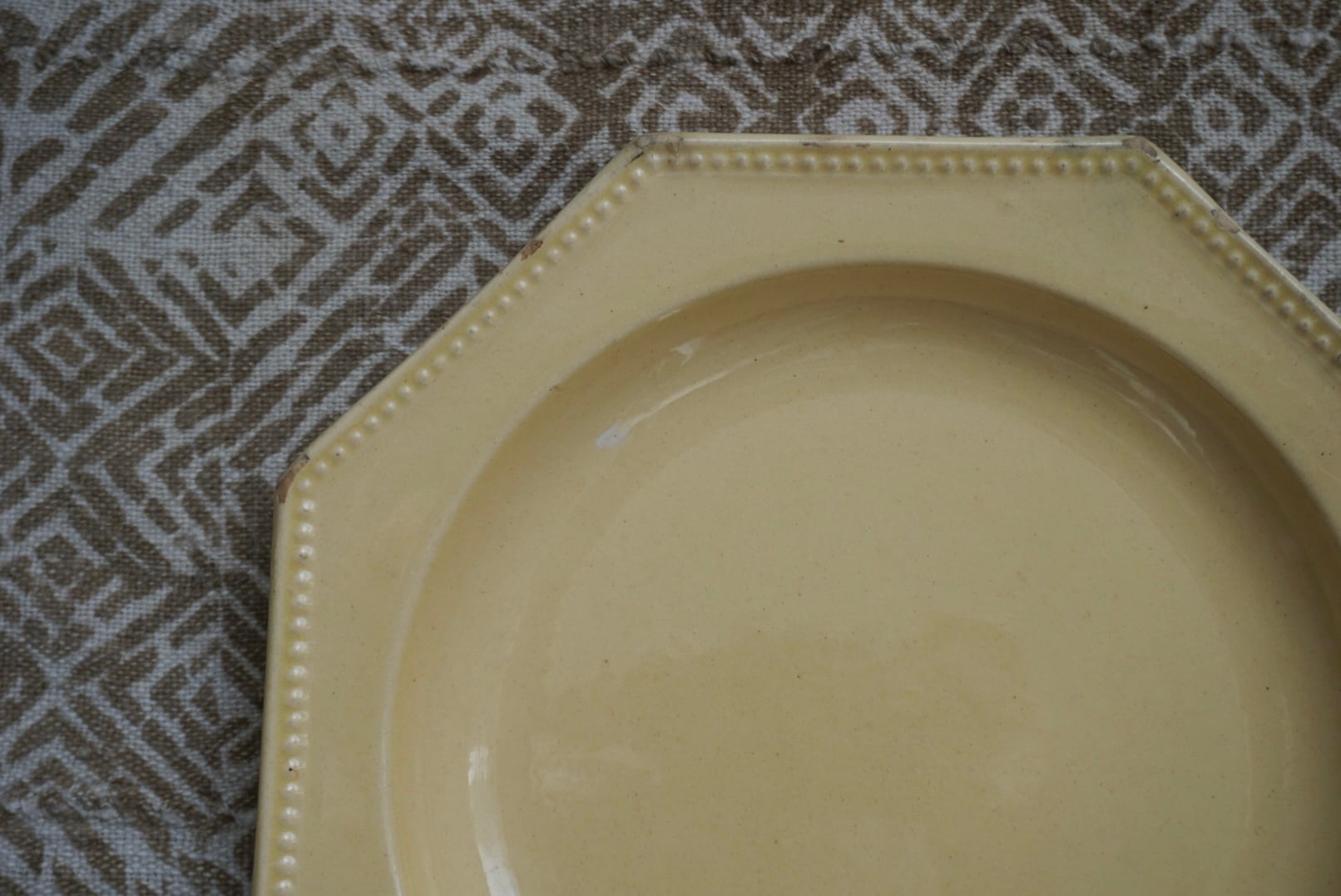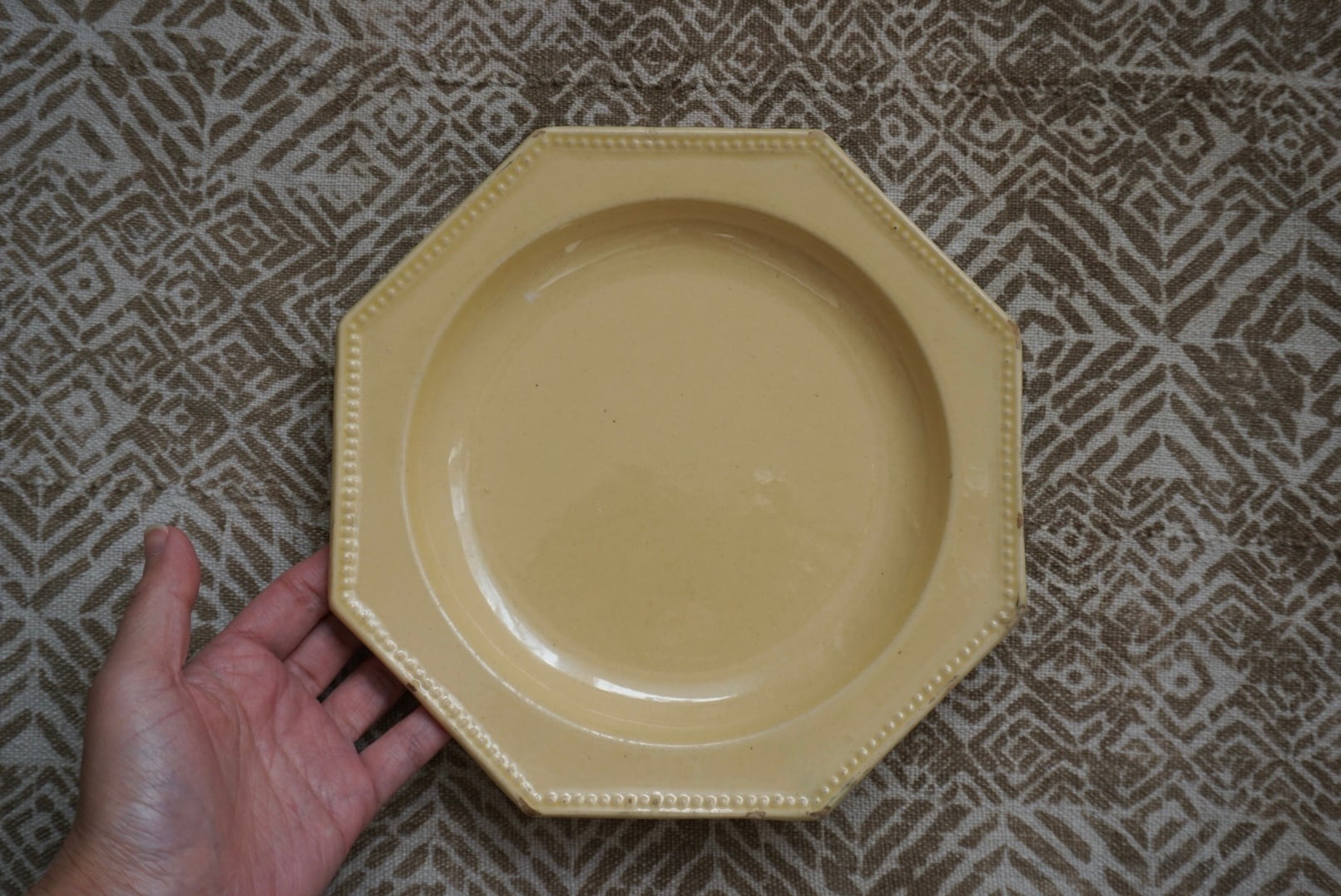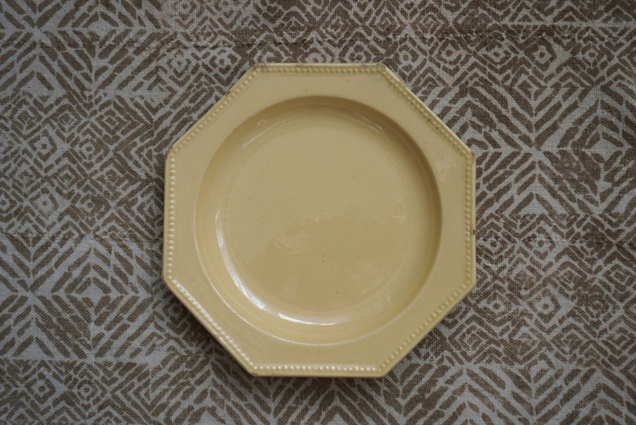 南フランスより、アプト焼きのオクトゴナルプレートです。南フランスには仕入れの際に何度か足を運んでいますが、そこに暮らす人々の大らかで優しい雰囲気をそのまま移したかのような柔らかい黄色の釉薬で、目に入る度に気持ちが晴れやかになります。深さもあり、汁気があるものをのせても◎
