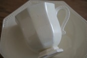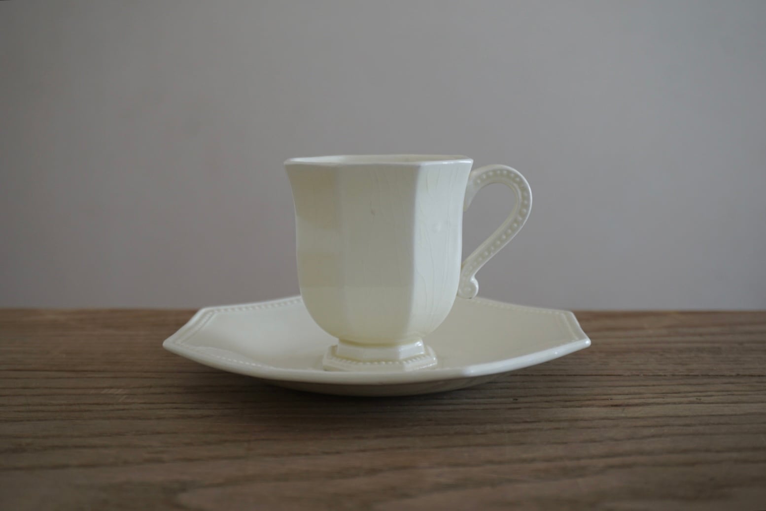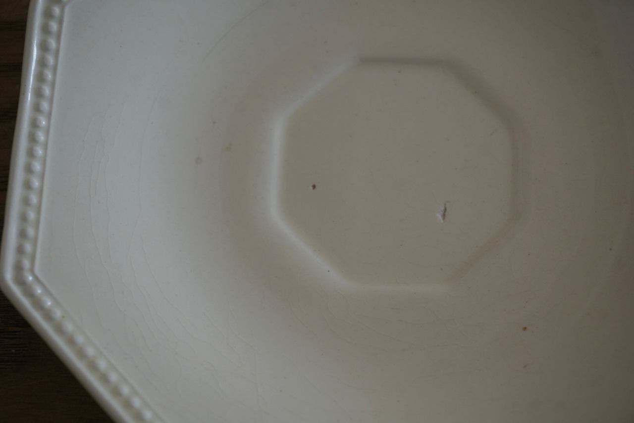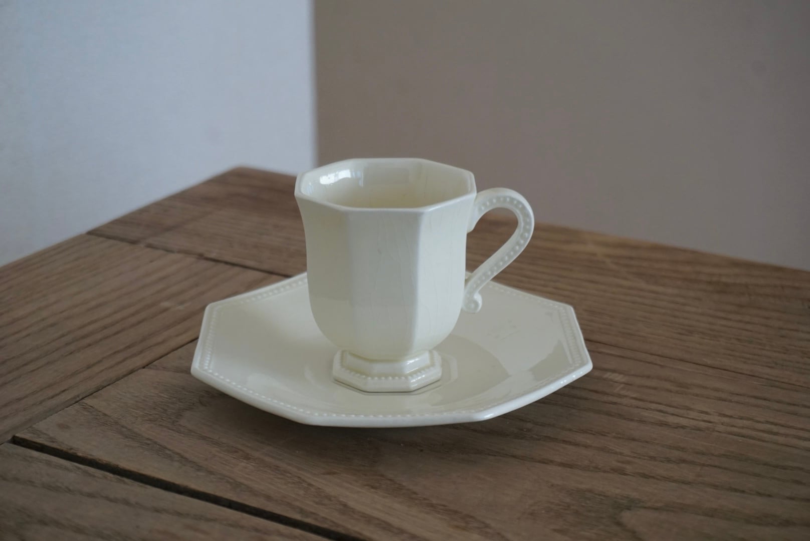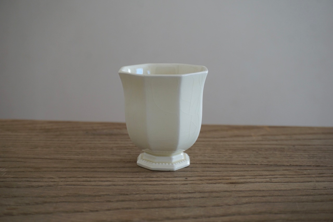 パリ近郊 Creil et Montereau窯より、オクトゴナルのカップ&ソーサーです。手にする度に光が当たった時の陰影がとても美しく、優雅で気品ある曲線美がとても計算されたシルエットだと感じます。デミタスサイズで少しずついただくお茶やコーヒーも、ゆっくりと時が流れて心落ち着くひと時となり、良いですよね。