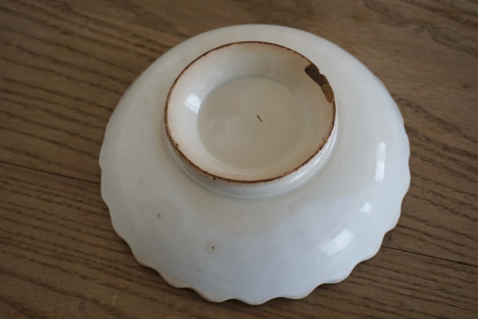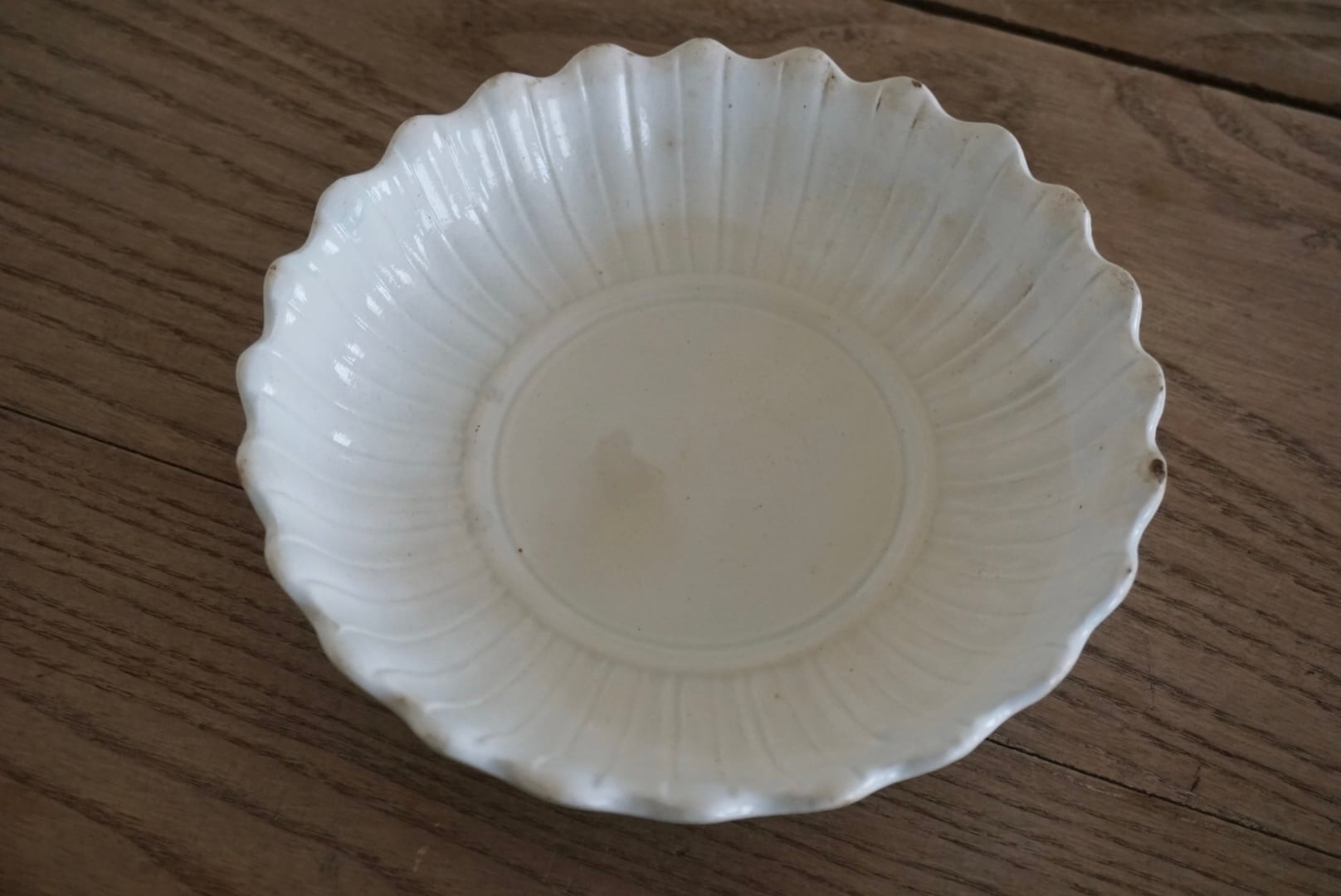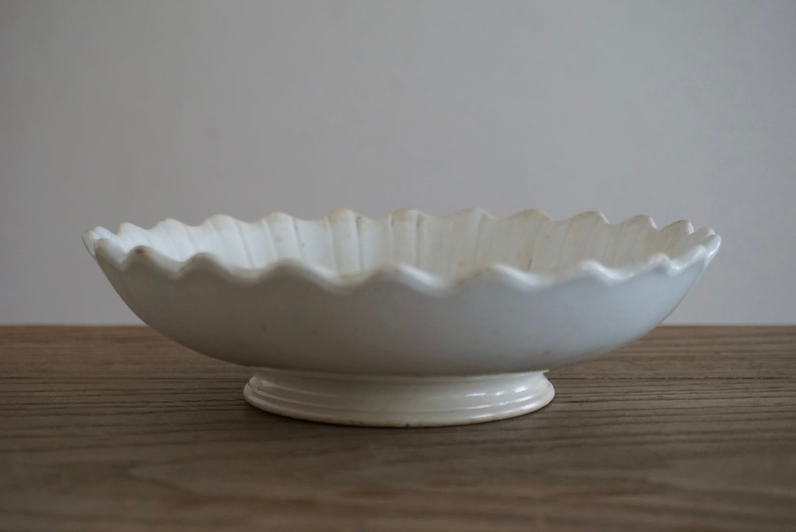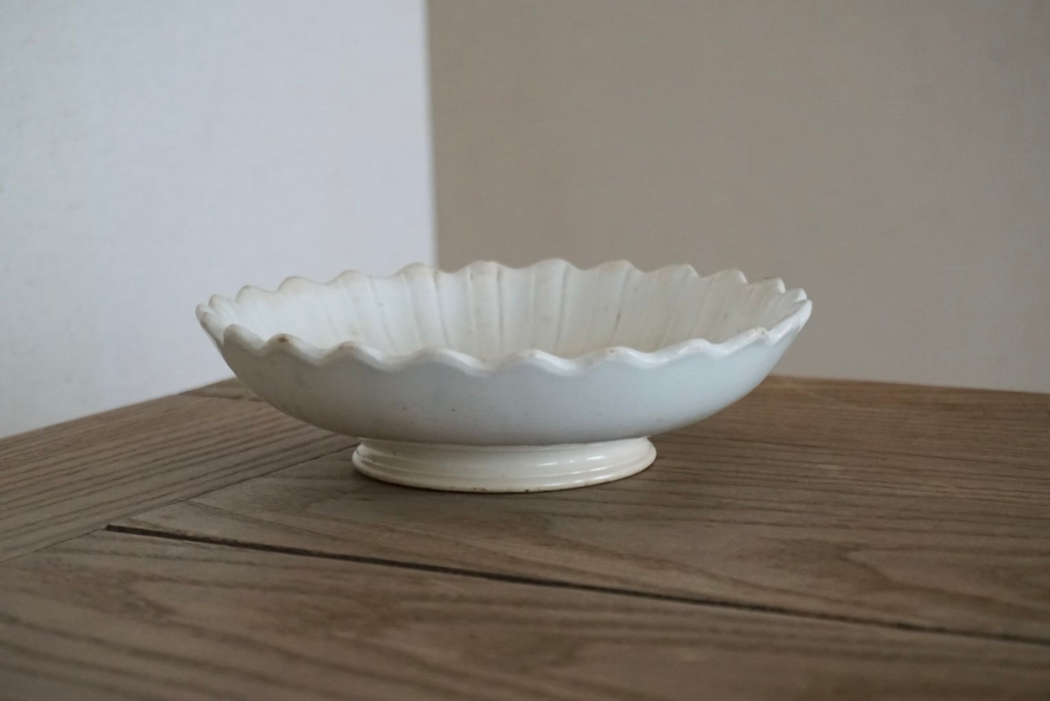 フランスで見つけた、とても良い雰囲気を纏った輪花鉢です。コンポティエのように少し高さがついていて、横から見た時に花が咲いているように見えるシルエットもとても美しいです。和骨董や和食との相性も抜群です。