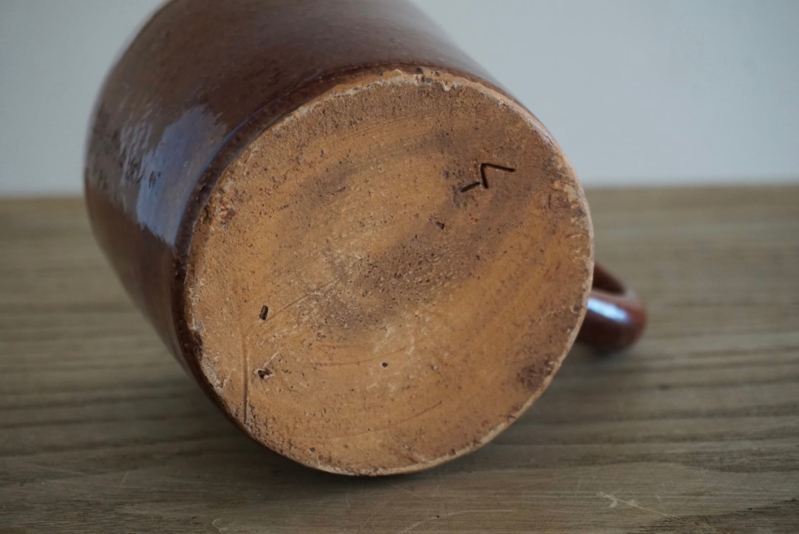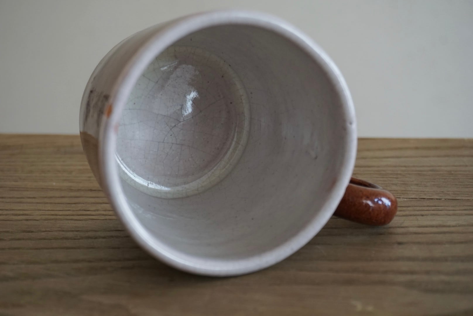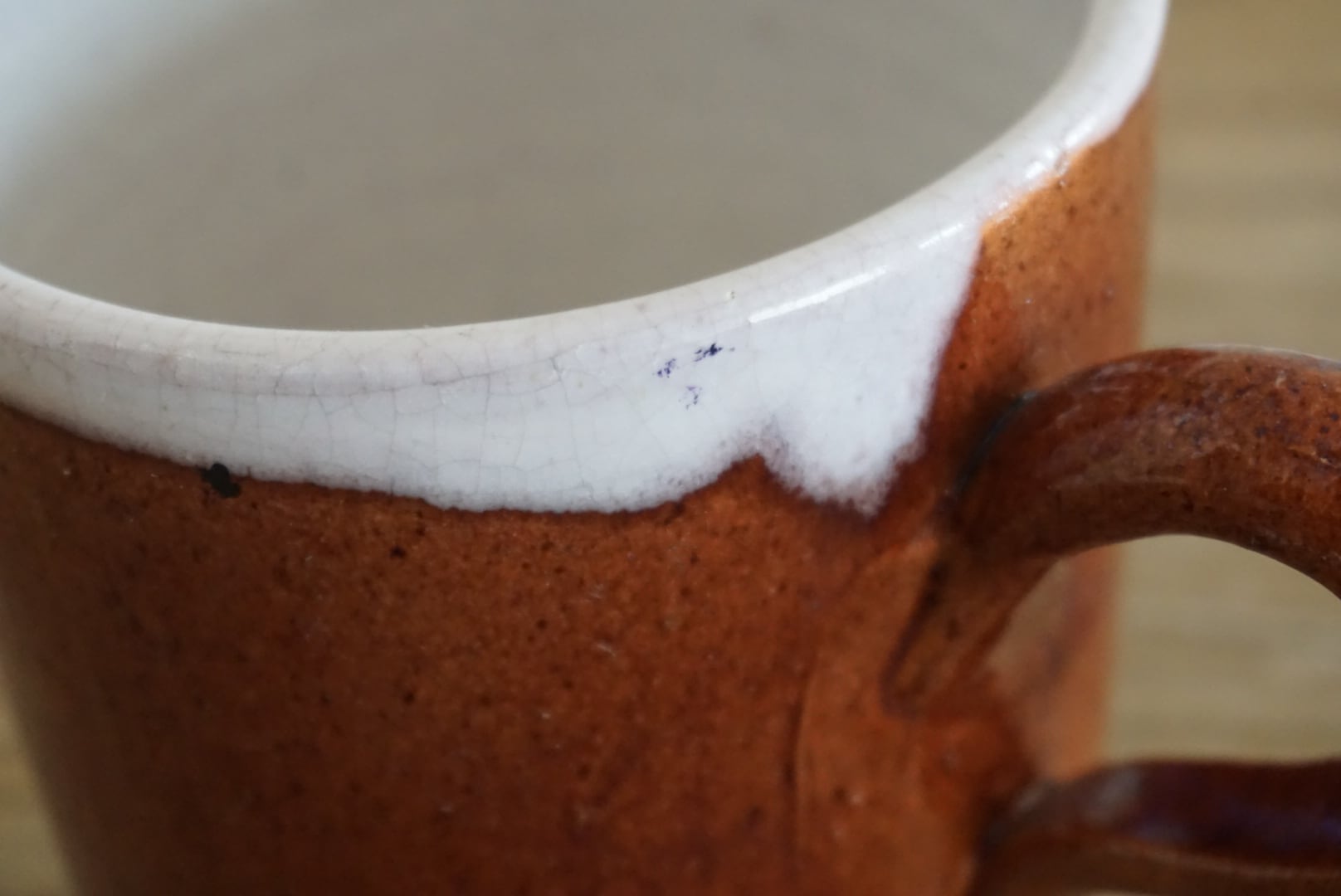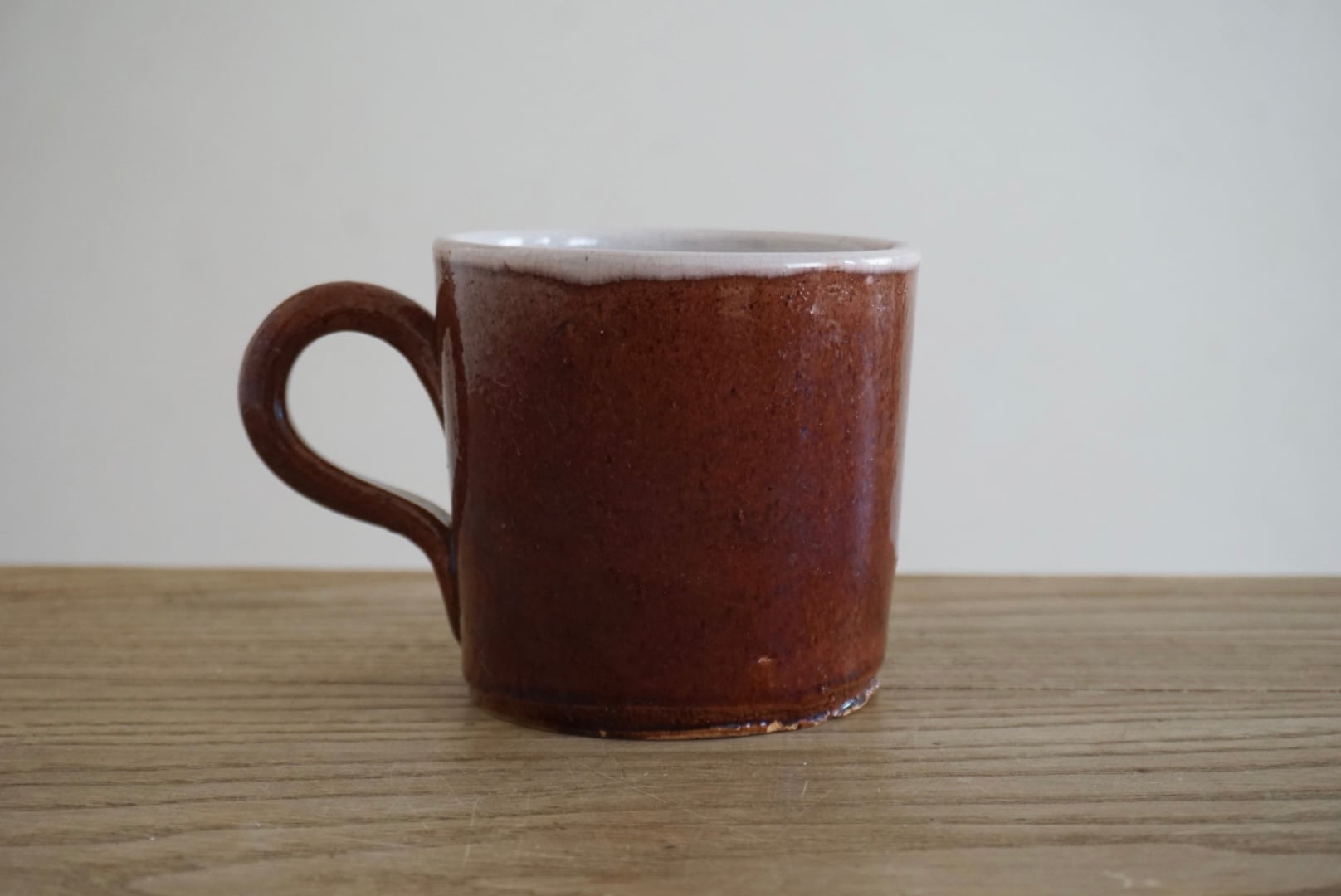 ノルマンディ地方発祥の民藝品、キュノワールの大きめマグカップです。スープがたっぷり飲めそうなサイズ感で、カトラリーやキッチンツールの収納にもぴったりです。キュノワールのマグに大きめのものが多いのは、計量カップとしての役割もあったからだと聞きました。農家のキッチンで活躍している姿を想像すると愛おしいですね。