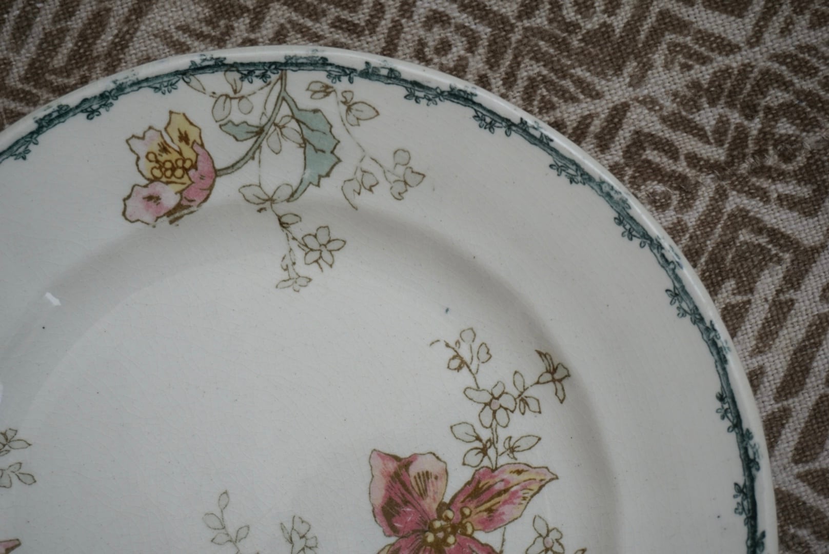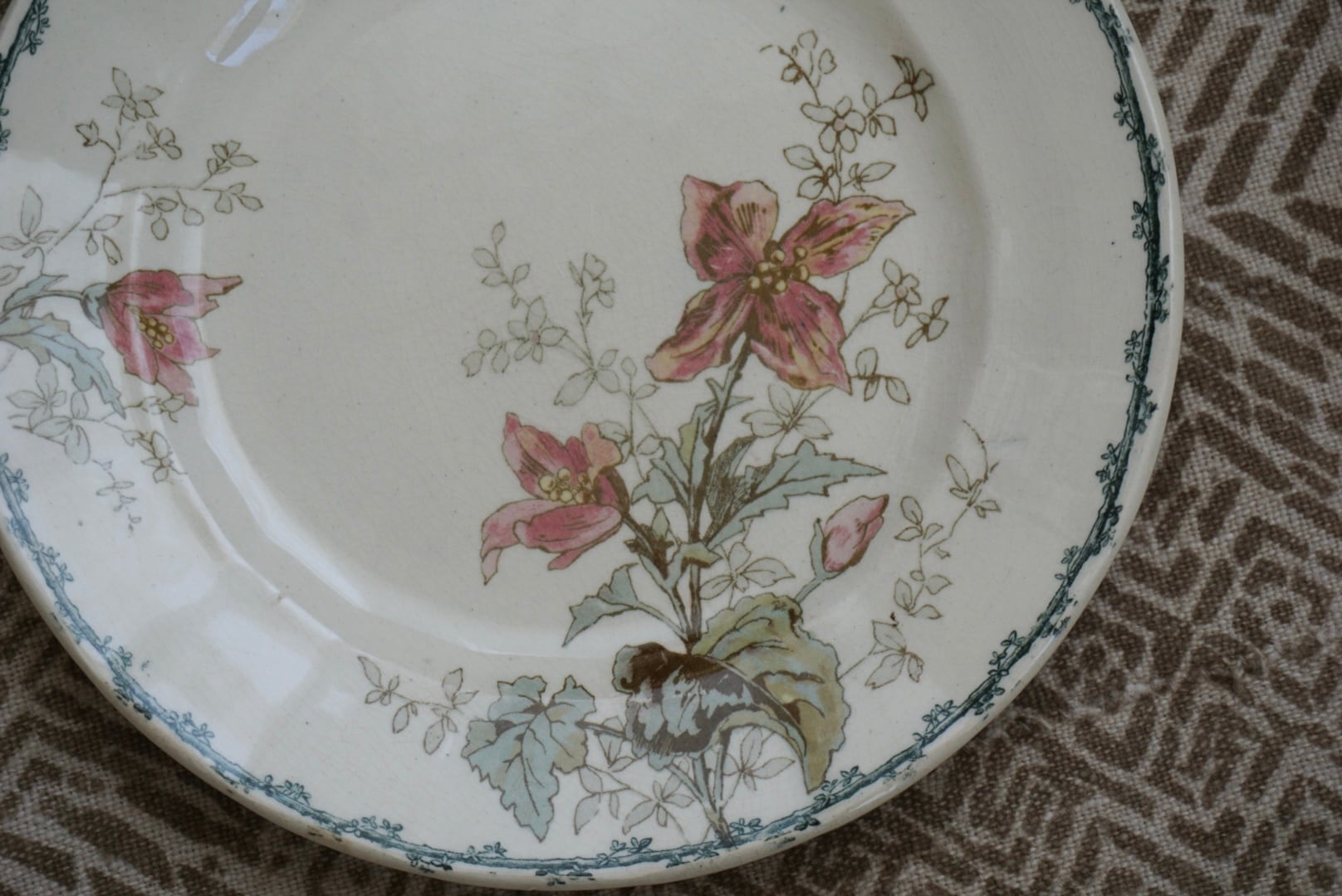 パリ近郊choisy le roi窯より、優雅にのびのびと描写された花々とハンドペイントで施された着色が美しいデザートプレートです。ひとつひとつ丁寧に施された手彩なので、色の濃淡が奥行きを深め、眺めていると実際に生き生きと花が咲いている情景がイメージでき、鳥の囀りや頬を撫でる風を感じられるような一品です。