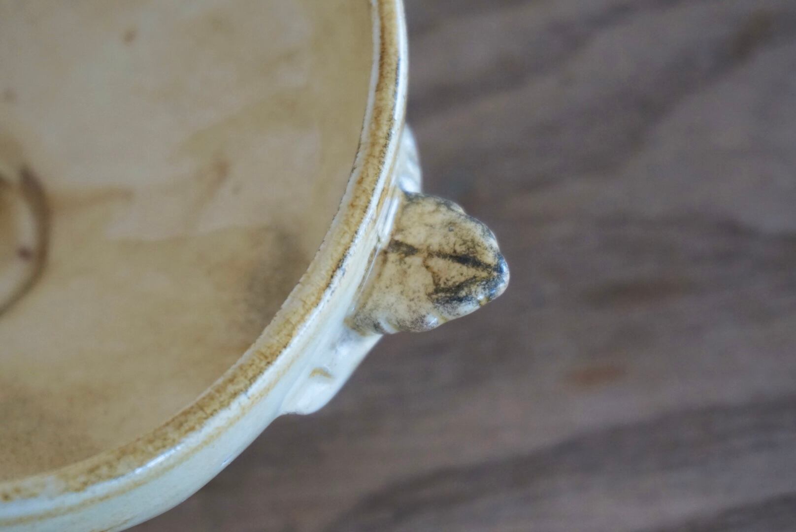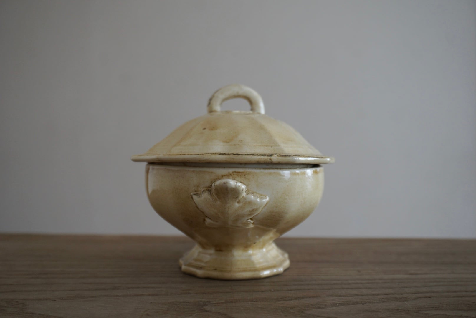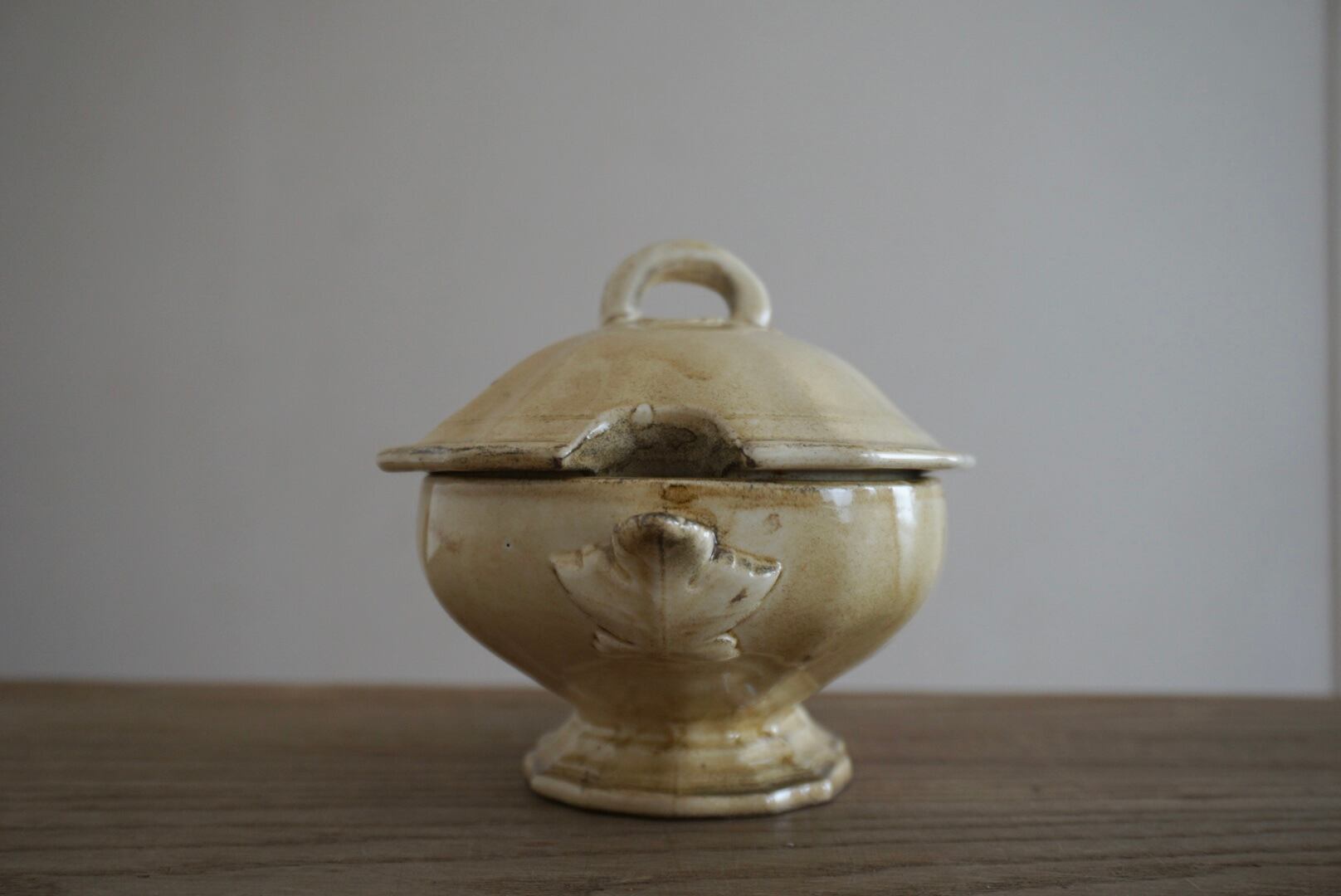 南フランスのものと思われるエレガントなソーシエールです。柔らかな黄釉と、時を経て作られたアンティークならではの風合いが唯一無二で美しいです。蓋まで状態良く残っているので、安心して実用いただけます。ポプリを入れるのに良いですね。