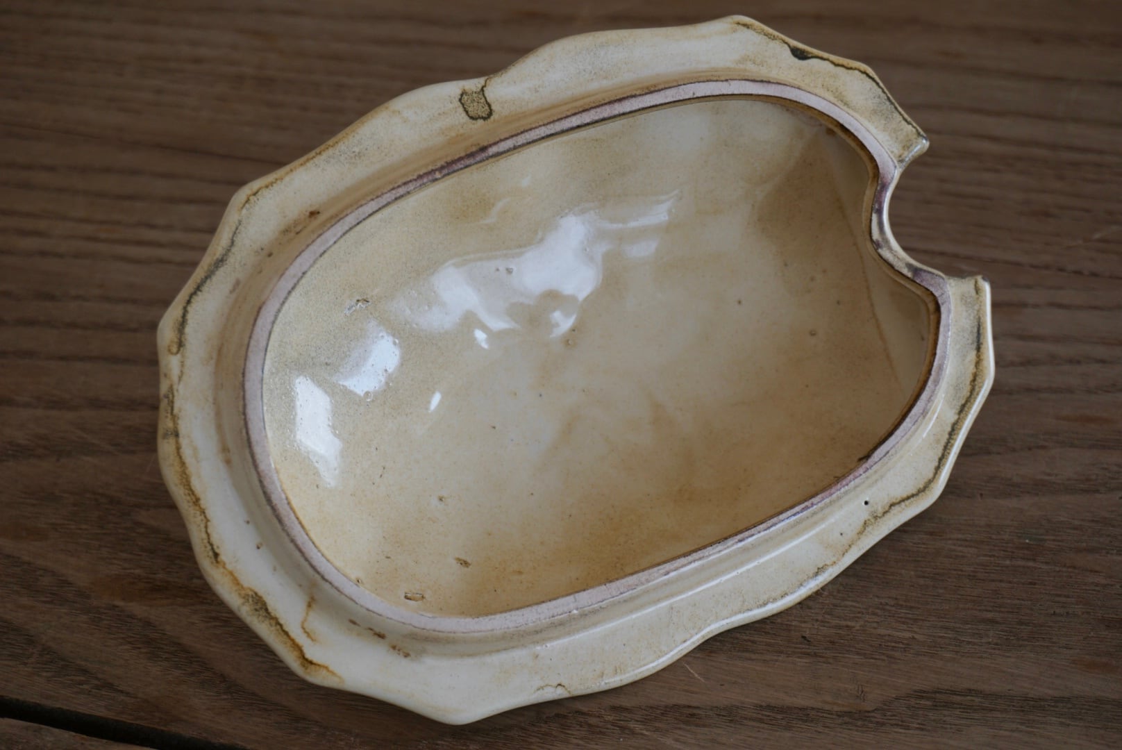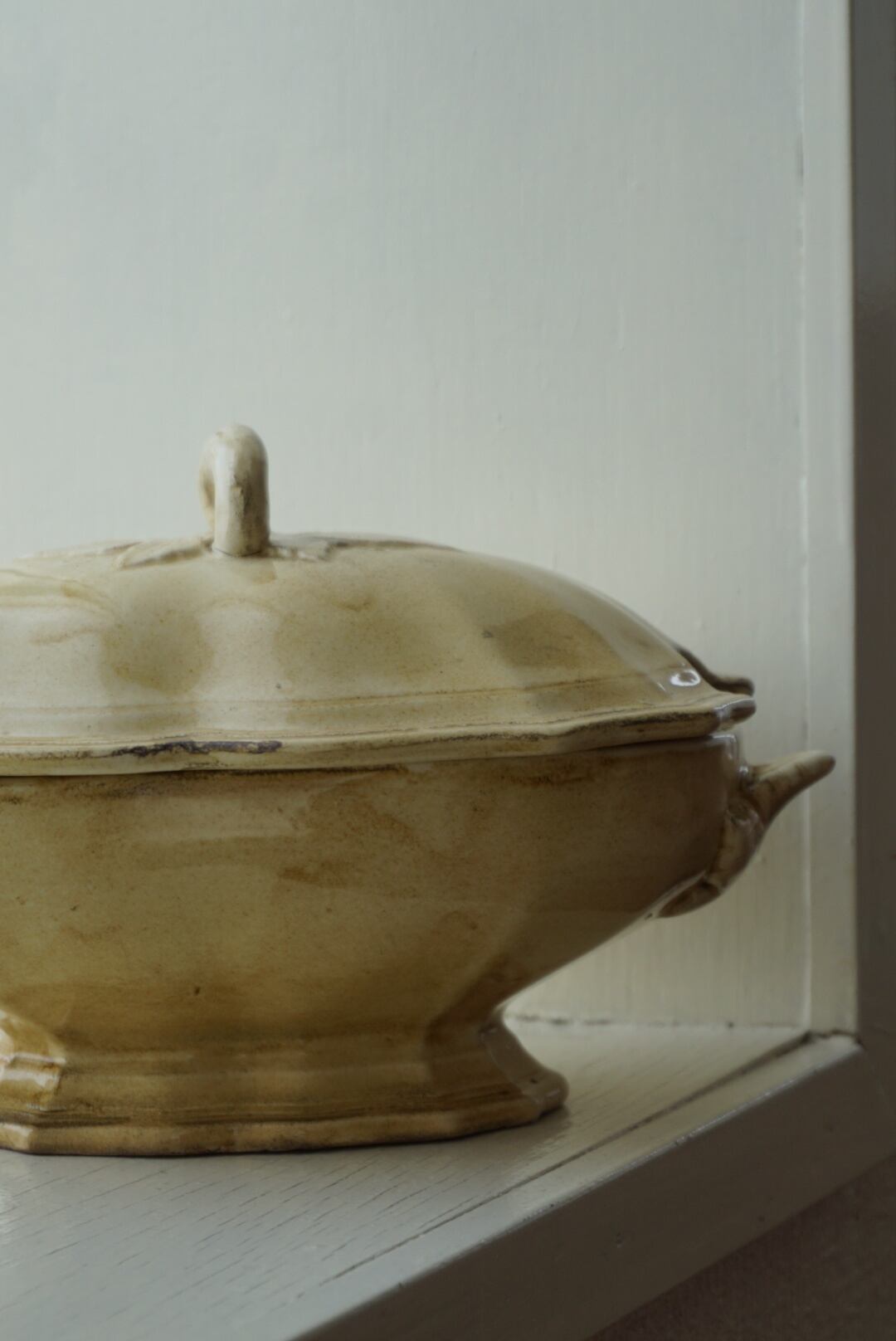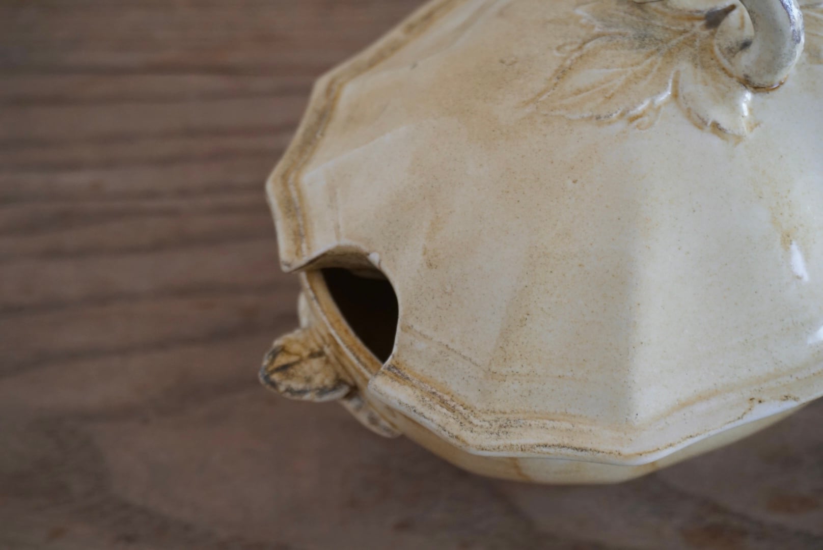 南フランスのものと思われるエレガントなソーシエールです。柔らかな黄釉と、時を経て作られたアンティークならではの風合いが唯一無二で美しいです。蓋まで状態良く残っているので、安心して実用いただけます。ポプリを入れるのに良いですね。