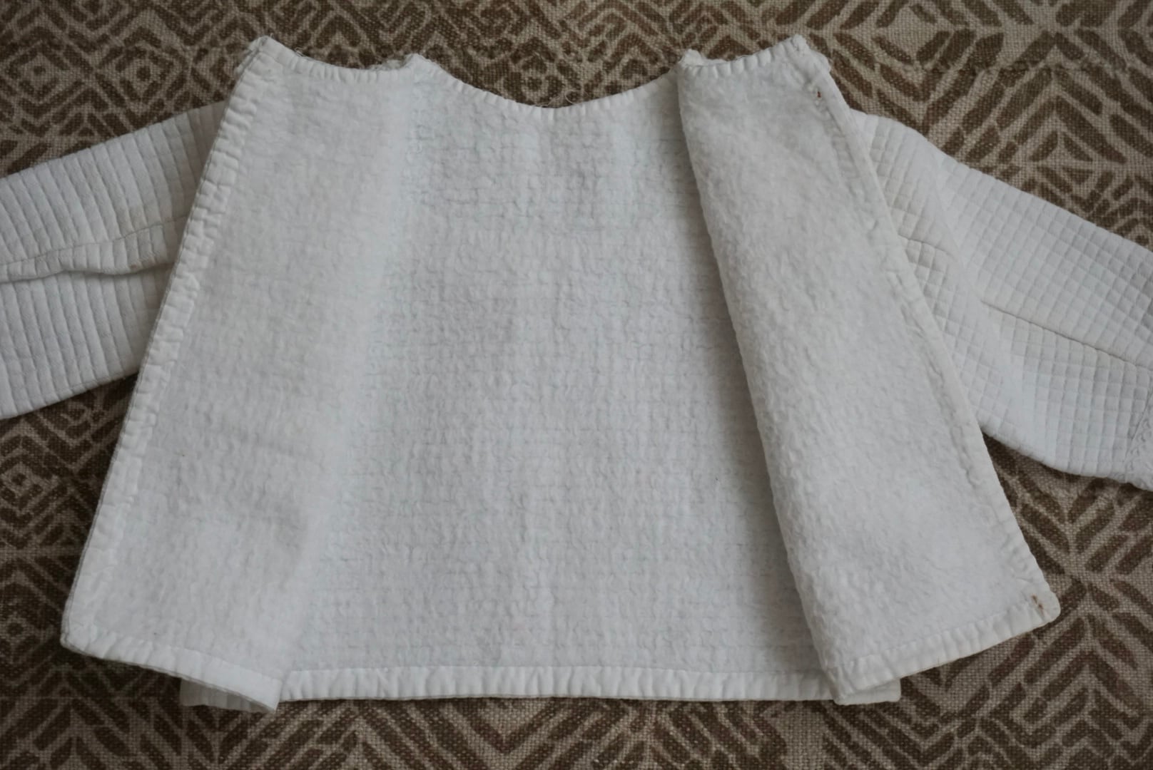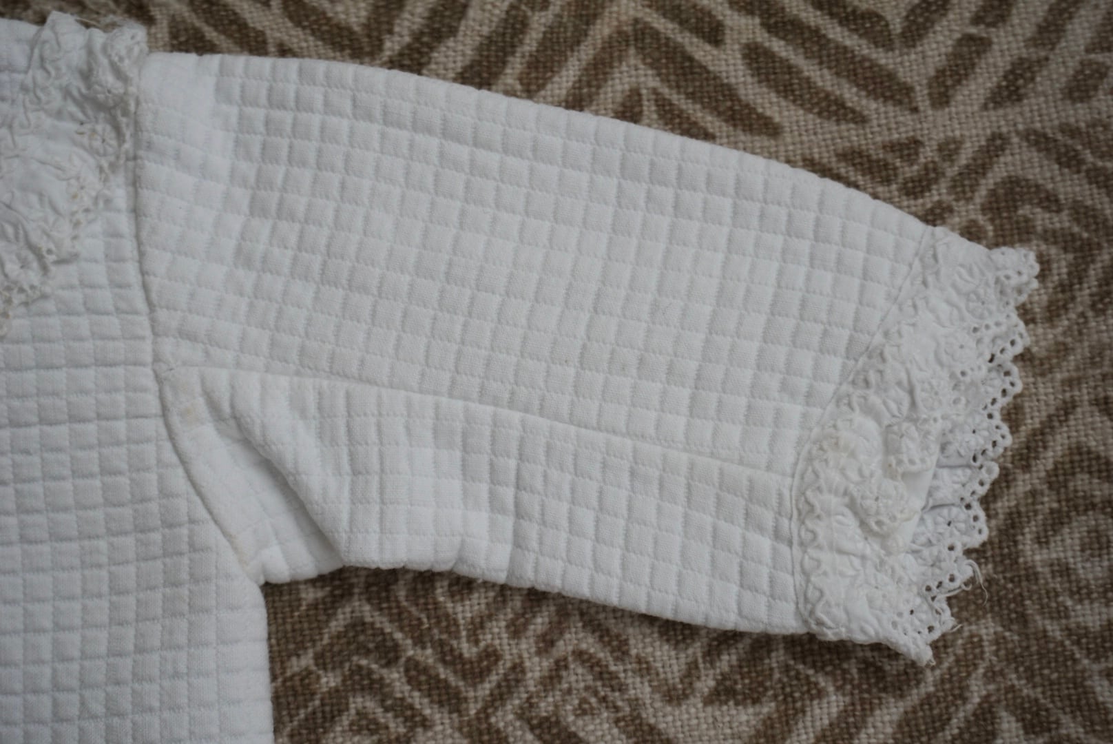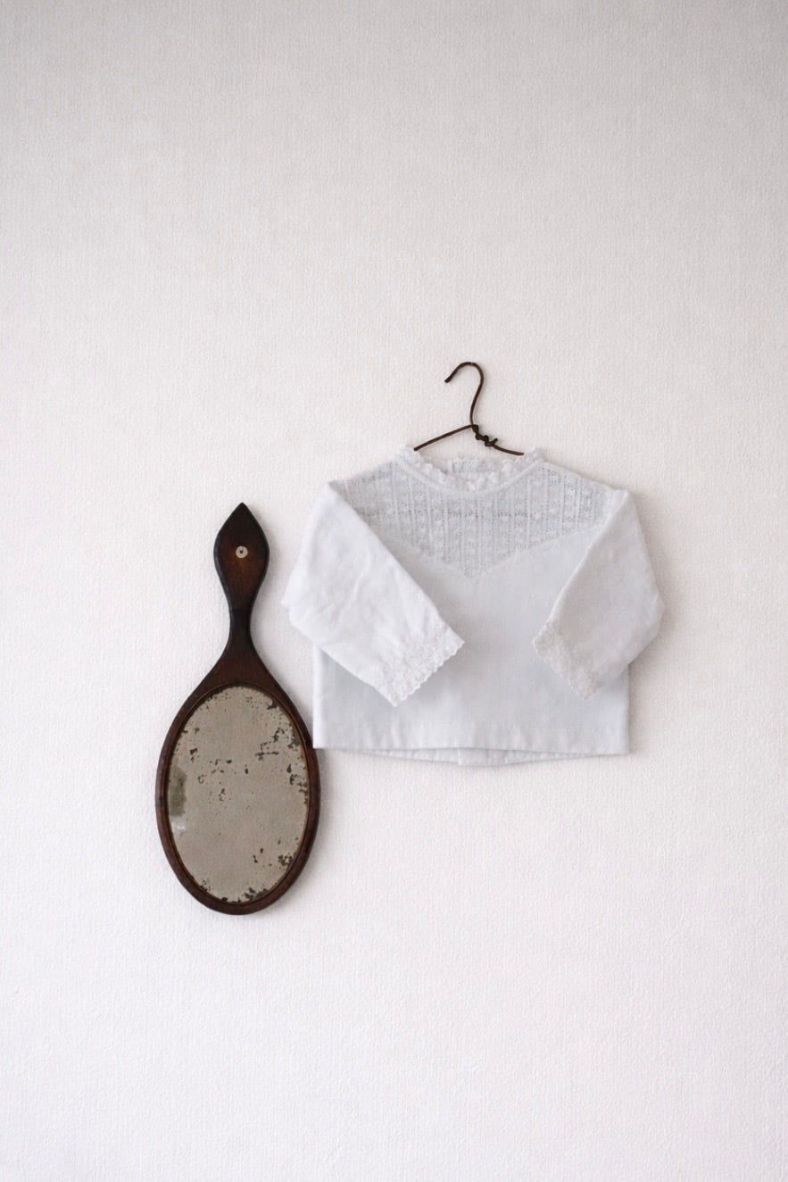 赤ちゃん用の小さなブラウスです。冬用なので生地が厚手で裏地が起毛しています。南フランスのモンペリエのお屋敷から出てきたそうで、その家の家主は医者だったそうです。ひとつひとつ丁寧に施された刺繍や上質な生地、繊細なレースから、子供たちはとても愛されていたことが伝わってきます。保管状態も良く、ぬいぐるみのお洋服に、撮影小物やディスプレイにもご使用いただけます。