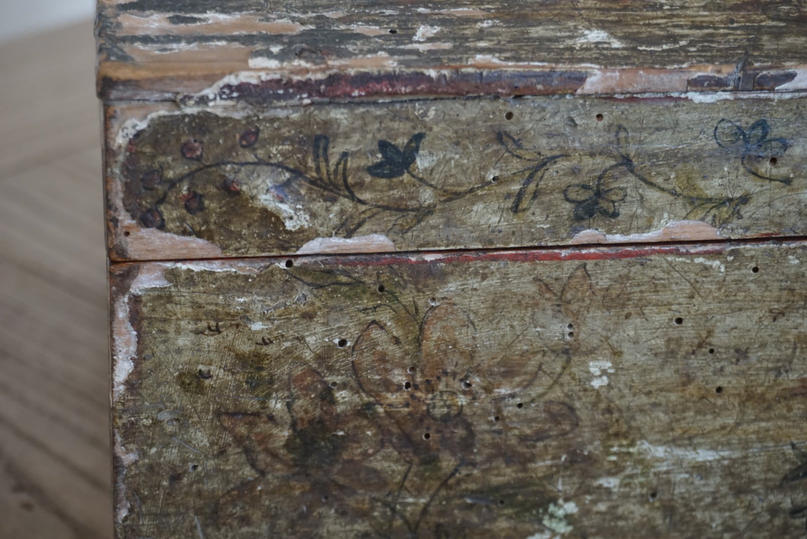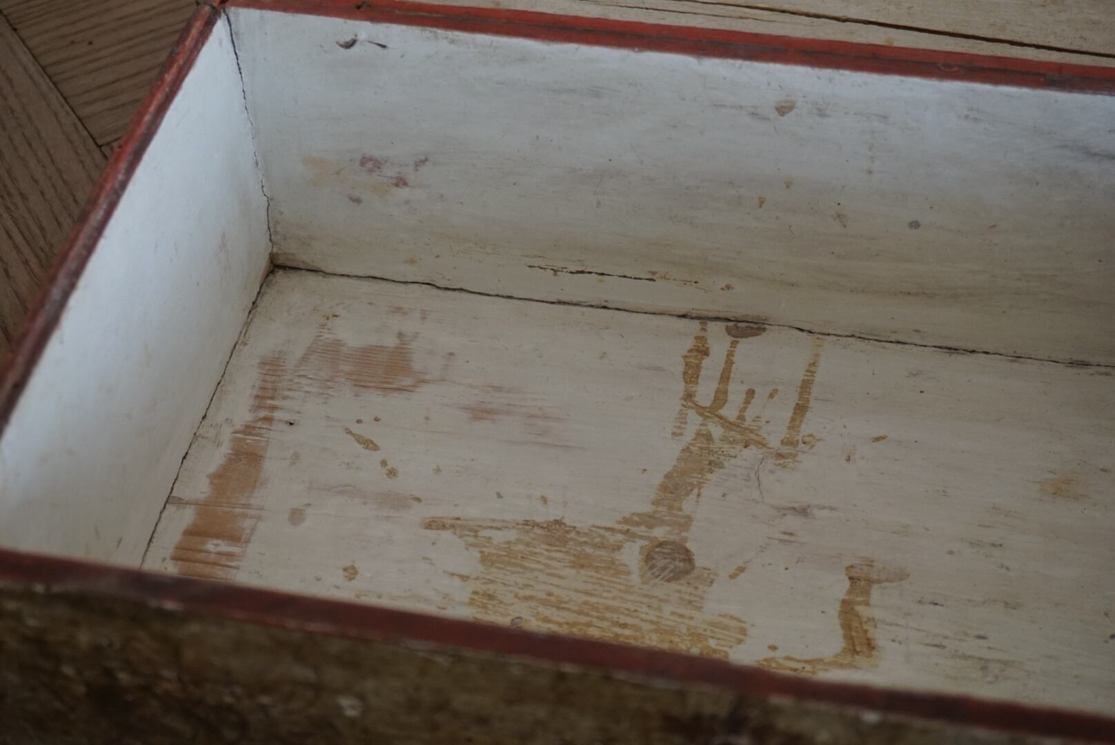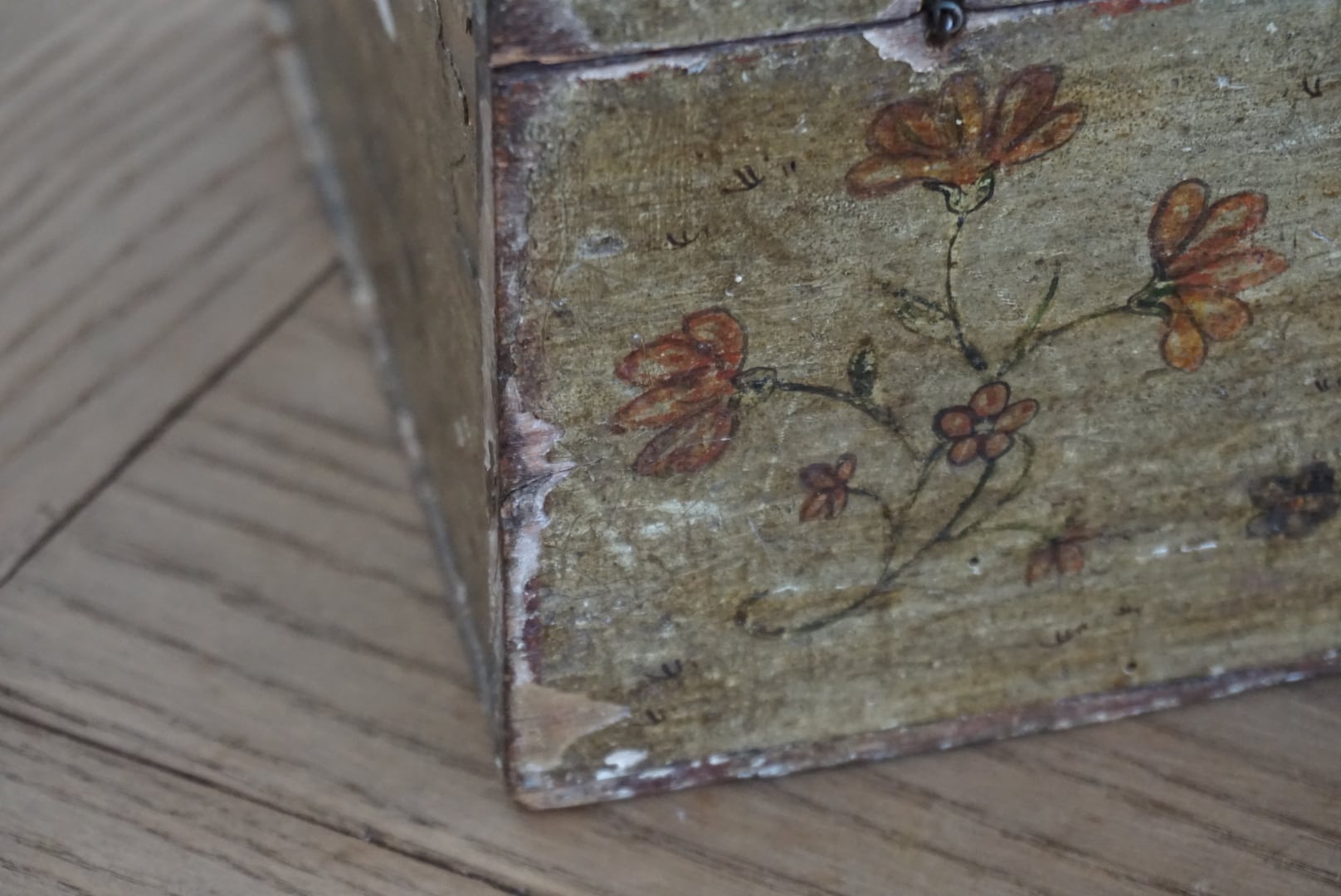 coffret de mariage(コフレ・ド・マリアージュ)と呼ばれる婚礼箱です。ノルマンディー地方の民藝品で、婚礼の際に夫となる男性から妻となる女性へ贈られました。小さなものには宝石や貴重品、大きなものにはリネンなどを入れ、嫁入り道具を持ち運ぶ際、または収納する為の箱として使用されました。